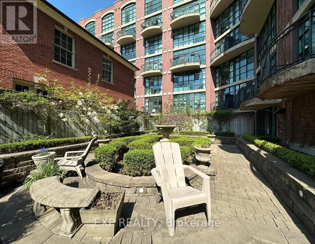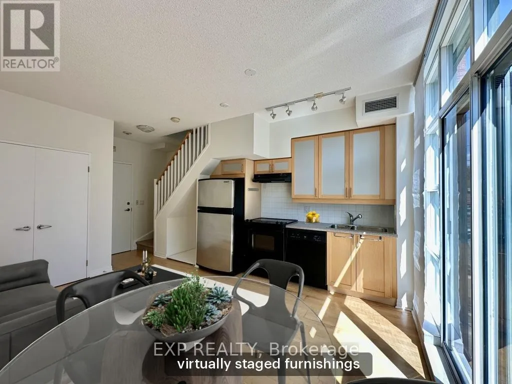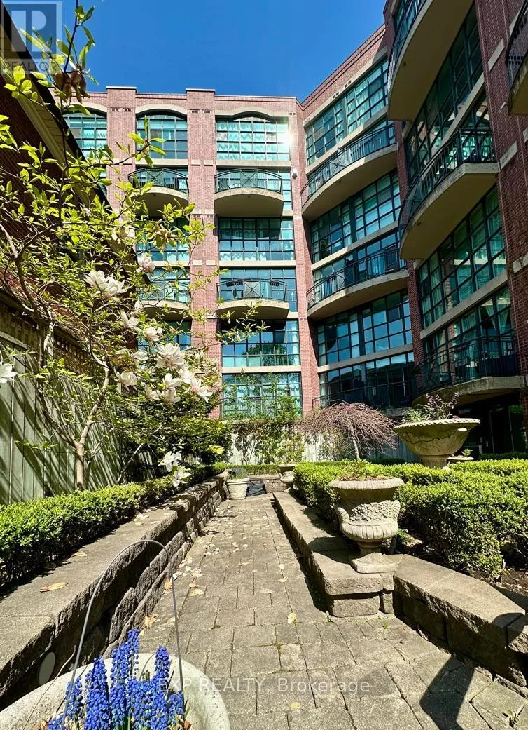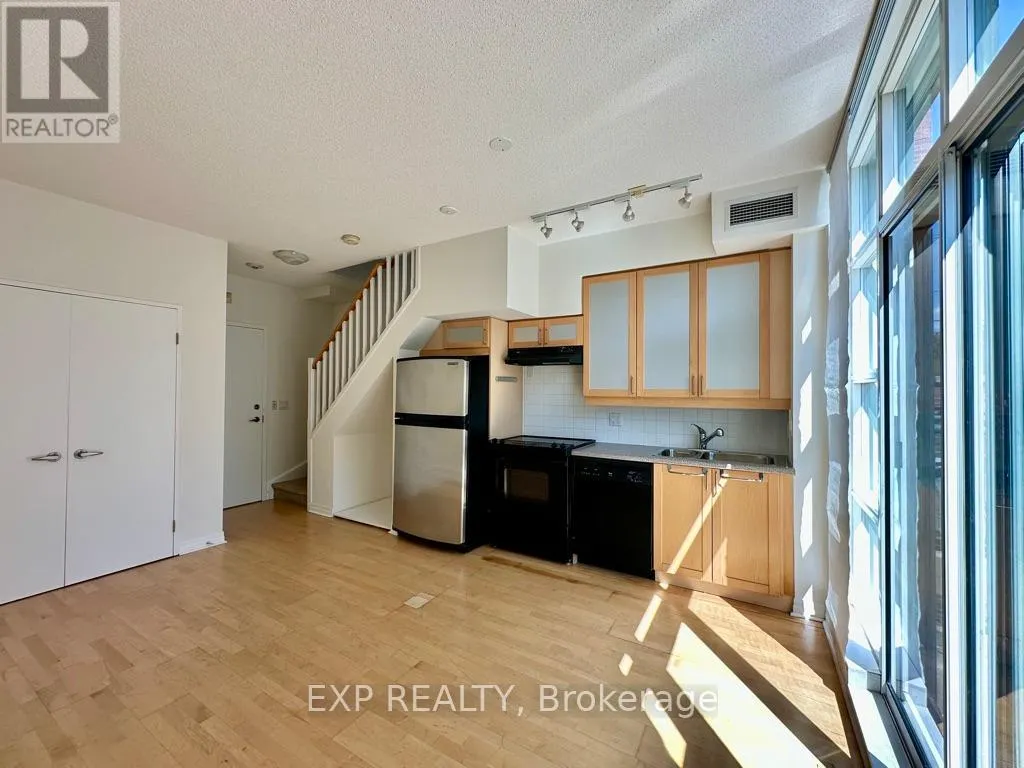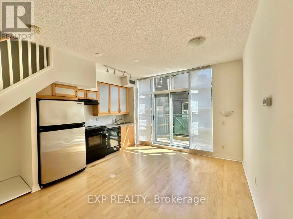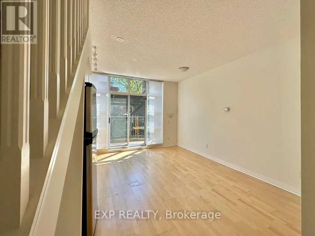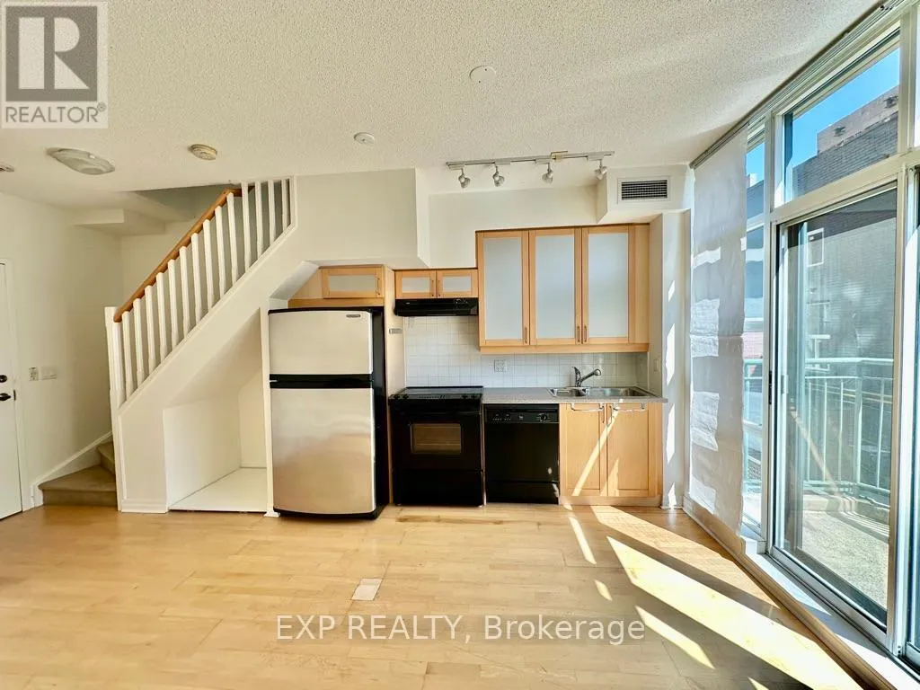 Queen St W & Strachan You've heard of the three rules of real estate? Location, location and location! Looking to live in Queen West, one of Toronto's most urbane neighbourhoods? Fronting onto Trinity Bellwoods Park is the boutique Trinity Park Lofts, much loved by its residents for its proximity to downtown, vibrant street life, shops, galleries and restaurants. Architecturally, Trinity Park Lofts takes its cues from the historic, prestigious Georgian estate next door, whose red brick and lush gardens it embraces respectfully. A tranquil, beautifully landscaped courtyard is yours to enjoy and entertain. Stepping into the main floor of this airy, light filled suite, you are greeted by floor to ceiling windows. The main level, with combined Living, Dining and Kitchen on a golden hardwood floor, leads to a curved balcony. Upstairs, is a large bedroom with 3 closets and a spacious 4 piece bathroom, with mirrored walls. (id:27476)