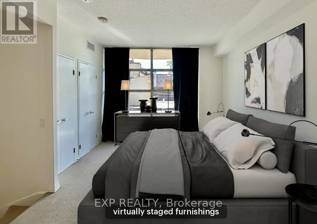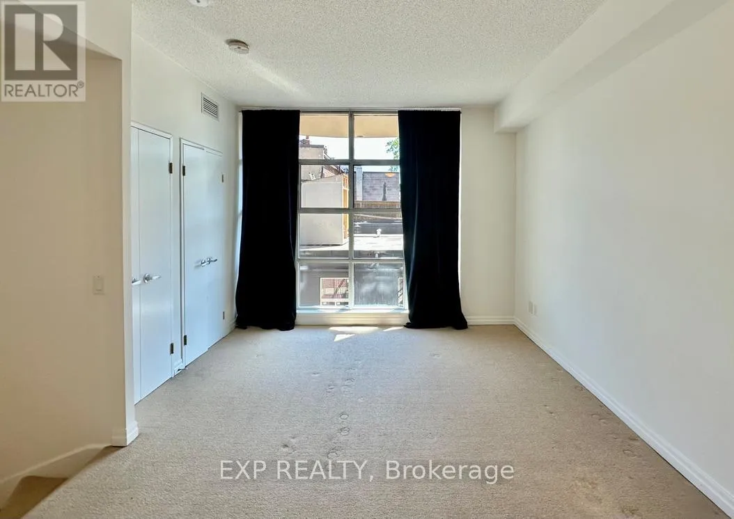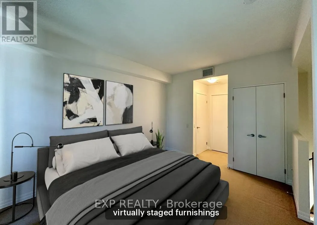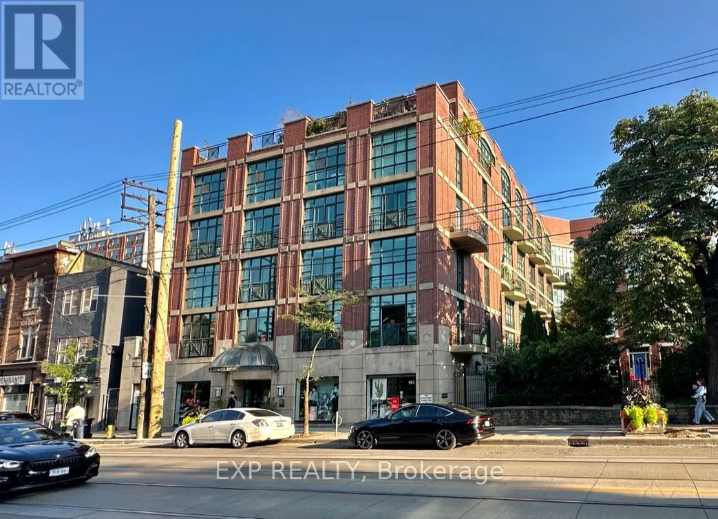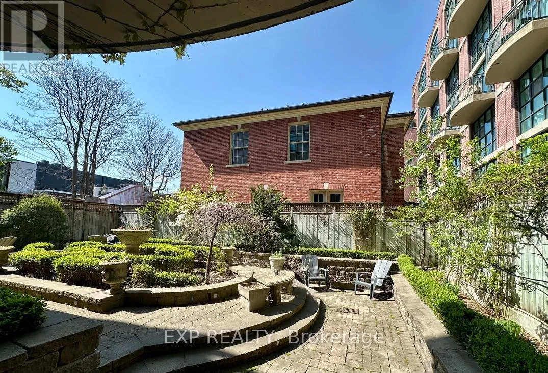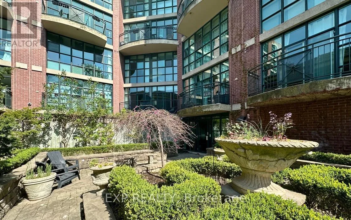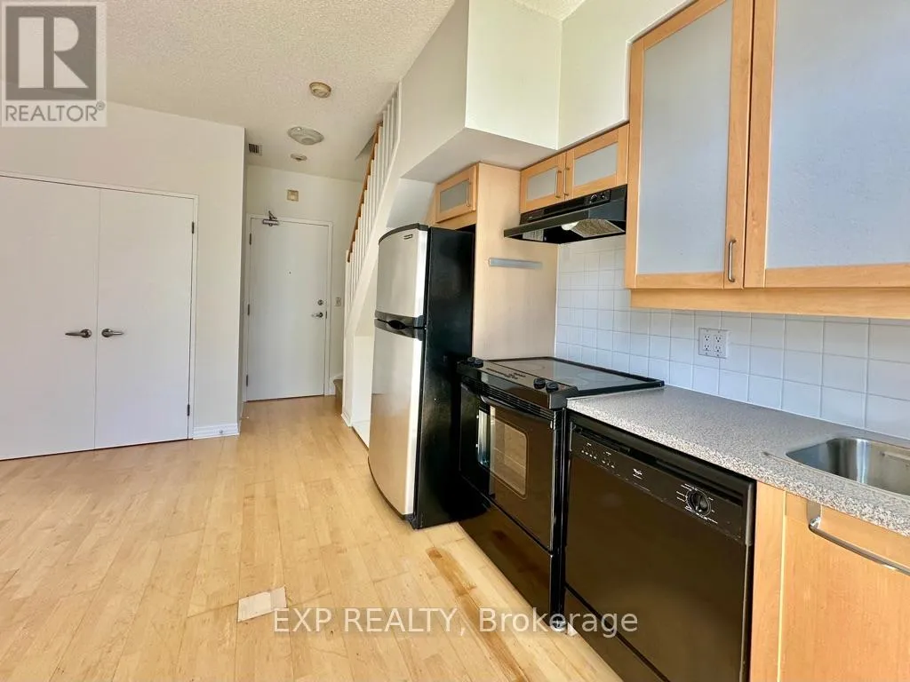 Queen St W & Strachan You've heard of the three rules of real estate? Location, location and location! Looking to live in Queen West, one of Toronto's most urbane neighbourhoods? Fronting onto Trinity Bellwoods Park is the boutique Trinity Park Lofts, much loved by its residents for its proximity to downtown, vibrant street life, shops, galleries and restaurants. Architecturally, Trinity Park Lofts takes its cues from the historic, prestigious Georgian estate next door, whose red brick and lush gardens it embraces respectfully. A tranquil, beautifully landscaped courtyard is yours to enjoy and entertain. Stepping into the main floor of this airy, light filled suite, you are greeted by floor to ceiling windows. The main level, with combined Living, Dining and Kitchen on a golden hardwood floor, leads to a curved balcony. Upstairs, is a large bedroom with 3 closets and a spacious 4 piece bathroom, with mirrored walls. (id:27476)