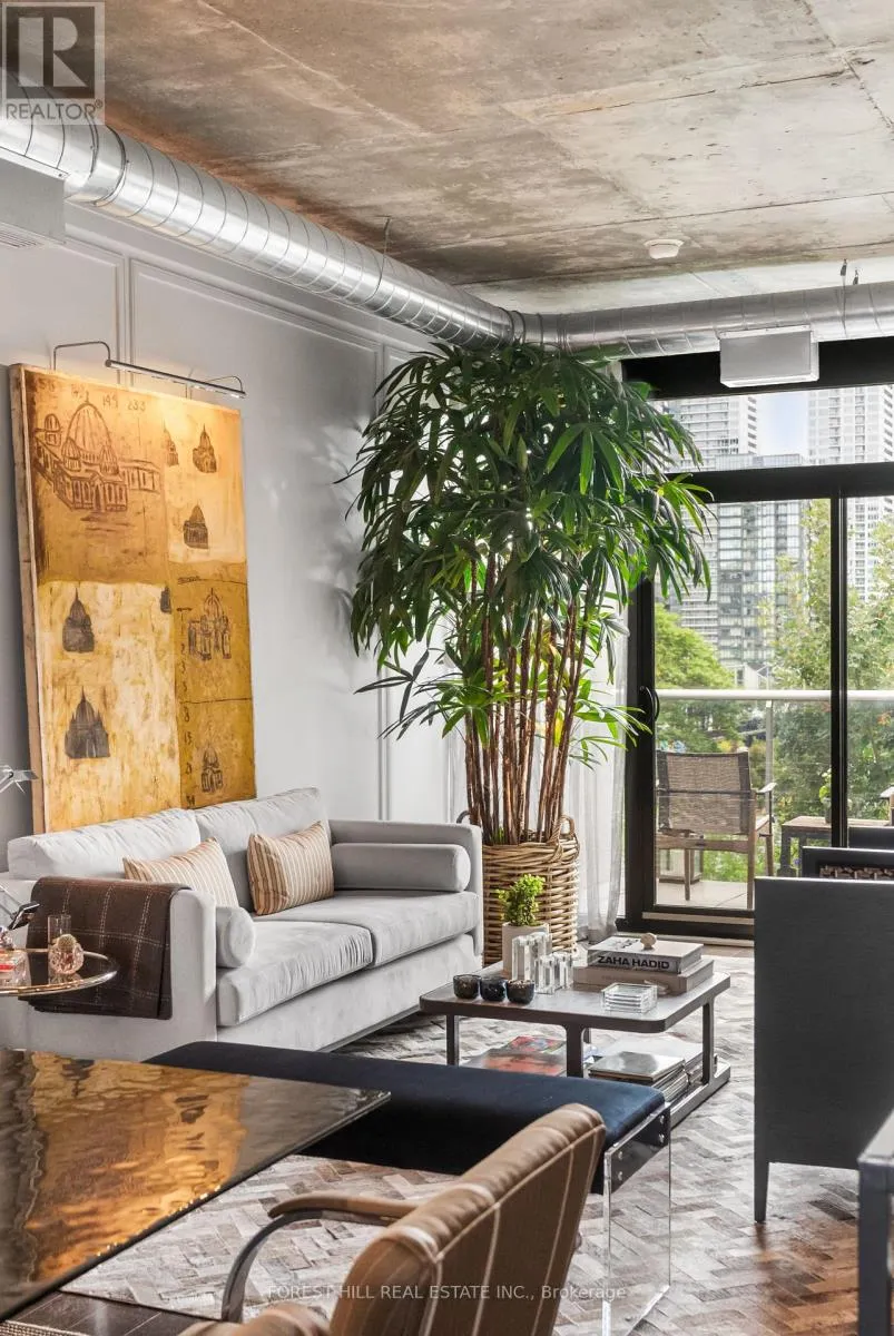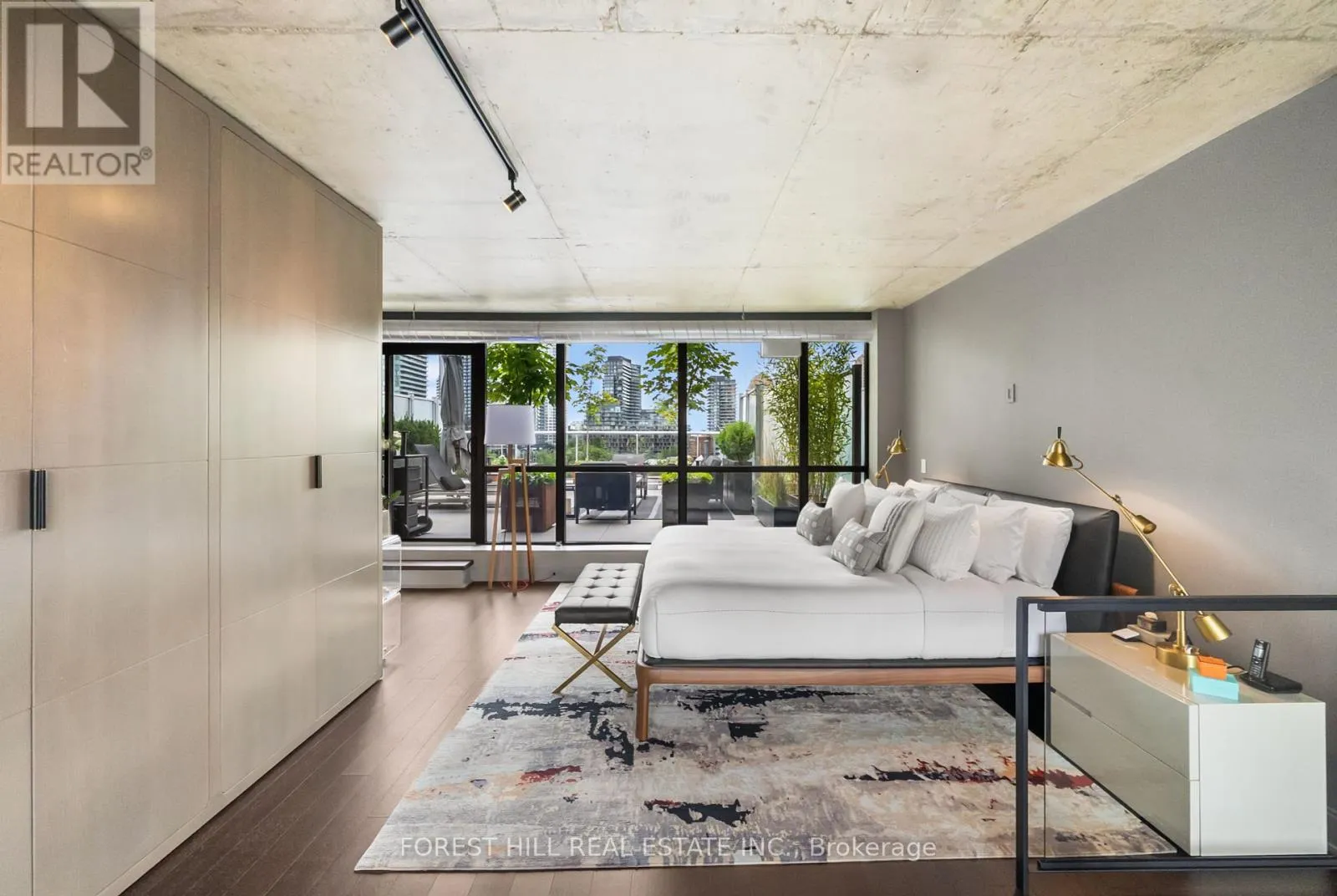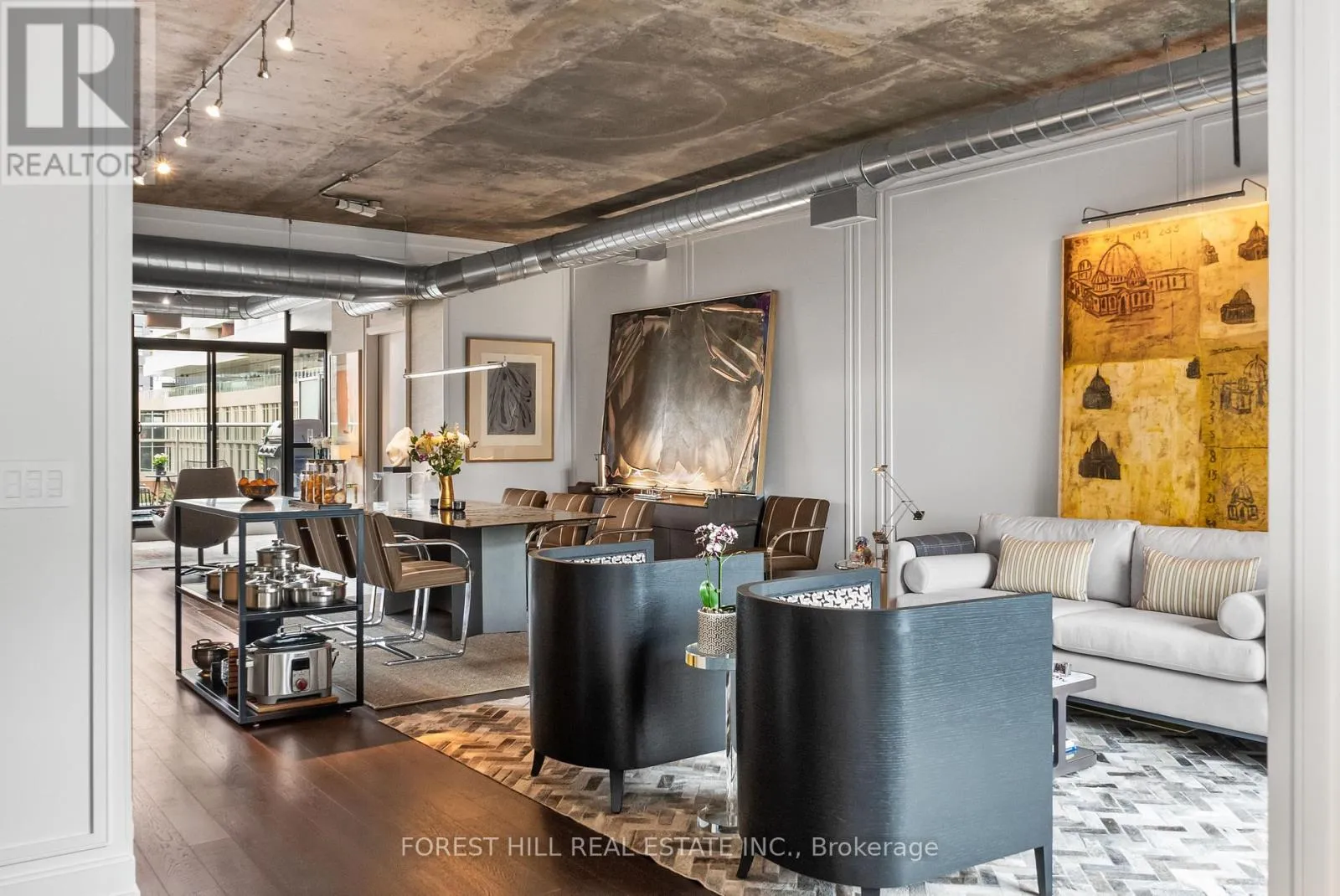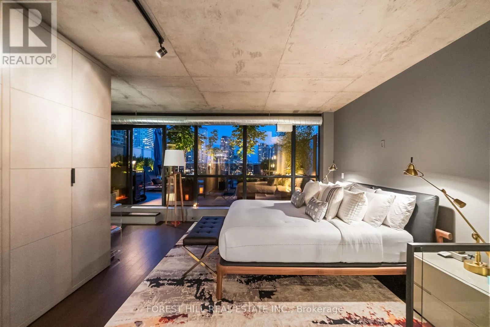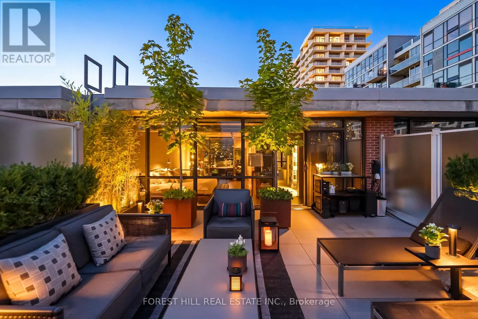 Cross Streets: King & Bathurst. ** Directions: -. Your King West dreams are made of this. Welcome to this bespoke two-storey penthouse, custom-designed and newly rebuilt from top to bottom. This designer's own residence offers over 2100 square feet of sophisticated interior and exterior loft-style living space in the heart of Toronto's vibrant King West neighbourhood. Located in a discreet 6-storey boutique building with only two units per floor on a quiet, tree-lined street, this extraordinary penthouse seamlessly blends industrial loft charm with luxuriously refined designer finishes. Not just one, but three private north and south-facing landscaped terraces totalling 610 square feet of sophisticated outdoor living space are perfect for entertaining or enjoying quiet moments overlooking the city skyline. The south-facing living room features exposed concrete ceilings and ductwork juxtaposed with custom Brenlo mouldings and walks out to a terrace with an unobstructed south view over treetops. The kitchen features brand new Miele appliances, while the adjacent dining room comfortably seats 8 guests. The family room steps out onto a gorgeous northwest-facing terrace with a BBQ gas line, dining area, and Veradek planters with integrated lighting. Walk up to the extraordinary second-floor retreat, a true lifestyle experience. Featuring unobstructed north and south-facing windows, custom white oak millwork in the primary bedroom, and a 5-star ensuite with a steam room, spa shower, freestanding tub, and custom gold-plated fixtures. The crown jewel is the remarkable south-facing rooftop terrace, perfect for summer entertaining and fully landscaped with Veradek and corten steel backlit planters, a 6-zone custom irrigation system and large-format porcelain tiles. Ideally located within easy walking distance to the best of King Wests world class amenities, including restaurants, bars, The Well, Billy Bishop Airport, and the Stackt Market, this penthouse offers a refined lifestyle in the heart of the city. (id:27476)