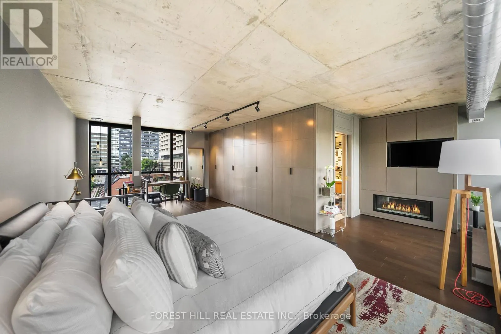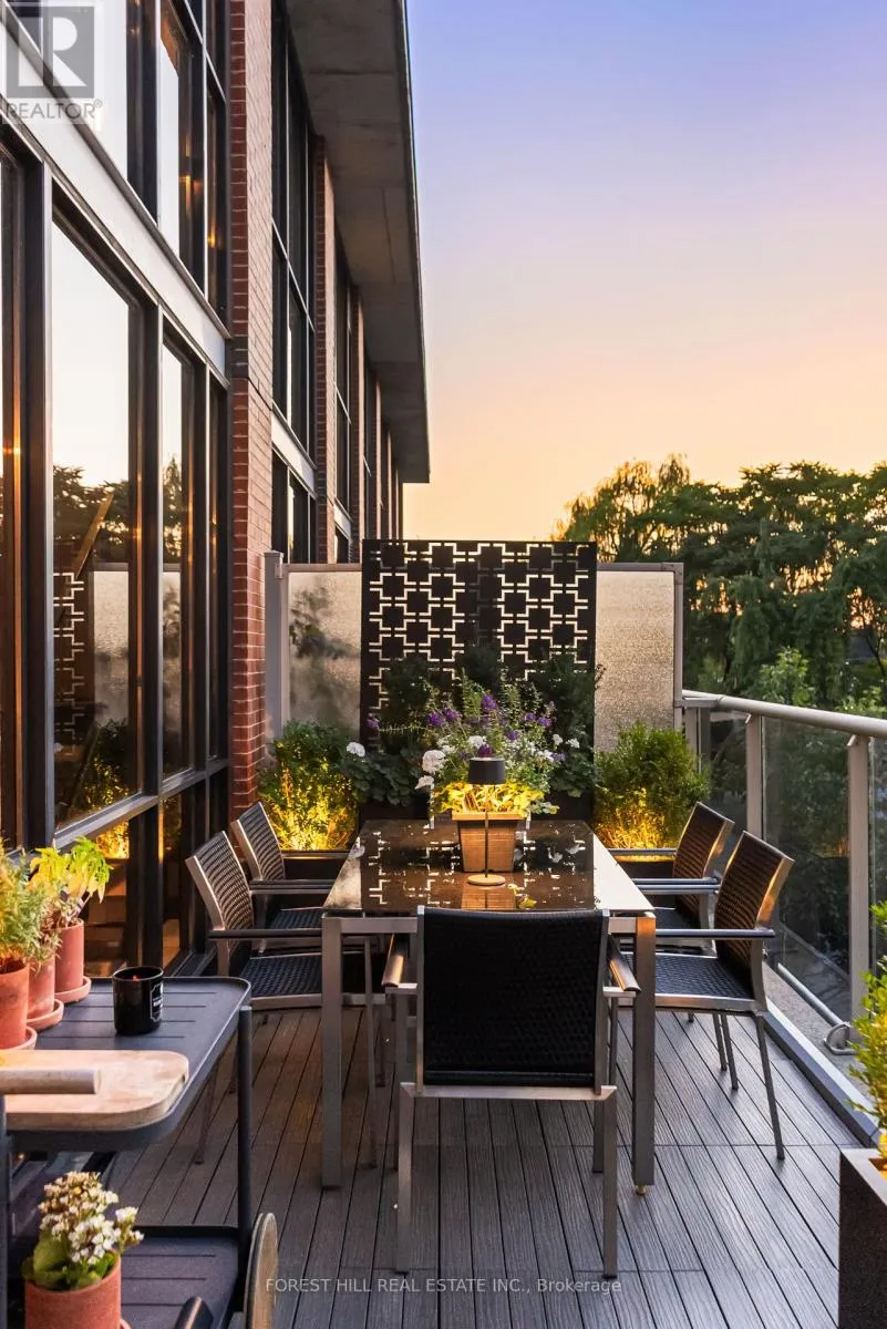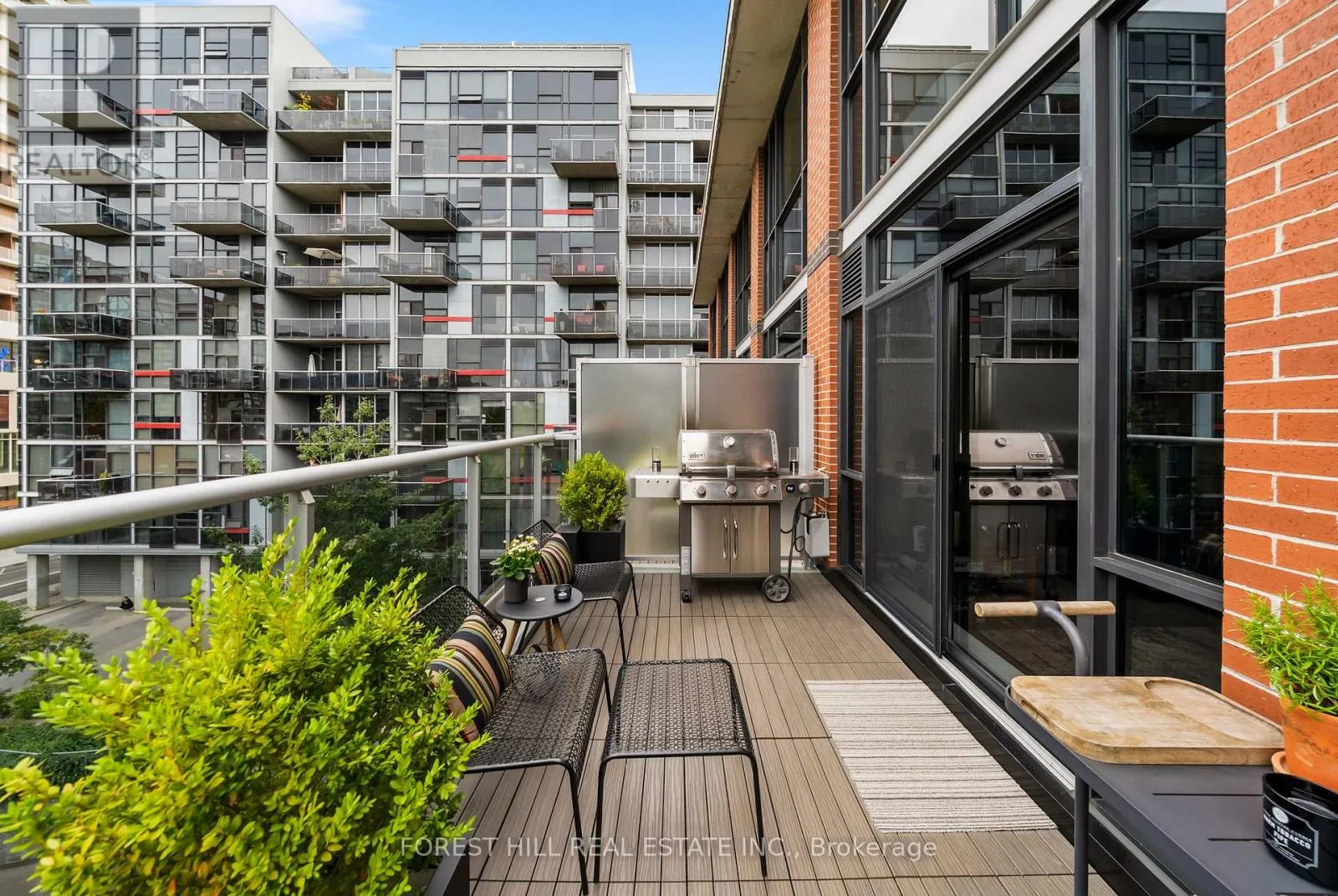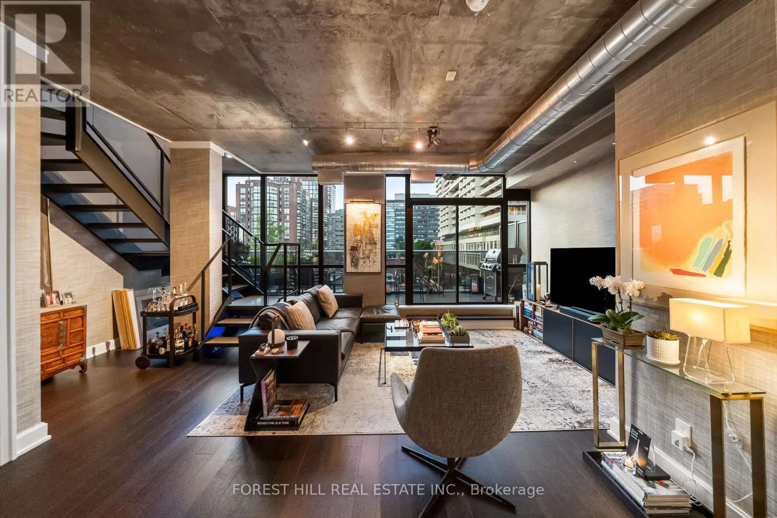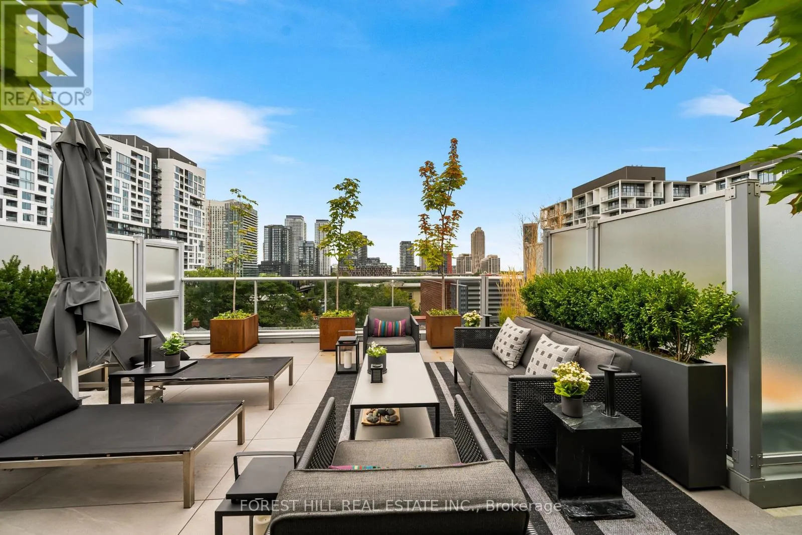 Cross Streets: King & Bathurst. ** Directions: -. Your King West dreams are made of this. Welcome to this bespoke two-storey penthouse, custom-designed and newly rebuilt from top to bottom. This designer's own residence offers over 2100 square feet of sophisticated interior and exterior loft-style living space in the heart of Toronto's vibrant King West neighbourhood. Located in a discreet 6-storey boutique building with only two units per floor on a quiet, tree-lined street, this extraordinary penthouse seamlessly blends industrial loft charm with luxuriously refined designer finishes. Not just one, but three private north and south-facing landscaped terraces totalling 610 square feet of sophisticated outdoor living space are perfect for entertaining or enjoying quiet moments overlooking the city skyline. The south-facing living room features exposed concrete ceilings and ductwork juxtaposed with custom Brenlo mouldings and walks out to a terrace with an unobstructed south view over treetops. The kitchen features brand new Miele appliances, while the adjacent dining room comfortably seats 8 guests. The family room steps out onto a gorgeous northwest-facing terrace with a BBQ gas line, dining area, and Veradek planters with integrated lighting. Walk up to the extraordinary second-floor retreat, a true lifestyle experience. Featuring unobstructed north and south-facing windows, custom white oak millwork in the primary bedroom, and a 5-star ensuite with a steam room, spa shower, freestanding tub, and custom gold-plated fixtures. The crown jewel is the remarkable south-facing rooftop terrace, perfect for summer entertaining and fully landscaped with Veradek and corten steel backlit planters, a 6-zone custom irrigation system and large-format porcelain tiles. Ideally located within easy walking distance to the best of King Wests world class amenities, including restaurants, bars, The Well, Billy Bishop Airport, and the Stackt Market, this penthouse offers a refined lifestyle in the heart of the city. (id:27476)