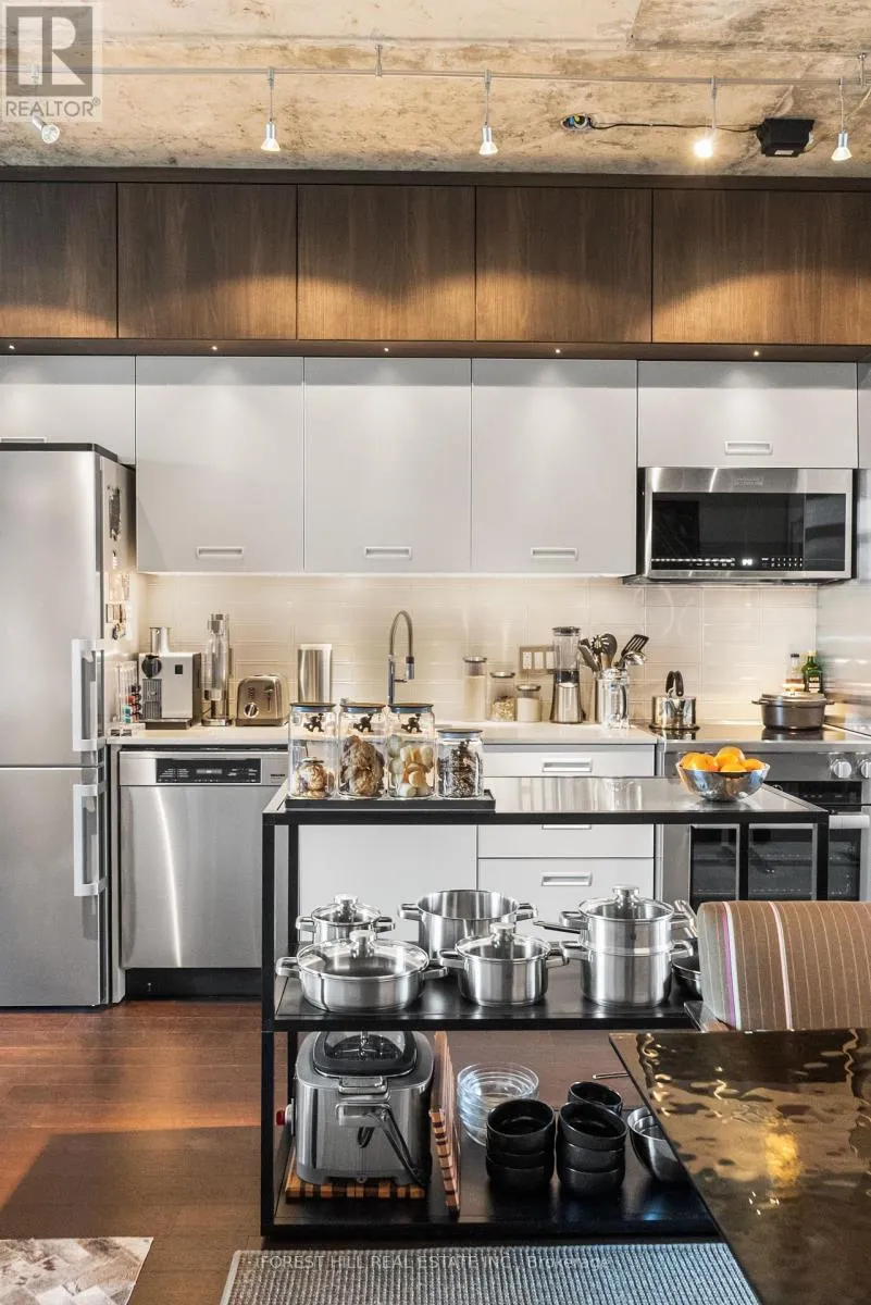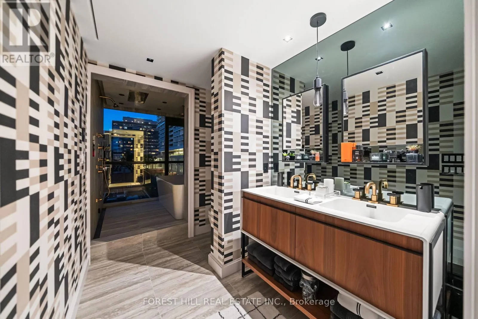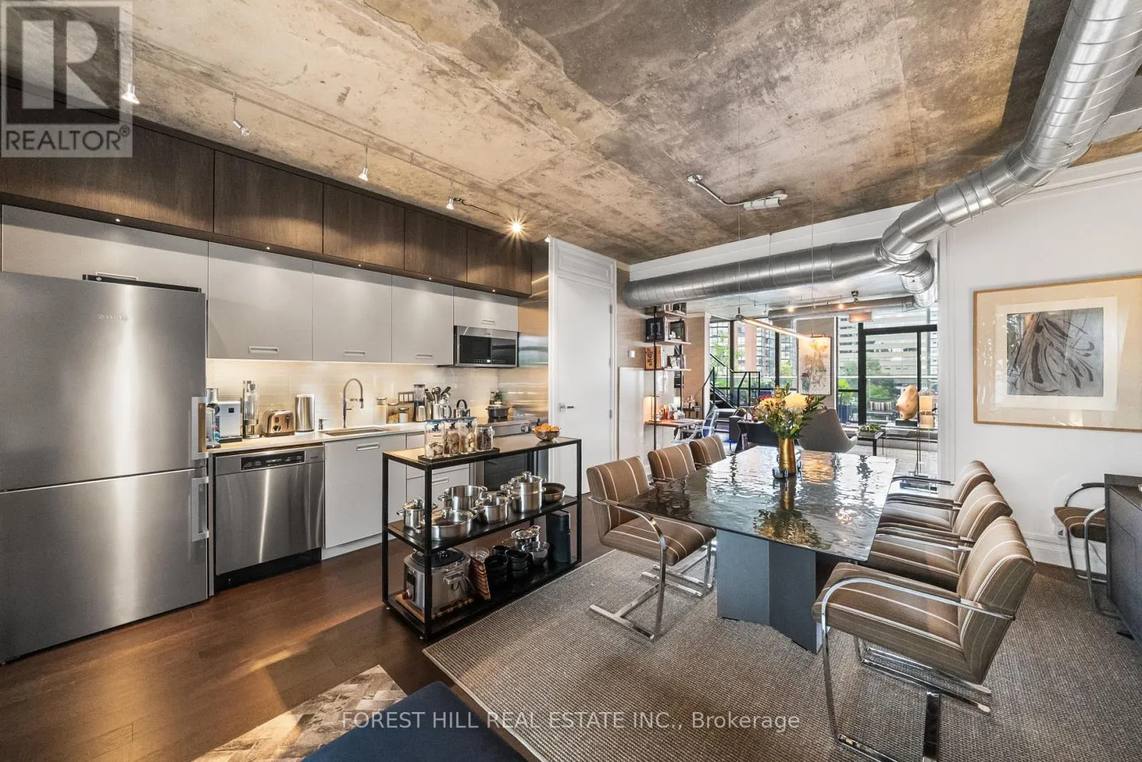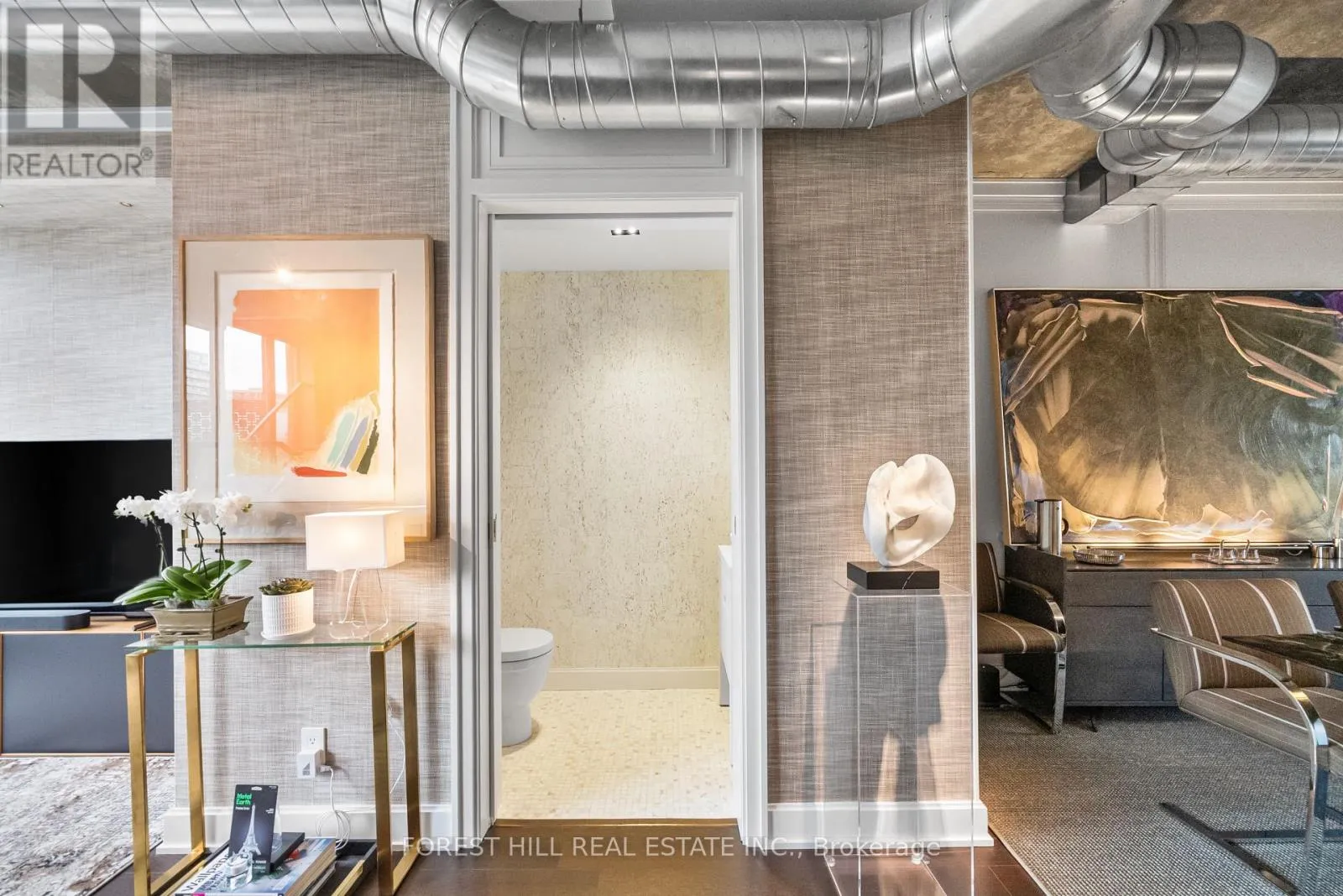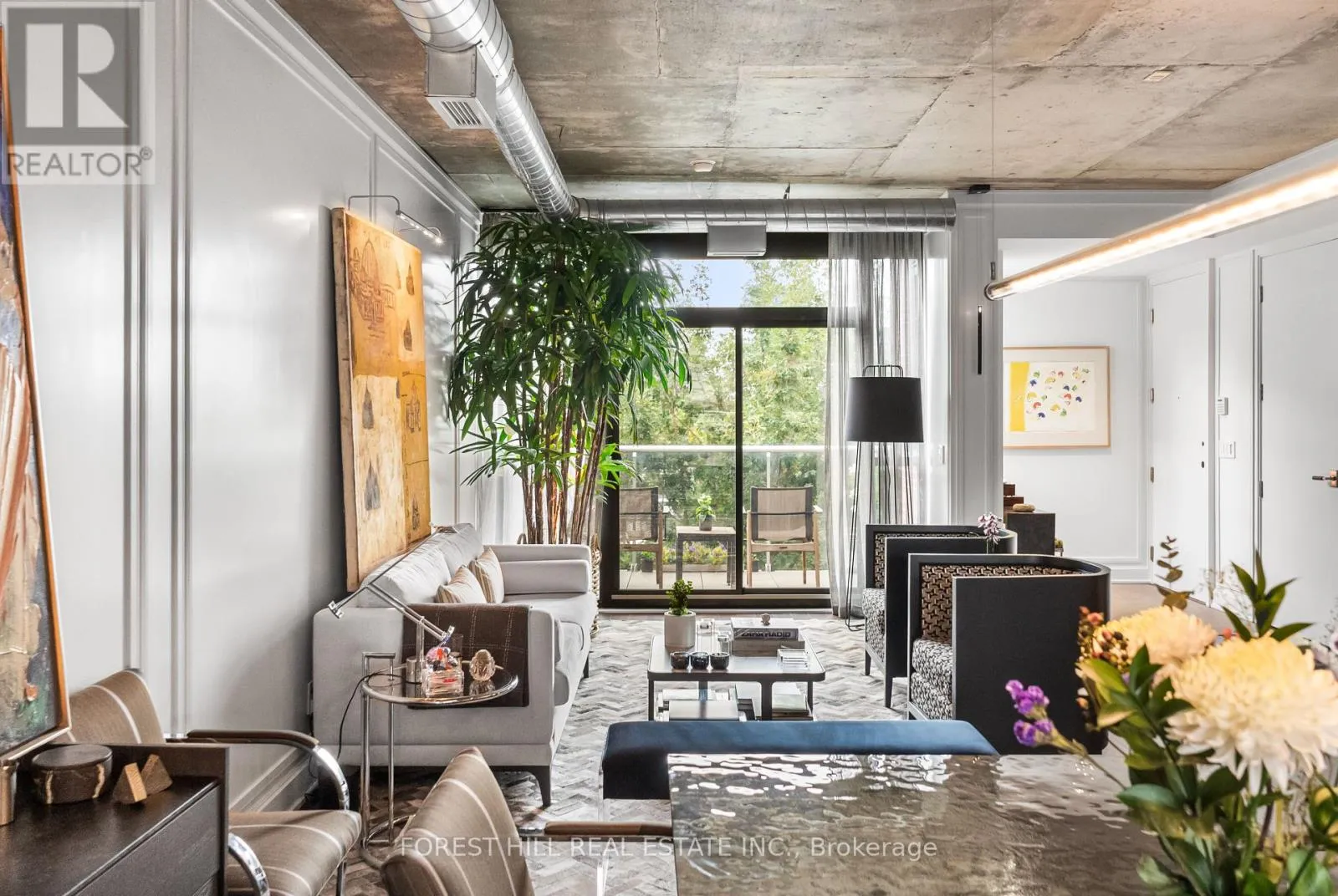 Cross Streets: King & Bathurst. ** Directions: -. Your King West dreams are made of this. Welcome to this bespoke two-storey penthouse, custom-designed and newly rebuilt from top to bottom. This designer's own residence offers over 2100 square feet of sophisticated interior and exterior loft-style living space in the heart of Toronto's vibrant King West neighbourhood. Located in a discreet 6-storey boutique building with only two units per floor on a quiet, tree-lined street, this extraordinary penthouse seamlessly blends industrial loft charm with luxuriously refined designer finishes. Not just one, but three private north and south-facing landscaped terraces totalling 610 square feet of sophisticated outdoor living space are perfect for entertaining or enjoying quiet moments overlooking the city skyline. The south-facing living room features exposed concrete ceilings and ductwork juxtaposed with custom Brenlo mouldings and walks out to a terrace with an unobstructed south view over treetops. The kitchen features brand new Miele appliances, while the adjacent dining room comfortably seats 8 guests. The family room steps out onto a gorgeous northwest-facing terrace with a BBQ gas line, dining area, and Veradek planters with integrated lighting. Walk up to the extraordinary second-floor retreat, a true lifestyle experience. Featuring unobstructed north and south-facing windows, custom white oak millwork in the primary bedroom, and a 5-star ensuite with a steam room, spa shower, freestanding tub, and custom gold-plated fixtures. The crown jewel is the remarkable south-facing rooftop terrace, perfect for summer entertaining and fully landscaped with Veradek and corten steel backlit planters, a 6-zone custom irrigation system and large-format porcelain tiles. Ideally located within easy walking distance to the best of King Wests world class amenities, including restaurants, bars, The Well, Billy Bishop Airport, and the Stackt Market, this penthouse offers a refined lifestyle in the heart of the city. (id:27476)