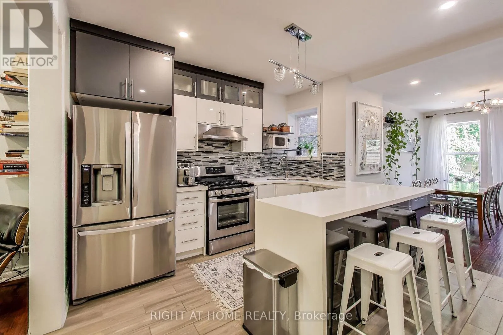 Cross Streets: King St West & Dufferin St. ** Directions: North of King St W. Step onto Gwynne Avenue and you're in the beating heart of South Parkdale, where history and grit effortlessly mingles with creativity and culture. This street hums with character, Century old Victorian homes under the shade of massive trees, steps from Queen Street West cafes, vintage shops and late-night haunts that feel more like discoveries than destinations. Life here is lived on foot with a walk score of 97, morning coffee from a local roaster, evenings wandering to art shows or neighbourhood eateries that span every corner of the globe, weekends stretched out in Trinity Bellwoods or by the lake. This is Toronto at its finest - alive, unfiltered and made for walking. Built in 1880 and fully renovated for modern living, this end-unit townhouse feels more like a semi-detached, surrounded by neighbours who value the sense of community the street is known for. Inside, 3 bedrooms with an oversized primary overlooking a quiet tree-lined street, paired with two full bathrooms. The main floor pulls you in with its rhythm starting in a living room full of character into a sleek modern chefs kitchen with plenty of storage where the breakfast island begs for conversation over a glass of wine. From there it drifts into the dining room, patio door thrown open to a sun-filled east-facing deck where weekends feel more like vacations with food, friends and the kind of gatherings that turn into stories to remember! The basement was completely redone in 2021 with full underpinning and waterproofing, polished concrete floors, radiant heating, separate entrance, and kitchenette hookups, making it ideal as a bright one-bedroom income suite, home office or perfect family space. TTC right at your doorstep makes daily commute to downtown a breeze and 24/7 street permit parking is plentiful. With nothing left to do but move in, this home blends heritage character, privacy, and turn-key ease in one of Torontos most vibrant neighbourhoods. (id:27476)