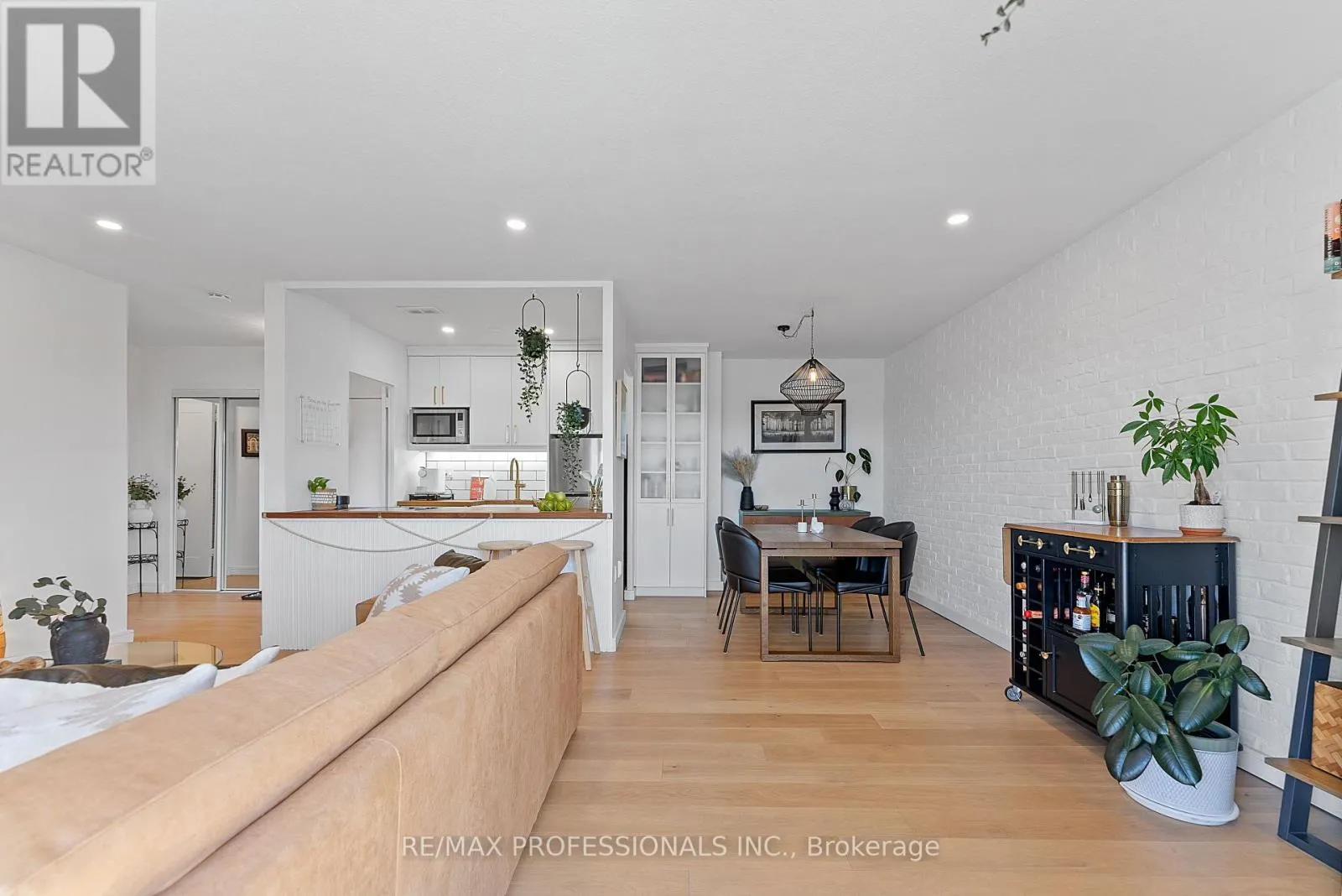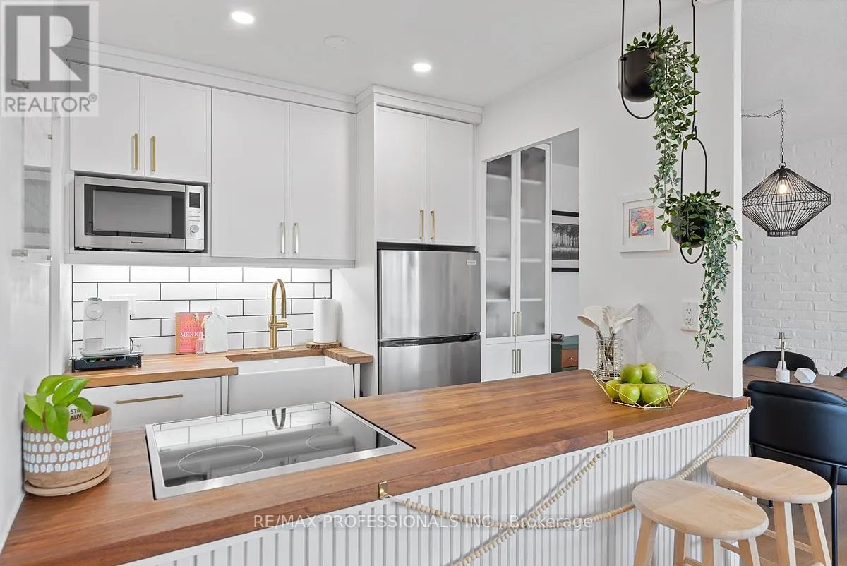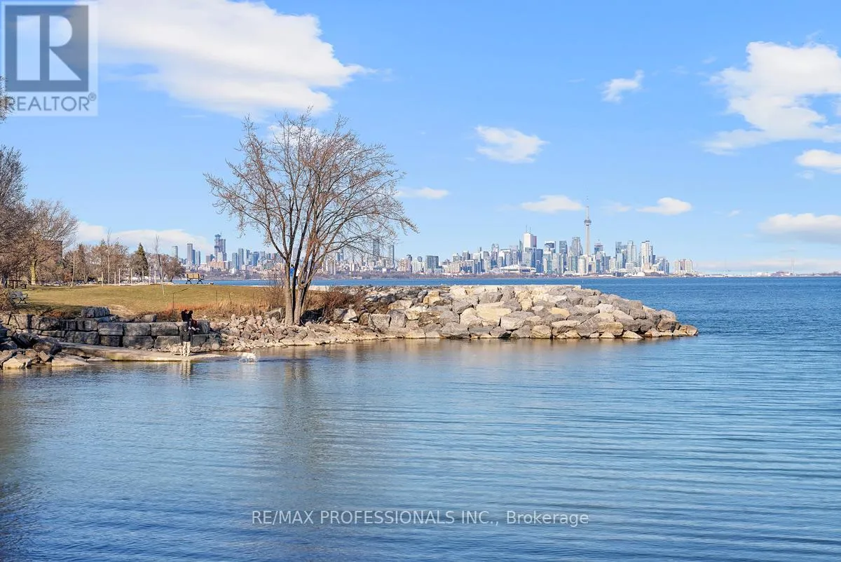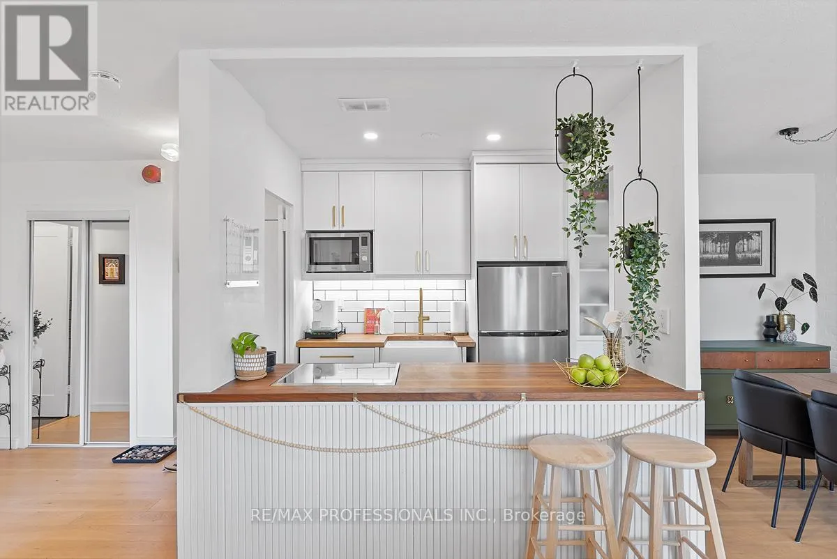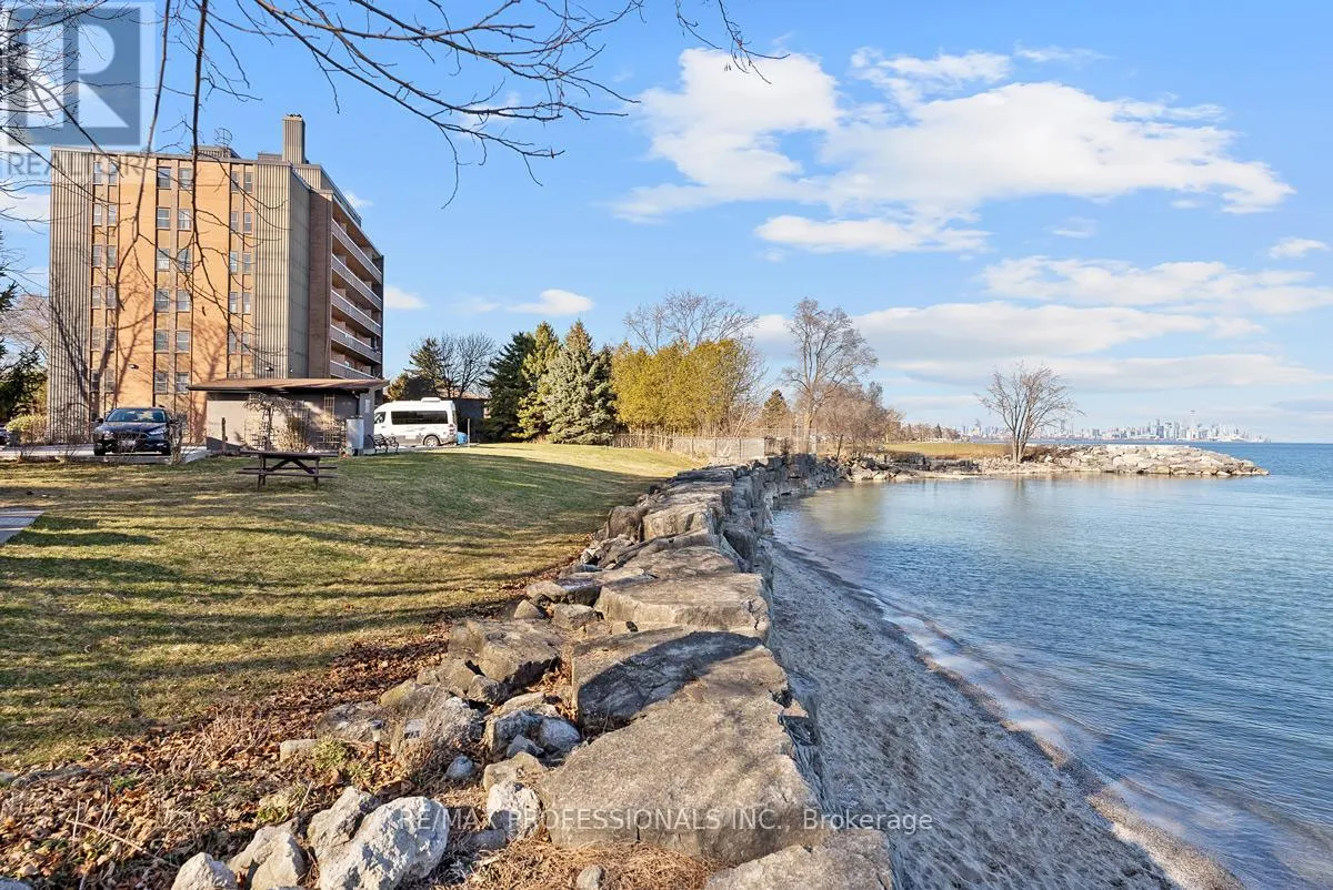 Cross Streets: Lake Shore Drive and Fourth Street. ** Directions: Just west of fourth street, fronting on Lake Shore Drive. Welcome to 41 Lake Shore Drive #501, a fully renovated, oversized one-bedroom suite in a boutique waterfront building! Flooded with natural light, this thoughtfully designed unit blends modern style with premium finishes. The spacious living and dining area features Century Architecture Distillery painted brick veneer accent wall, SONOpanX insulation, wide plank engineered hardwood floors, LED pot lights, custom cabinetry and new GEM Aluminum patio doors and windows. The gourmet kitchen is a home cook's dream, boasting custom Elisabeth Ashley cabinetry, butcher block counters, a Blanco Ikon farmhouse sink with gold Crue pull-down faucet, stainless steel appliances and a classic white subway tile backsplash. Large primary bedroom featuring a massive window with automatic Zebra blinds, a shiplap accent wall with SONOpanX insulation, a double closet, modern ceiling fan and wide-plank floors. The spa-like 4 piece bathroom showcases a Rubix skirted tub, Zen tap vanity, Zip 3-way shower with thermostatic valve, stylish hexagon flooring and a MAXX Incognito shower door. Additional upgrades include new solid wood interior doors and hardware, new light fixtures, a new breaker panel and a fresh neutral palette. 31.5' x 5'4" private balcony, perfect for relaxing and entertaining. One underground parking spot and one locker included. This well-managed building offers a common waterfront BBQ area w/ breathtaking lake views, watersports storage, w/maintenance fees covering property taxes, heat, hydro, water & more. Nestled in the heart of New Toronto, steps from Prince of Wales Park, Lake Ontario and the waterfront trail, this vibrant neighbourhood offers unbeatable access to nature, rec and city conveniences. Enjoy nearby trendy shops and restaurants including local favourites like Teos Bakery, Cellar Door, Kitchen on Sixth, The Sydney Grind and Funny Bones Games Lounge with convenient transit options at your doorstep. Incredible value in a highly sought-after lakeside location (id:27476)