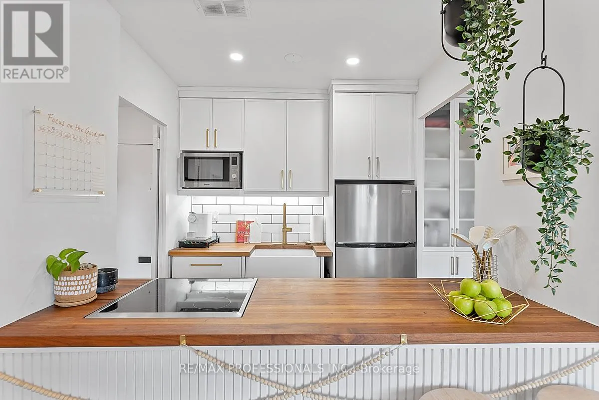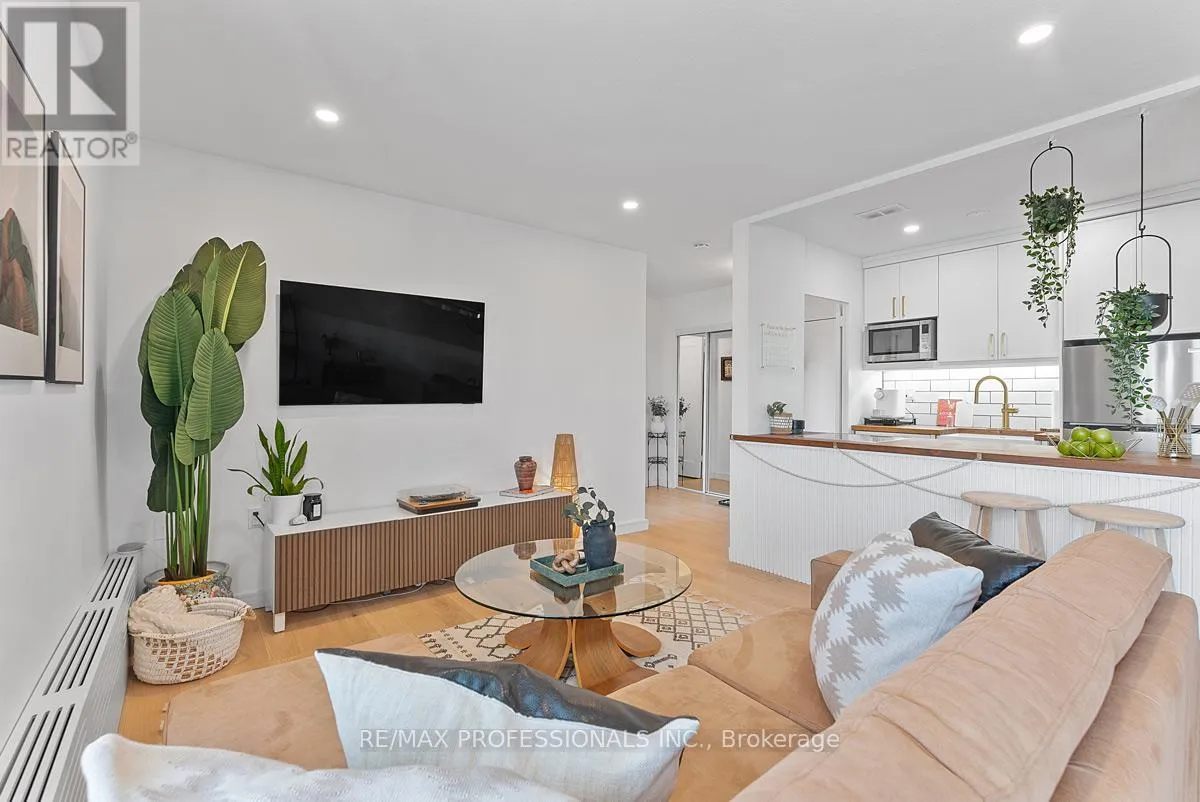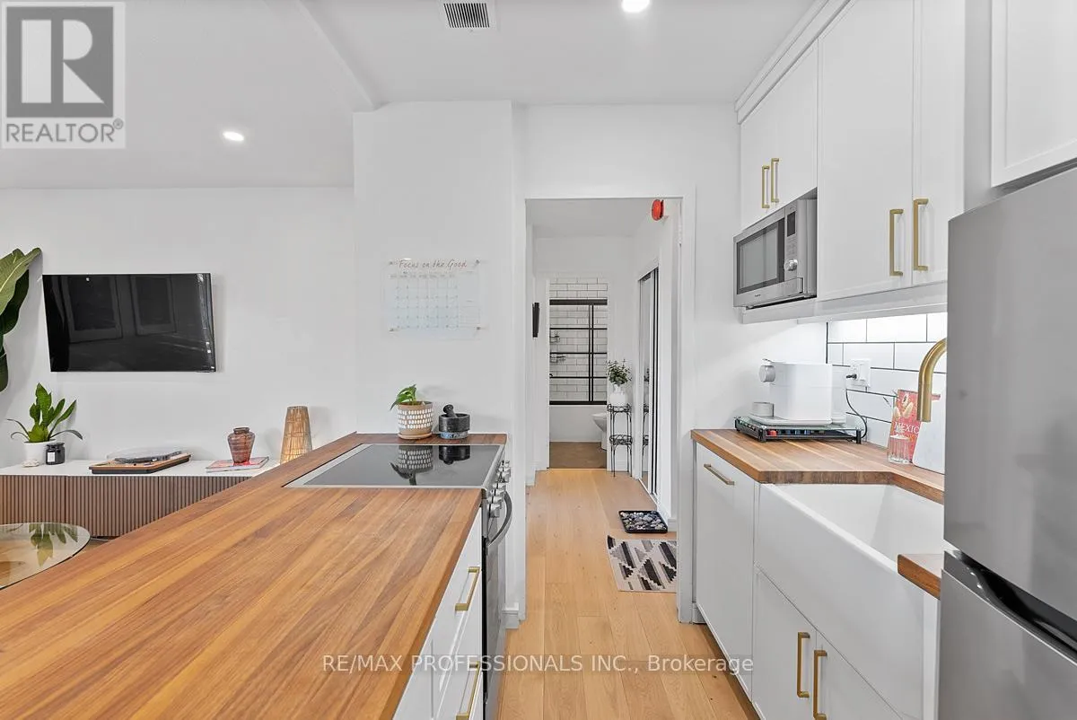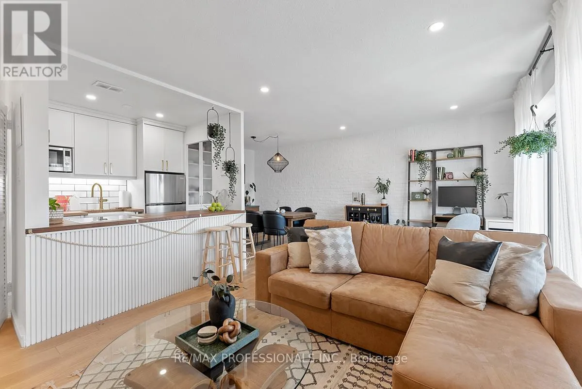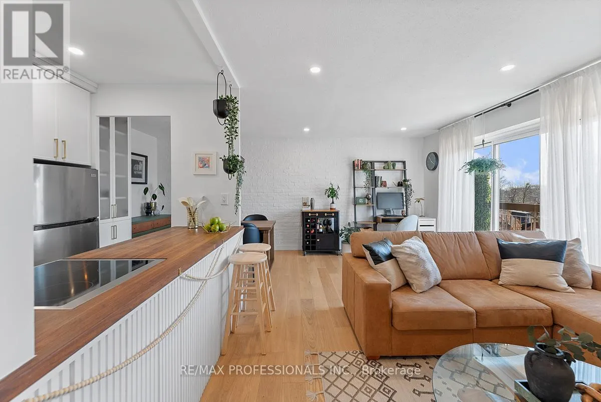 Cross Streets: Lake Shore Drive and Fourth Street. ** Directions: Just west of fourth street, fronting on Lake Shore Drive. Welcome to 41 Lake Shore Drive #501, a fully renovated, oversized one-bedroom suite in a boutique waterfront building! Flooded with natural light, this thoughtfully designed unit blends modern style with premium finishes. The spacious living and dining area features Century Architecture Distillery painted brick veneer accent wall, SONOpanX insulation, wide plank engineered hardwood floors, LED pot lights, custom cabinetry and new GEM Aluminum patio doors and windows. The gourmet kitchen is a home cook's dream, boasting custom Elisabeth Ashley cabinetry, butcher block counters, a Blanco Ikon farmhouse sink with gold Crue pull-down faucet, stainless steel appliances and a classic white subway tile backsplash. Large primary bedroom featuring a massive window with automatic Zebra blinds, a shiplap accent wall with SONOpanX insulation, a double closet, modern ceiling fan and wide-plank floors. The spa-like 4 piece bathroom showcases a Rubix skirted tub, Zen tap vanity, Zip 3-way shower with thermostatic valve, stylish hexagon flooring and a MAXX Incognito shower door. Additional upgrades include new solid wood interior doors and hardware, new light fixtures, a new breaker panel and a fresh neutral palette. 31.5' x 5'4" private balcony, perfect for relaxing and entertaining. One underground parking spot and one locker included. This well-managed building offers a common waterfront BBQ area w/ breathtaking lake views, watersports storage, w/maintenance fees covering property taxes, heat, hydro, water & more. Nestled in the heart of New Toronto, steps from Prince of Wales Park, Lake Ontario and the waterfront trail, this vibrant neighbourhood offers unbeatable access to nature, rec and city conveniences. Enjoy nearby trendy shops and restaurants including local favourites like Teos Bakery, Cellar Door, Kitchen on Sixth, The Sydney Grind and Funny Bones Games Lounge with convenient transit options at your doorstep. Incredible value in a highly sought-after lakeside location (id:27476)