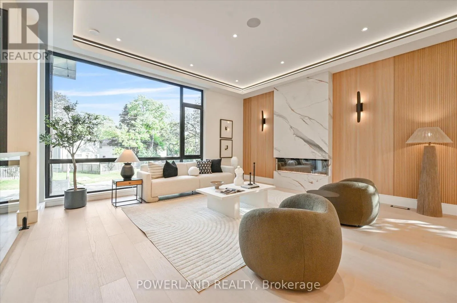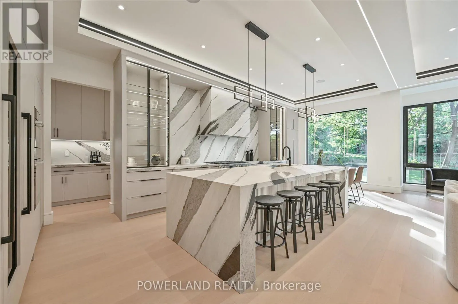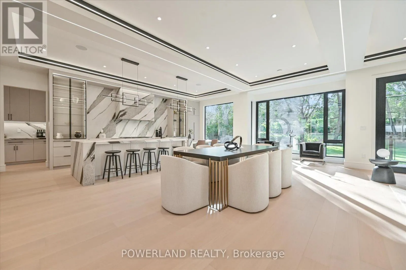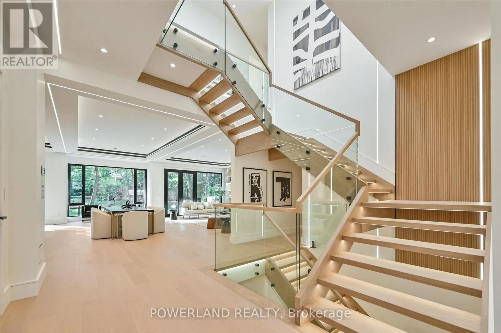 Bayview/Sheppard Welcome to this brand-new, custom-built modern mansion, offering over 7,200 sq. ft. of refined living space (5,124 sf across the main and second floors + 2,106 sf in the finished walk-up lower level), perfectly situated on a premium diamond-shaped lot (huge 11,324 sq. ft.) in the prestigious, nature-rich Bayview Village neighbourhood. Steps to ravine trails, parks, Bayview Village Mall, Bessarion Subway Station, Hwy 401, and Torontos top-ranked schools. This architecturally striking residence blends modern sophistication with timeless elegance. Dramatic ceiling heights (14' in foyer & office, 11' on main, 10' on second, and 12' in the lower level), a floating staircase illuminated by a 6x6 skylight, and floor-to-ceiling picture windows create bright, airy interiors infused with natural light. The chef-inspired kitchen is a true showpiece, featuring Miele and Fisher & Paykel appliances, an oversized island with breakfast seating, a fully equipped butlers pantry, and a discrete spice kitchen for the passionate cook. Upstairs, the luxurious primary suite is a serene retreat with a spa-inspired ensuite (heated floor) and a custom dressing room. Four additional bedrooms, each with its own ensuite, provide comfort and privacy for the entire family. The finished walk-up lower level is crafted for both entertaining and relaxation, showcasing a spacious recreation room with an expansive wet bar, a private nanny/in-law suite, and a dedicated exercise area--all enhanced by radiant heated floors throughout. Additional features include Private elevator serving all levels, Control4 smart home automation system, Wide-plank 7.5" white oak hardwood flooring, LED strip & pot lighting throughout, Instant hot water recirculation system, Closed-cell spray foam insulation for the entire home, Hi-tech entry door with fingerprint recognition, Smooth-operating triple-pane laminated security glass windows. An extraordinary opportunity to call this masterpiece your home. (id:27476)