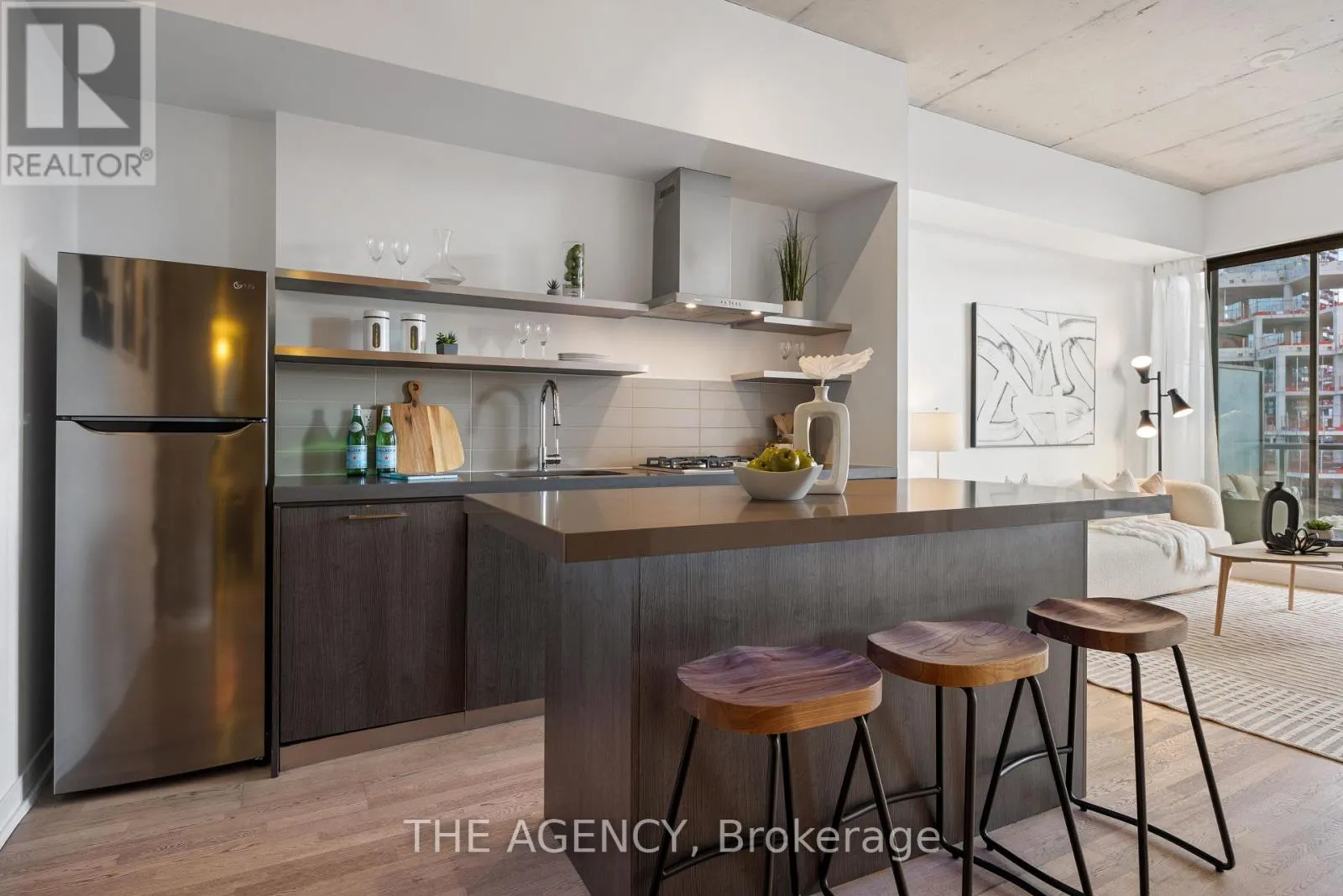 Cross Streets: King St W/Portland St. ** Directions: King St W, between Brant St and Portland St. Available for short-term!!! Step into the epitome of King West luxury at Fashion House Condos! One of Downtown Toronto's most sought-after buildings, this boutique gem radiates sophistication from the entrance onward. Located atop 'The Keg Steakhouse' and 'Majesty's Pleasure' social beauty club, and across from the iconic 'Rodney's Oyster House' and 'Mademoiselle Raw Bar & Grill', this is Fashion District living at its finest-- surrounded by the vibrant nightlife and renowned culinary experiences of King West. This south-facing unit is flooded with natural light and boasts forever-unobstructed views of the district and the CN Tower, visible from both the balcony and bedroom. Enjoy open-concept, loft-style, living with 10' exposed concrete ceilings and pillars, and floor-to-ceiling windows. Step out onto a cabana-style balcony overlooking the buildings signature infinity pool- perfect for poolside vibes from the comfort of your home. With a gas BBQ hookup, deck tiles, and a luxurious round daybed, your outdoor escape awaits. Inside, discover a modern, open-concept interior with a practical layout. The European-style chef's kitchen features open top shelving, high-end stainless-steel appliances, a gas cooktop, and a spacious waterfall island. The primary bedroom, fits a king bed, offers a large walk-in closet and stunning views. The spacious den comfortably fits a queen-size bed and includes built-in storage. Both the bedroom and the den come with privacy sliding doors. The rarely available 5-piece bathroom provides the luxury of both a shower stall and a bathtub. Top-notch amenities include an infinity pool and cabanas connected to a state-of-the-art gym and a party room. TTC at your doorstep, 5 minutes by bike to the Toronto Waterfront and TikiTaxi station-- your King West oasis awaits! The unit comes with a parking spot and a locker, very close to each other. Heat and water included in the maintenance fees. (id:27476)