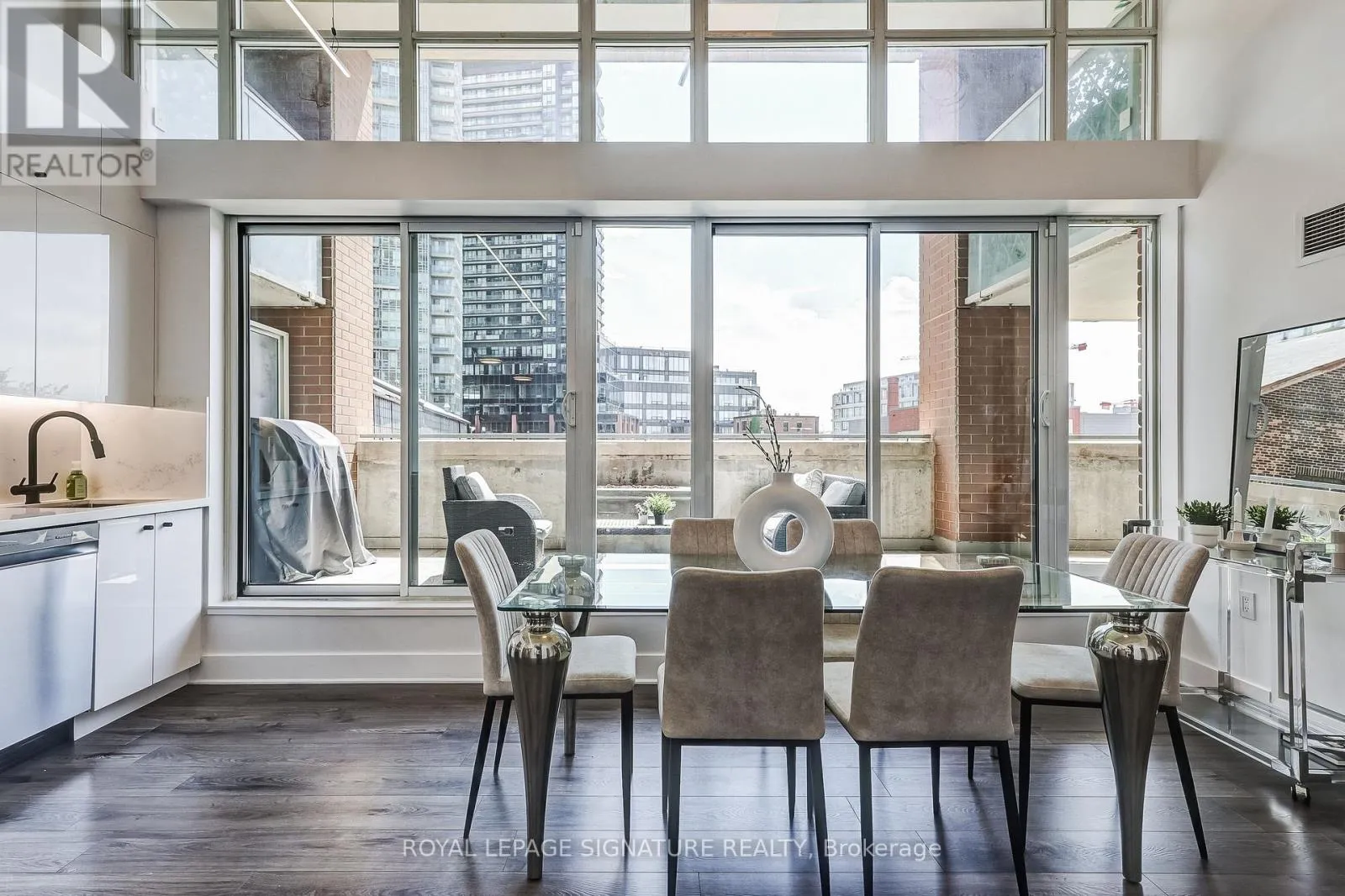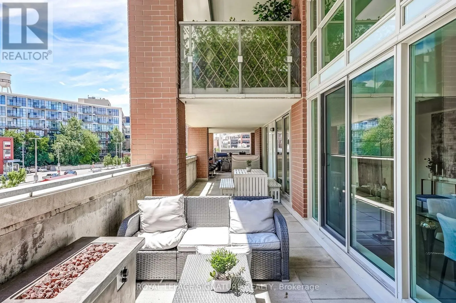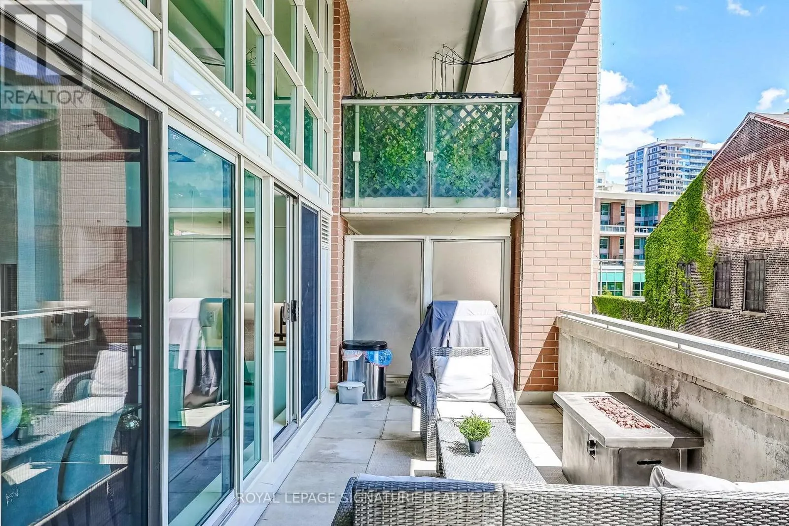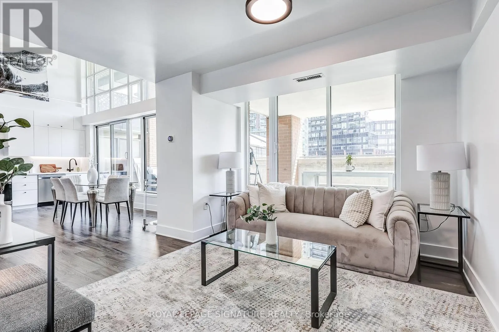 King St W / Strachan A true gem in the heart of Liberty Village. From the moment you step inside of this rarely offered, newly renovated 2 bedroom, 2 bathroom corner unit you will be captivated by the soaring 16 foot ceilings. Sun drenched and full of natural light with floor to ceiling windows at every turn. The sleek kitchen comes equipped with modern cabinetry, high end quartz counters and quartz backsplash, stainless steel appliances, black hardware and opens up to the massive living and dining area. The spacious primary bedroom has a large walk-in closet and ensuite bathroom that was just upgraded with high end finishes. Now lets talk about the 622 sq ft wrap around balcony which is one of the many showstoppers in this unit and has gorgeous views of everything Liberty Village has to offer. You will never be short of space when you are entertaining or hosting parties. Includes approved plans, permit and drawings for a 2nd floor, 3rd bedroom or family room addition. Don't miss your chance to see this one-of-a-kind loft style unit in one of the best neighbourhood's in Toronto. (id:27476)