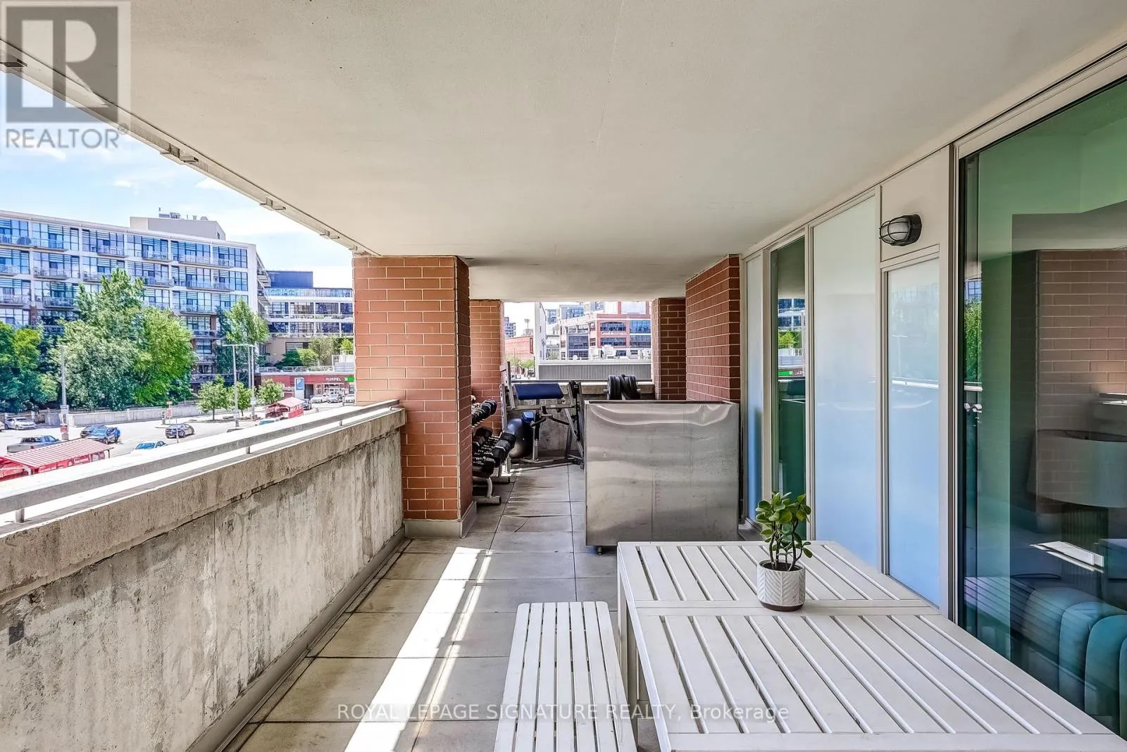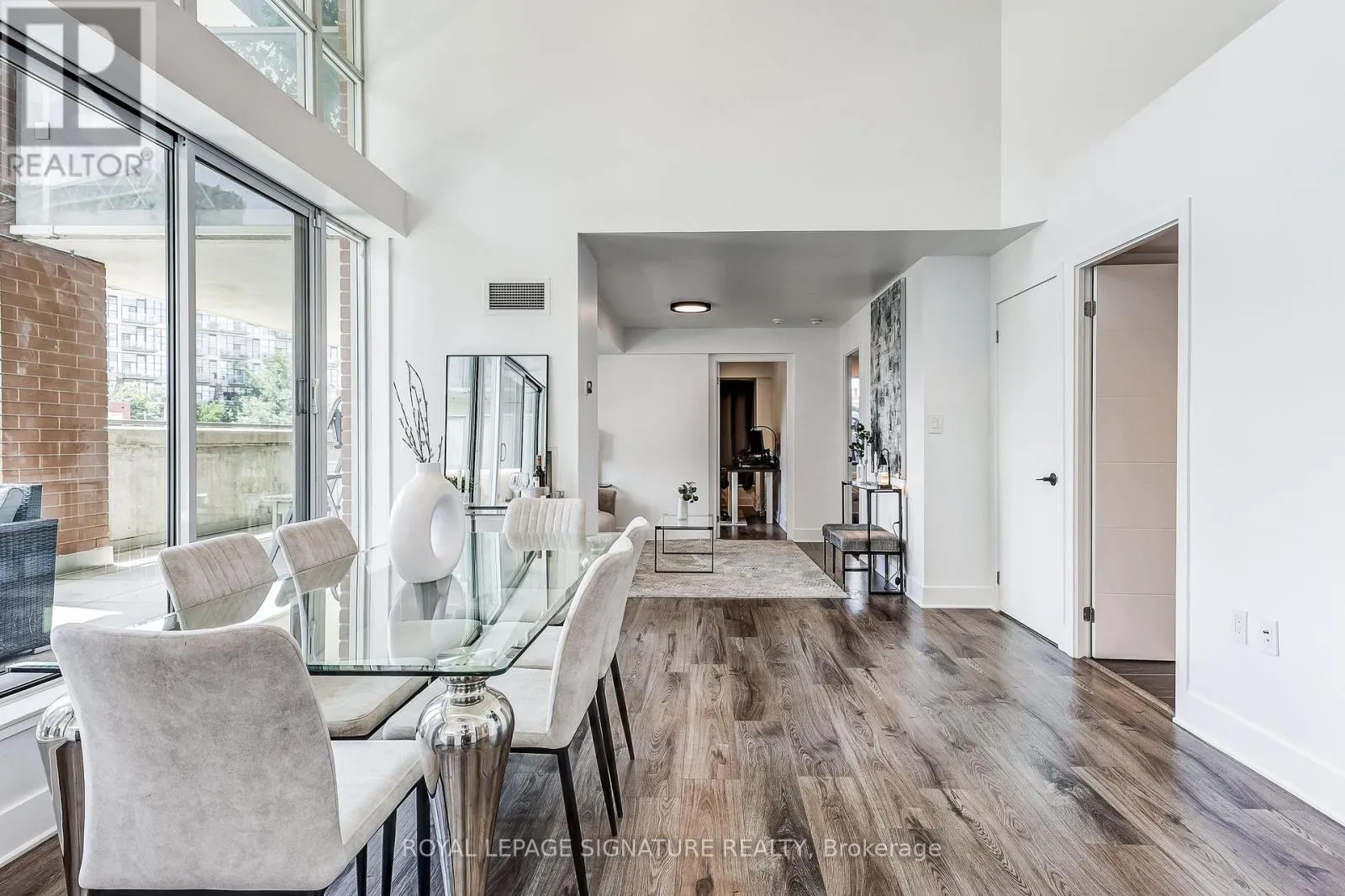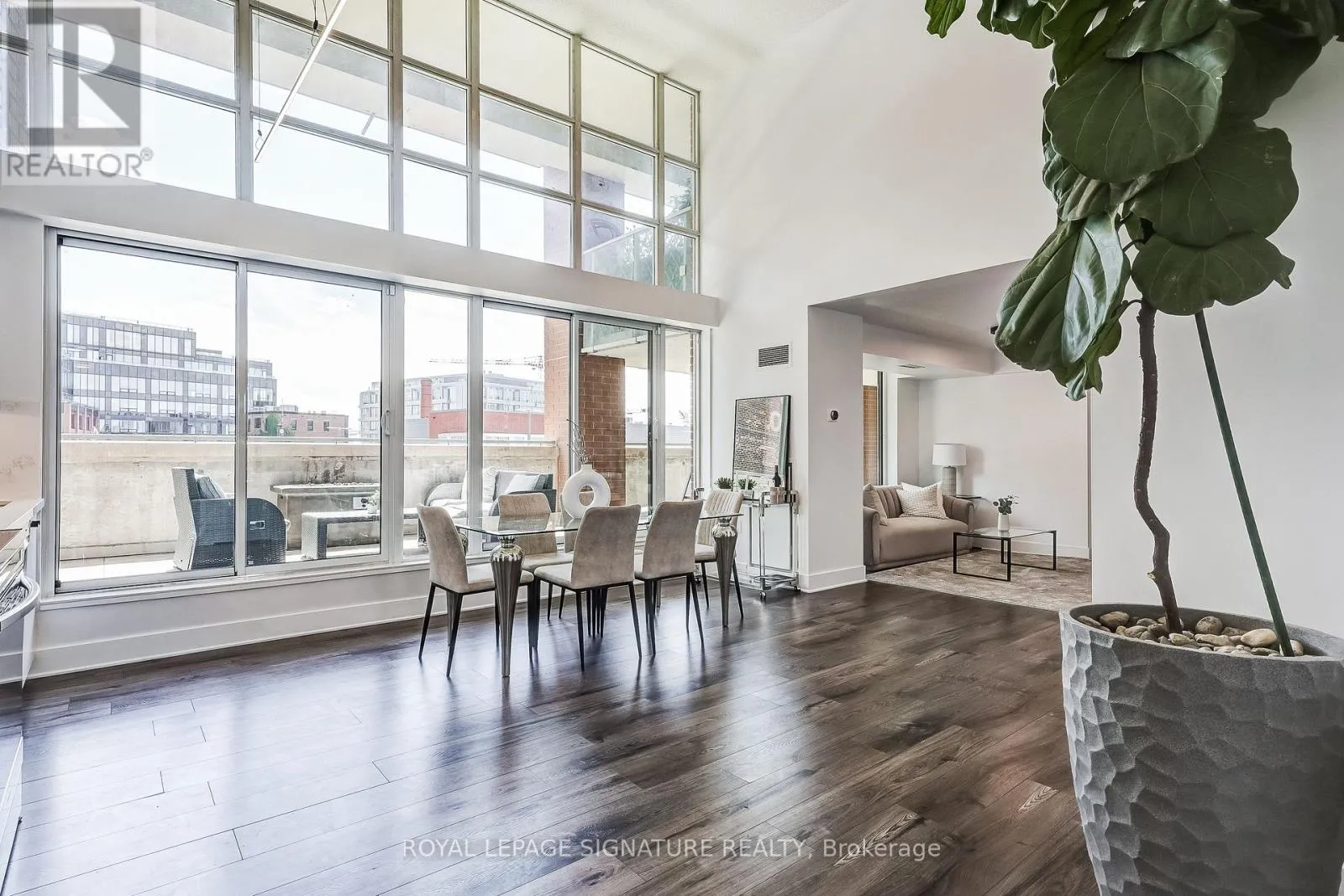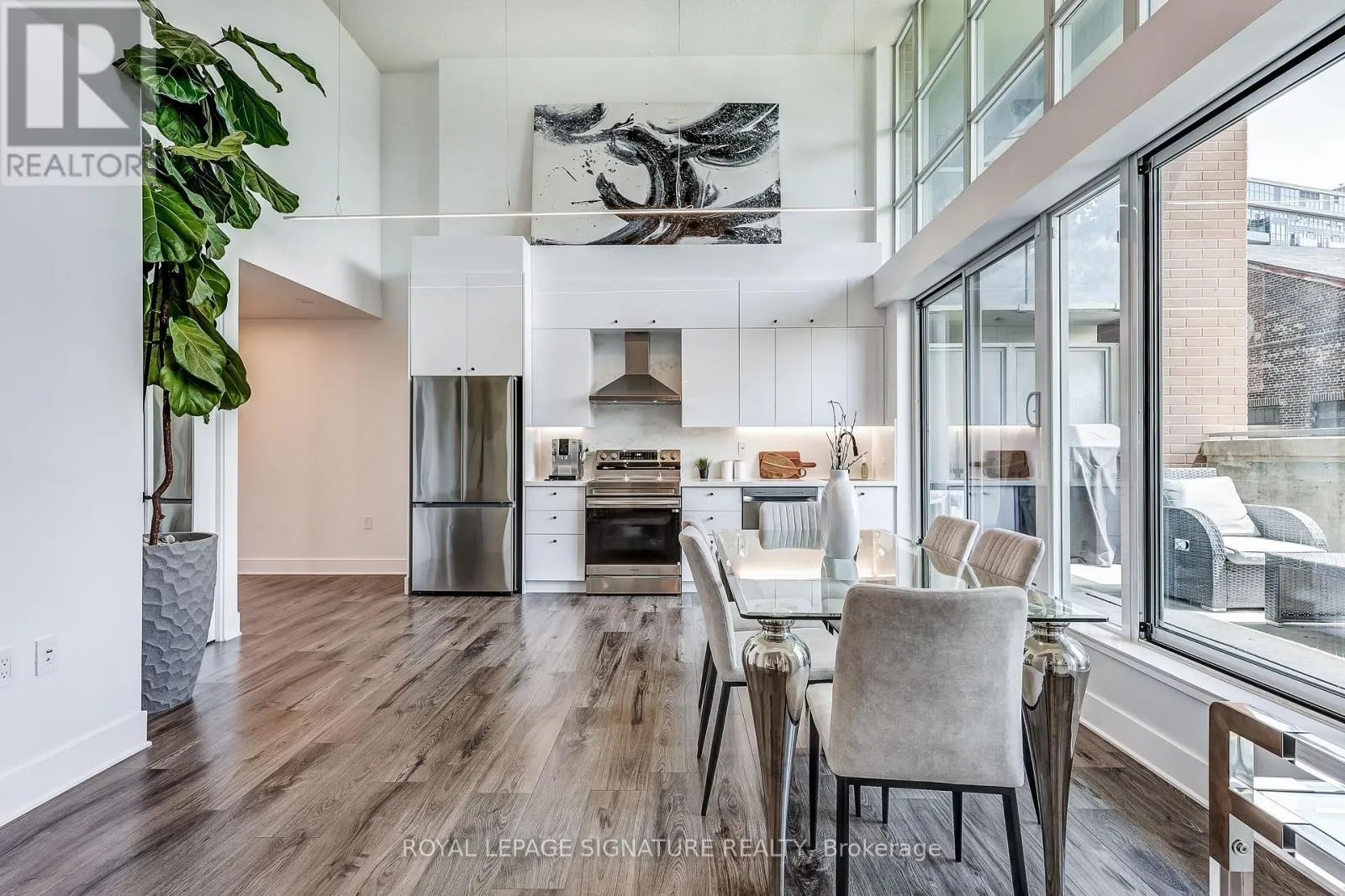 King St W / Strachan A true gem in the heart of Liberty Village. From the moment you step inside of this rarely offered, newly renovated 2 bedroom, 2 bathroom corner unit you will be captivated by the soaring 16 foot ceilings. Sun drenched and full of natural light with floor to ceiling windows at every turn. The sleek kitchen comes equipped with modern cabinetry, high end quartz counters and quartz backsplash, stainless steel appliances, black hardware and opens up to the massive living and dining area. The spacious primary bedroom has a large walk-in closet and ensuite bathroom that was just upgraded with high end finishes. Now lets talk about the 622 sq ft wrap around balcony which is one of the many showstoppers in this unit and has gorgeous views of everything Liberty Village has to offer. You will never be short of space when you are entertaining or hosting parties. Includes approved plans, permit and drawings for a 2nd floor, 3rd bedroom or family room addition. Don't miss your chance to see this one-of-a-kind loft style unit in one of the best neighbourhood's in Toronto. (id:27476)