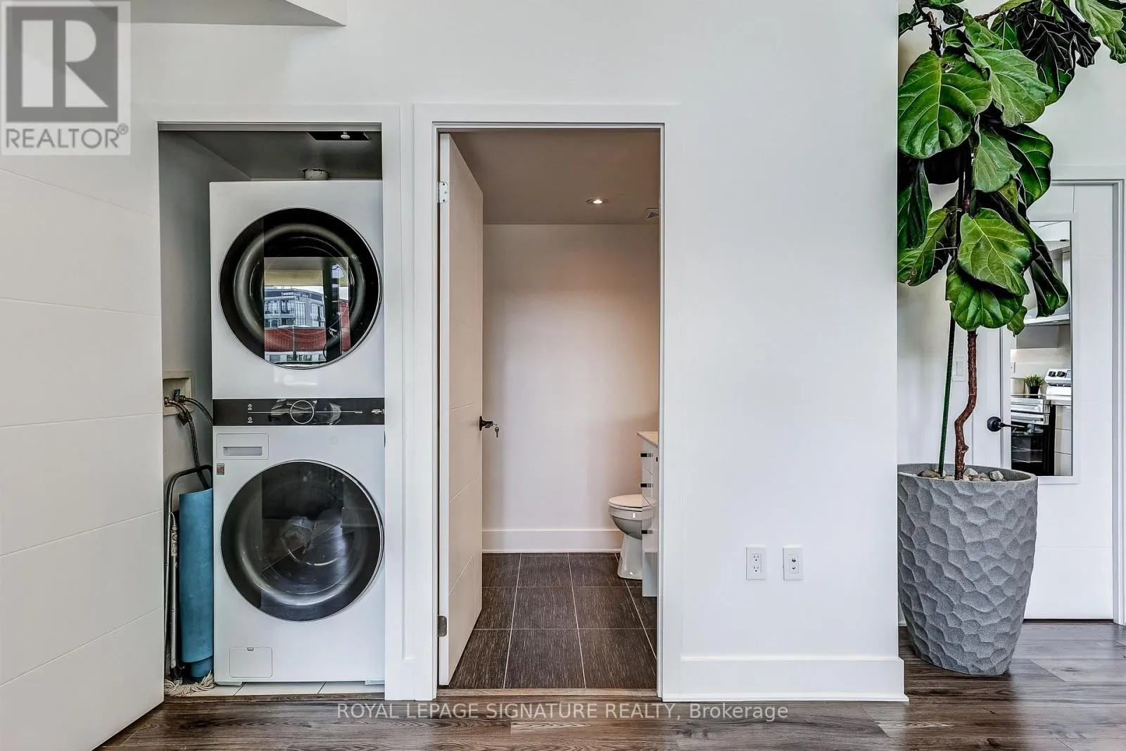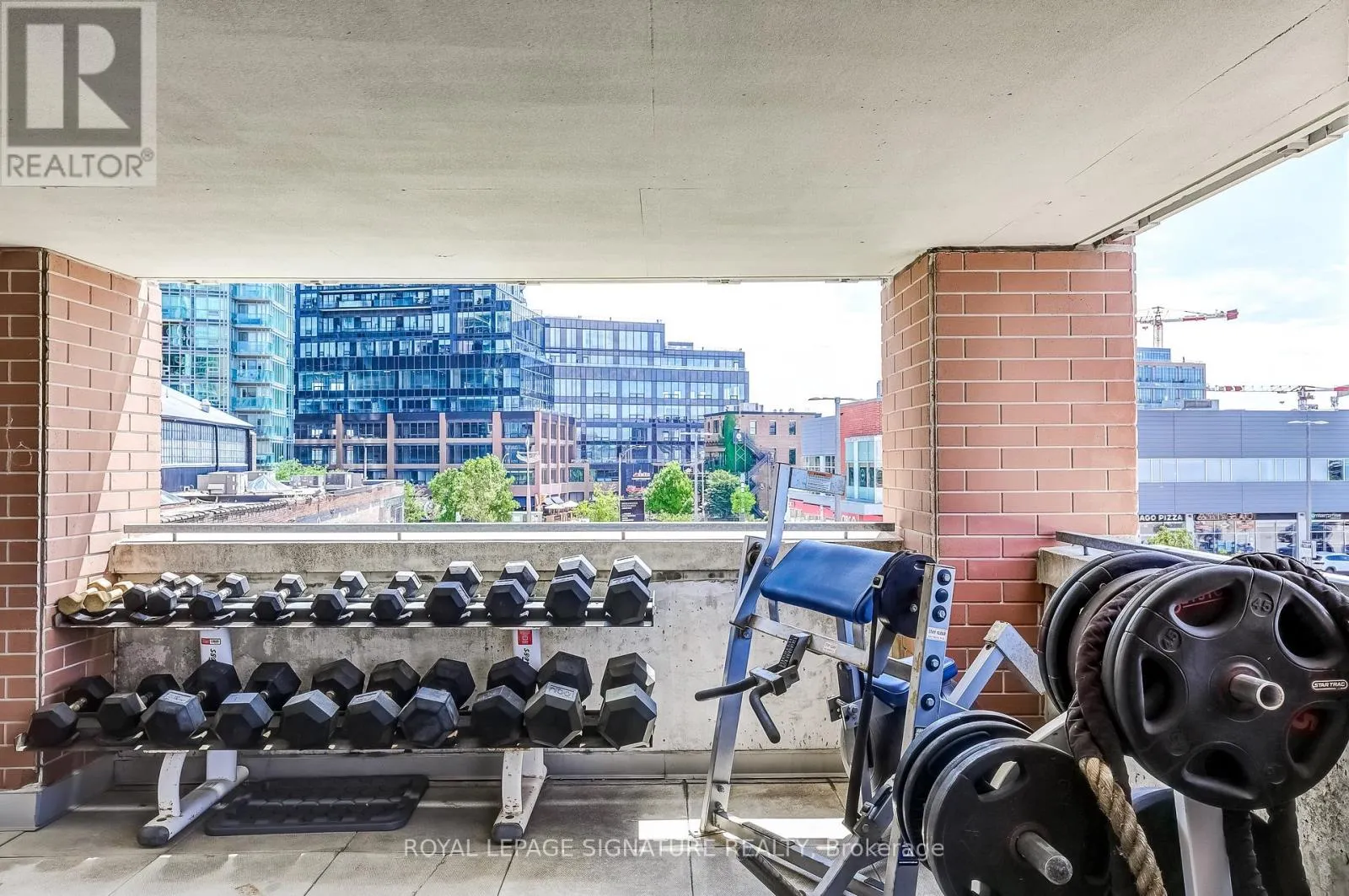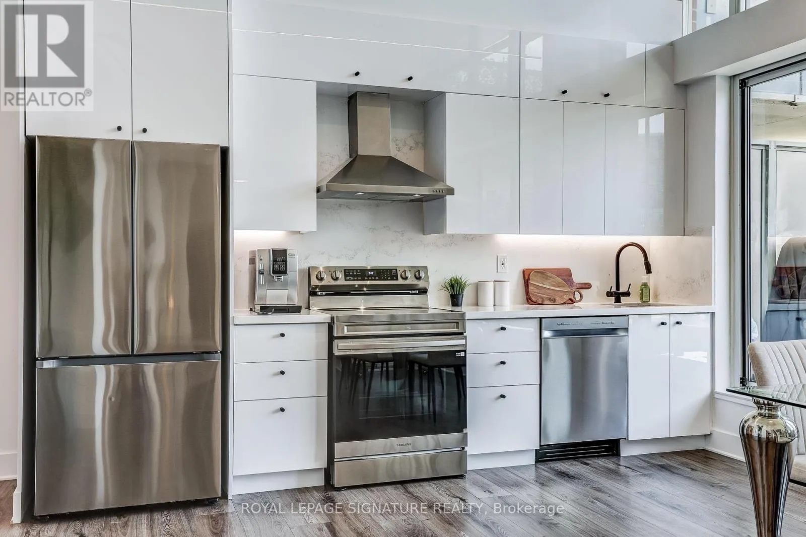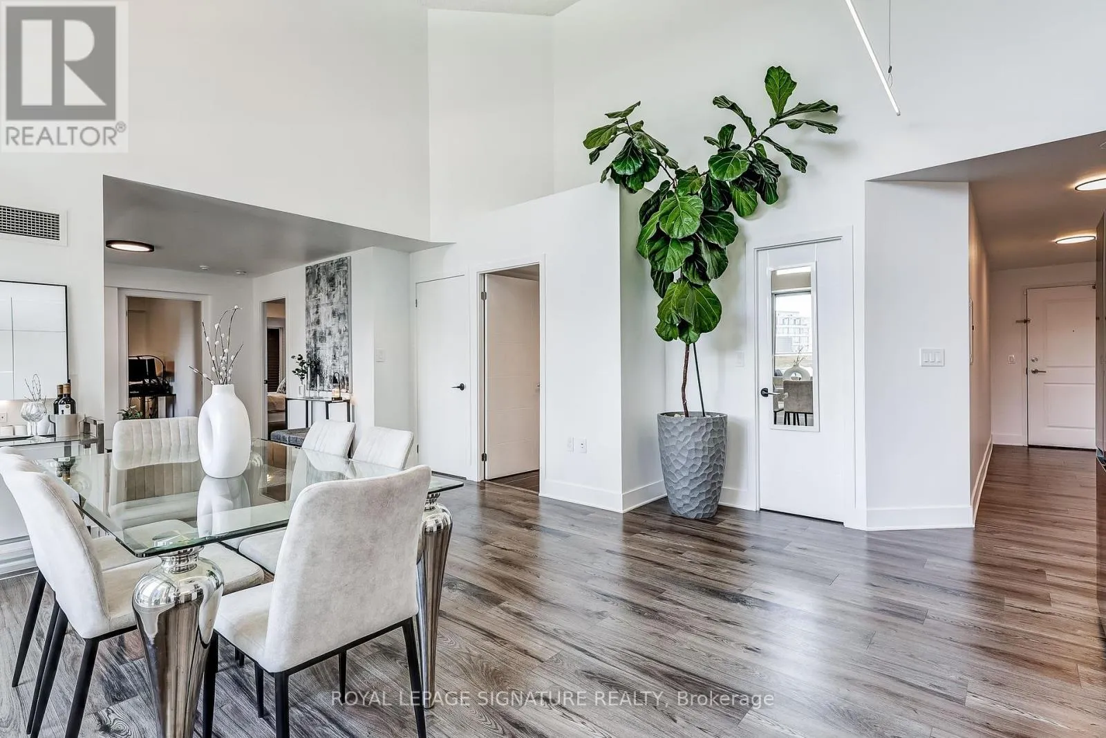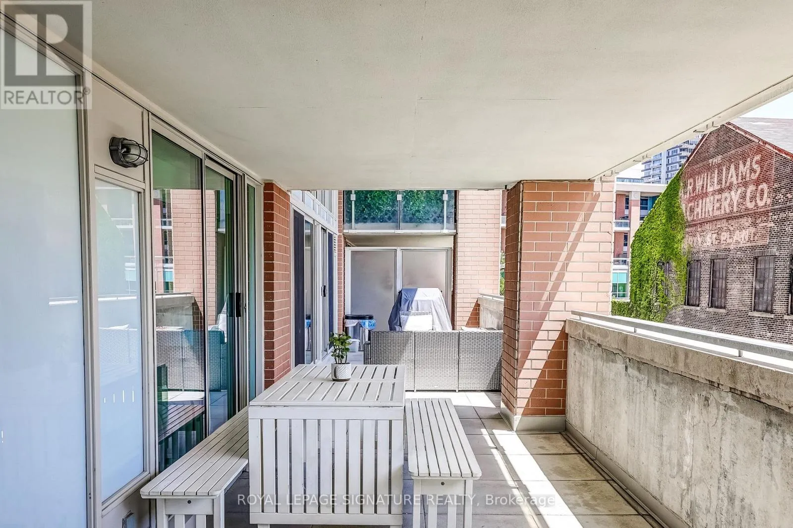 King St W / Strachan A true gem in the heart of Liberty Village. From the moment you step inside of this rarely offered, newly renovated 2 bedroom, 2 bathroom corner unit you will be captivated by the soaring 16 foot ceilings. Sun drenched and full of natural light with floor to ceiling windows at every turn. The sleek kitchen comes equipped with modern cabinetry, high end quartz counters and quartz backsplash, stainless steel appliances, black hardware and opens up to the massive living and dining area. The spacious primary bedroom has a large walk-in closet and ensuite bathroom that was just upgraded with high end finishes. Now lets talk about the 622 sq ft wrap around balcony which is one of the many showstoppers in this unit and has gorgeous views of everything Liberty Village has to offer. You will never be short of space when you are entertaining or hosting parties. Includes approved plans, permit and drawings for a 2nd floor, 3rd bedroom or family room addition. Don't miss your chance to see this one-of-a-kind loft style unit in one of the best neighbourhood's in Toronto. (id:27476)