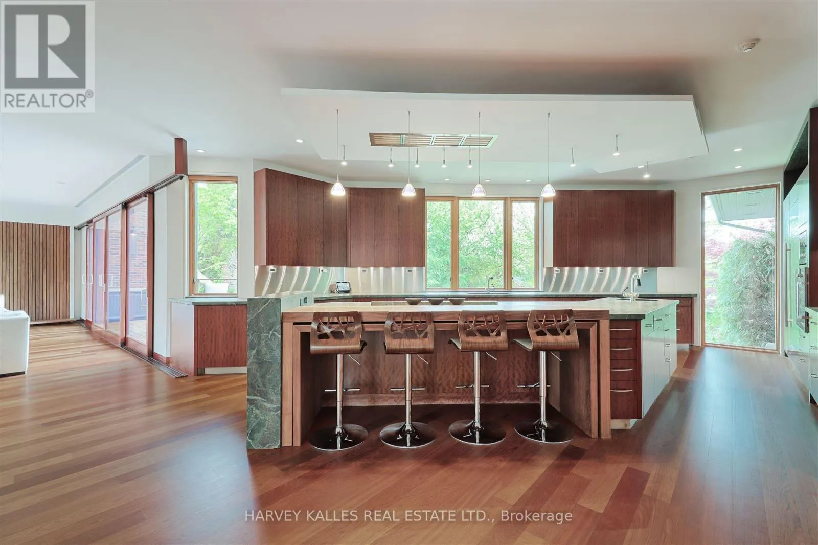 Government and Prince Edward Discover a gem, custom-built as a multi-generational home, offering over 11,000 sq ft of luxurious living space on a rare 125ft double lot at the edge of the Humber Valley in the tree-lined Kingsway neighbourhood. This residence is a statement of contemporary elegance and sophistication, perfect for the discerning family.Inside, experience clean lines and exquisite details that enhance comfortable luxury living, including sound-isolated suites, Jatoba hardwood floors, stunning Persian serpentinite kitchen countertops, and heated stone floors for ultimate comfort.Accessibility is a key feature, with snow melt for the front porch, steps, ramp and driveway, a commercial 4x6 ft elevator, and 4 ft wide hallways to ensure effortless movement throughout the residence.The ground floor features a bright, open-plan living area that seamlessly integrates the chefs kitchen, dining, and living spaces, extending to a partially covered upper deck with a 17ft wide opening. A heated 3-car garage is cleverly positioned at the side of the house.The primary retreat is where luxury meets tranquility, featuring two generous walk-in closets and two ensuites one complete with a massage room and whirlpool tub offering tree-top views. Two additional spacious bedrooms, each with walk-in closets, share a thoughtfully designed bathroom suite with dual sinks, ample storage, and a separate area for added privacy. The oversized fourth bedroom also includes its own ensuite bathroom and walk-in closet, providing comfort and convenience for family or guests.The ground floor bedroom suite with a Juliet balcony offers a perfect retreat for guests.Venture to the finished lower level, where 10+ ft ceilings create a light and airy ambiance.This expansive space features a wide sliding door leading to the lower deck, ideal for entertaining.With multiple entertainment areas, including a stepped home theatre and sprawling park-like backyard, this home is designed for those who appreciate spacious comfort. (id:27476)