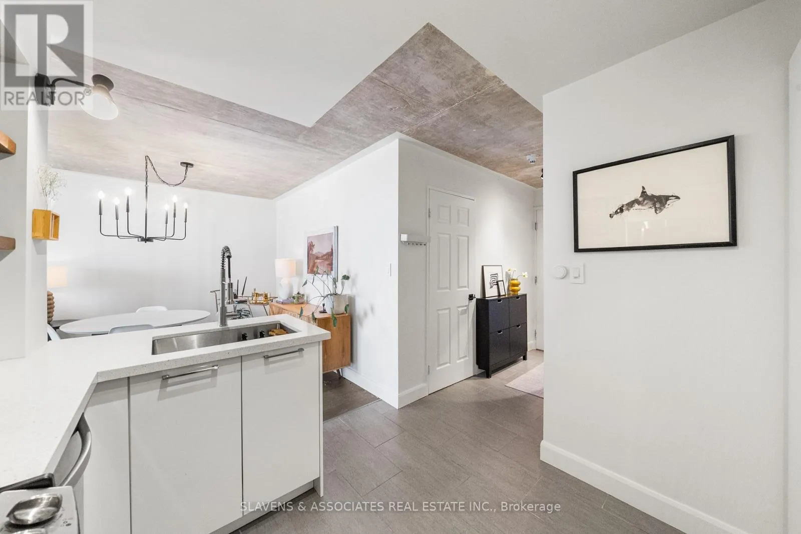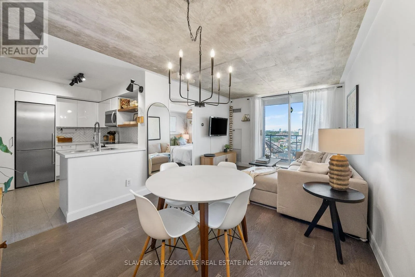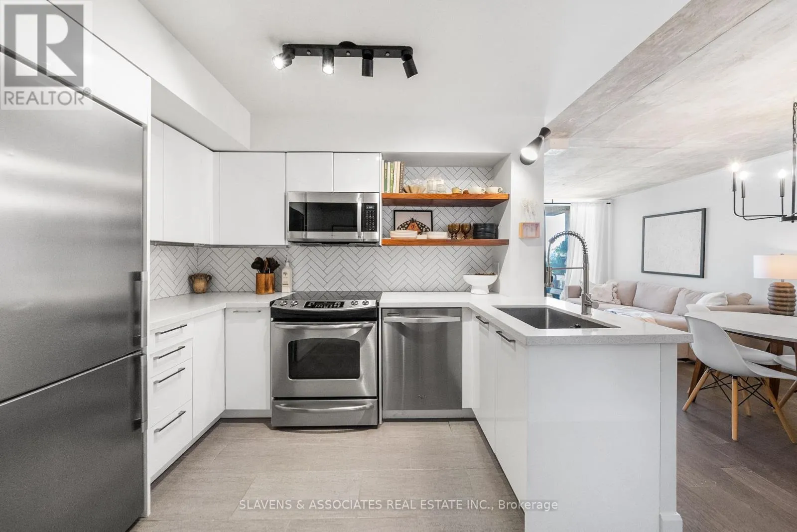 Bloor / Lansdowne Welcome to 1369 Bloor St W - Located in the Heart of Bloor West Village! Featuring an updated 1-bedroom condo with East-facing balcony with views of Toronto skyline and CN tower, large windows, and a highly functional layout with a generous sized kitchen and separate dining area - ideal for both daily living and entertaining. The chef-inspired kitchen includes quartz countertops, stainless steel appliances, herringbone backsplash, under-cabinet lighting, floating walnut shelves, and modern fixtures. Enjoy engineered hardwood floors and smooth concrete ceilings throughout for a sleek, contemporary feel. Set in a building with excellent amenities, including an outdoor pool - perfect for cooling off in the summer months or entertaining! Plus a gym, party room, and security system. Located just steps from the Sterling Road arts and innovation district - home to the Museum of Contemporary Art (MOCA), the Drake Commissary, Henderson Brewery, and a growing mix of creative studios, tech offices, and cafes. The surrounding Junction Triangle is one of Toronto's fastest-evolving neighbourhoods, combining industrial charm with vibrant community energy. Nature lovers and active commuters will appreciate being close to the West Toronto Rail path, a multi-use trail perfect for walking, jogging, and cycling, offering a peaceful, car-free connection through the city surrounded by trees, murals, and green space. Additionally, Transit couldn't be easier with the Bloor subway line and UP Express just minutes away - downtown in 10 minutes, Pearson Airport in 20. A perfect opportunity to live in style, with space, convenience, and culture right at your doorstep. (id:27476)