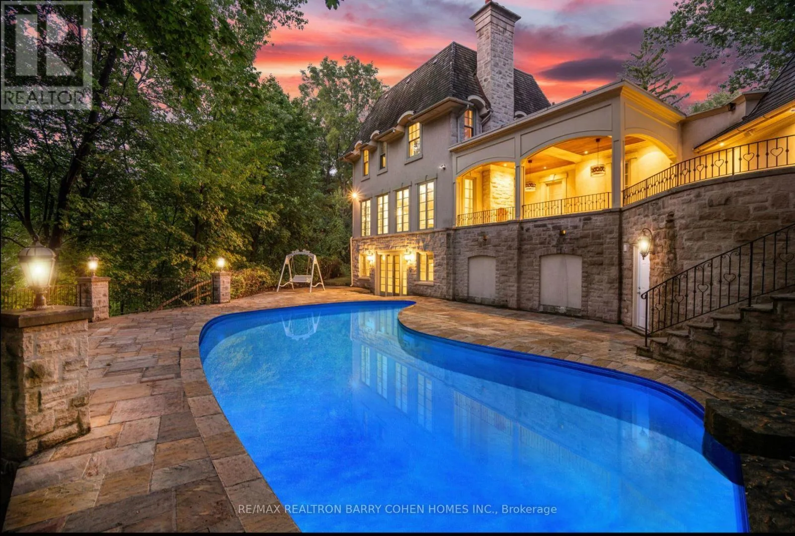 Yonge & York Mills Backs Onto Ravine! Perched gracefully at the highest point of Hoggs Hollow, this French Château inspired masterpiece sits on a spectacular 239.08 x 207.81 ft ravine lot (approx. 1.14 acres). Designed by Dee Dee Taylor Hannah and built by award-winning builder Michael Rossini, this timeless stone estate offers over 10,000 sq.ft. of luxurious living space, blending European elegance with modern comfort. The homes distinctive curved and symmetrical design showcases architectural artistry rarely seen today. Featuring 4 bedrooms with ensuites, 9 washrooms, and a 3-car garage with a circular driveway accommodating up to 15 cars, all principal rooms face west, overlooking the serene ravine. A grand marble foyer, curved hallways, and custom millwork opens to elegant living and dining rooms that walk out to the ravine and garden. Two libraries on main floor, five fireplaces, built-in speakers, 10-ft ceilings, and hardwood floors throughout. The gourmet kitchen with double granite islands and an open-concept family room with motorized curtains creates a warm and inviting space for entertaining.Step out to a 700 sq.ft. patio with outdoor fireplace and panoramic ravine views. The primary suite features a lavish 9-piece ensuite, his & her walk-in closets, and heated bathroom floors. The walk-out lower level wth heated floors includes a home theatre, wine cellar, sauna, wet bar, nanny/guest ensuite, and a recreation room with fireplace opening directly to the backyard oasis.The heated concrete pool with cascading waterfall, framed by mature trees, creates a private, resort-like retreat. A rare offering combining elegance, privacy, and tranquility, just moments from the Granite Club, top private schools (Crescent, TFS, Havergal, UCC, BSS), fine dining, and Rosedale & Don Valley Golf Clubs.A true statement of taste, craftsmanship, and enduring luxury in one of Torontos most prestigious enclaves. (id:27476)