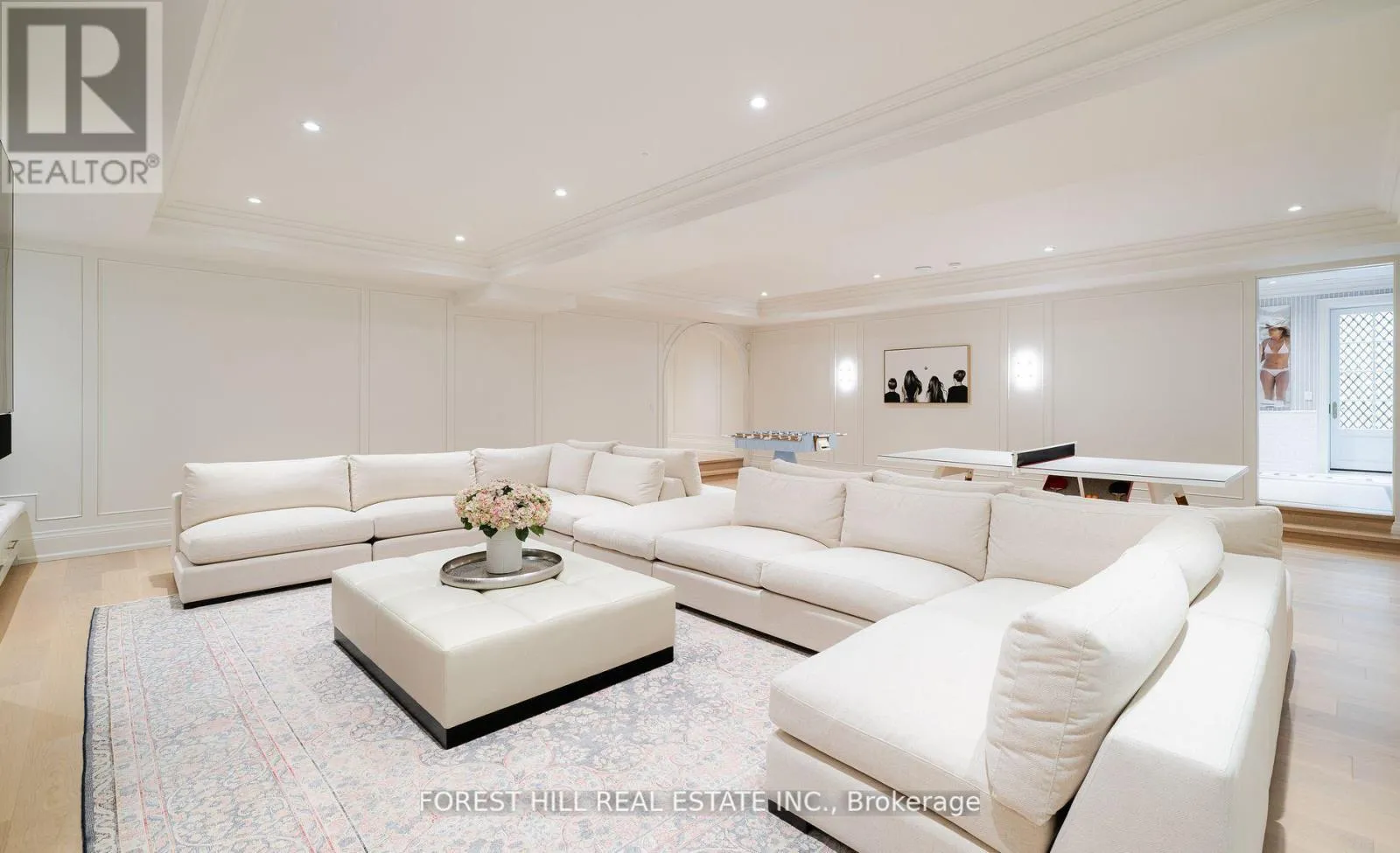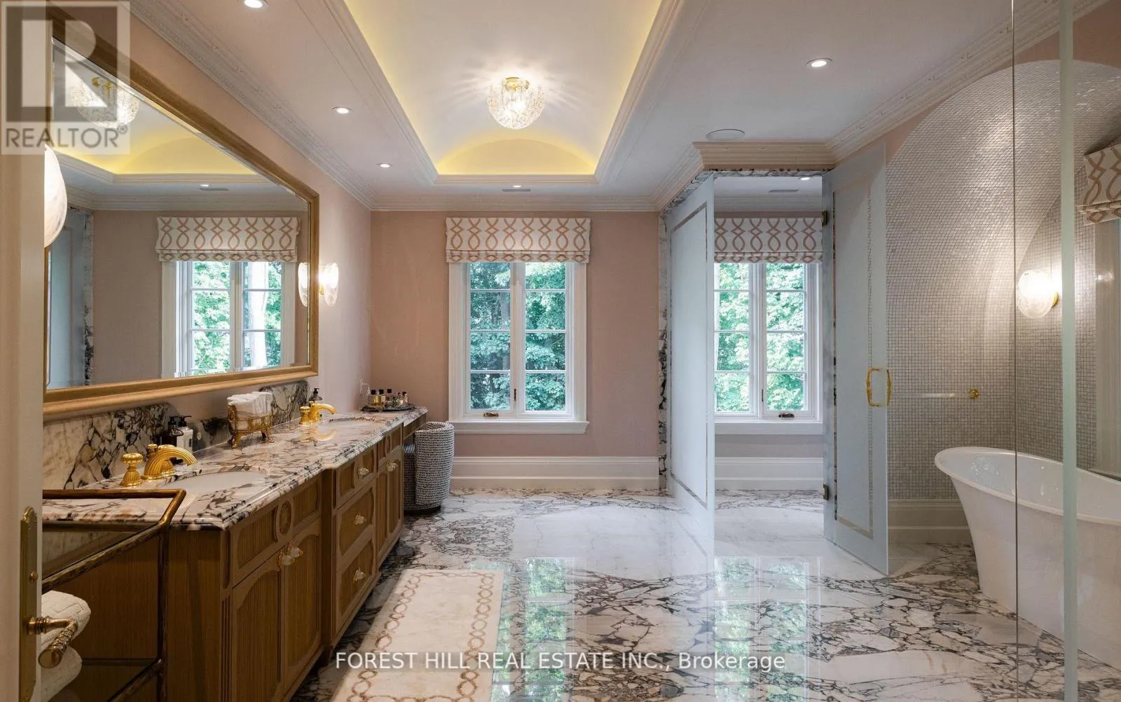Forest Hill Rd/Larratt St Welcome to 221 Forest Hill Road, an architectural triumph with nearly 13,000 sq ft of living space on a private 17,000 sq ft lot, nestled along the Beltline Trail in the heart of one of Toronto's most exclusive enclaves. This estate represents the pinnacle of bespoke luxury, meticulously brought to life by the city's finest: JTF Homes, Lorne Rose Architect, and Dvira Interiors. Clad in hand-selected limestone and inspired by the romance of the French countryside, the residence evokes the timeless elegance of a Provencal chateau. Arched windows with weathered-blue shutters, a stately turret, and a gracefully symmetrical facade create a striking first impression. A dramatic arcaded loggia opens onto manicured grounds and landscaping imagined by Fitzgerald and Roderick, featuring a lap pool, sports court, and lavish gardens that offer privacy and tranquility. The interiors are nothing short of breathtaking curated blend of old-world grandeur and modern refinement. The main level features soaring ceilings and a dramatic spiral staircase. Chevron-patterned white oak floors, arched passages, imported wallpaper, and tailored lighting reflect impeccable attention to detail. The formal dining room (seating 20) flows effortlessly into a statement kitchen adorned with hand-painted Portuguese tiles and custom cabinetry by Emanuele Furniture Design. The sunlit family room is anchored by a hand-carved fireplace and opens onto the gardens through elegant French doors. The crown jewel is the primary suite, a true sanctuary with vaulted ceilings, whimsical wallpaper, arched detailing, and a fireside lounge that creates a retreat-like atmosphere. The piece de resistance: a couture-inspired, two-storey dressing room with a spiral staircase and chandelier, paired with a spa-like ensuite clad in expansive stone and Shirley Wagner fixtures. The lower level features a sprawling rec room, games lounge, prep kitchen, gym, cedar sauna, and a home theatre for the ultimate cinematic escape. (id:27476)