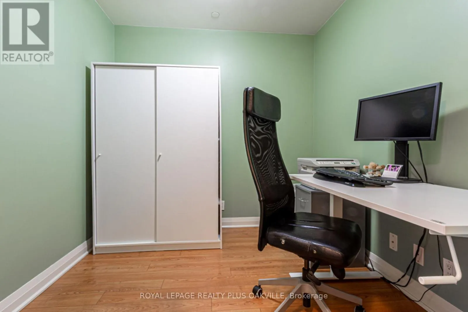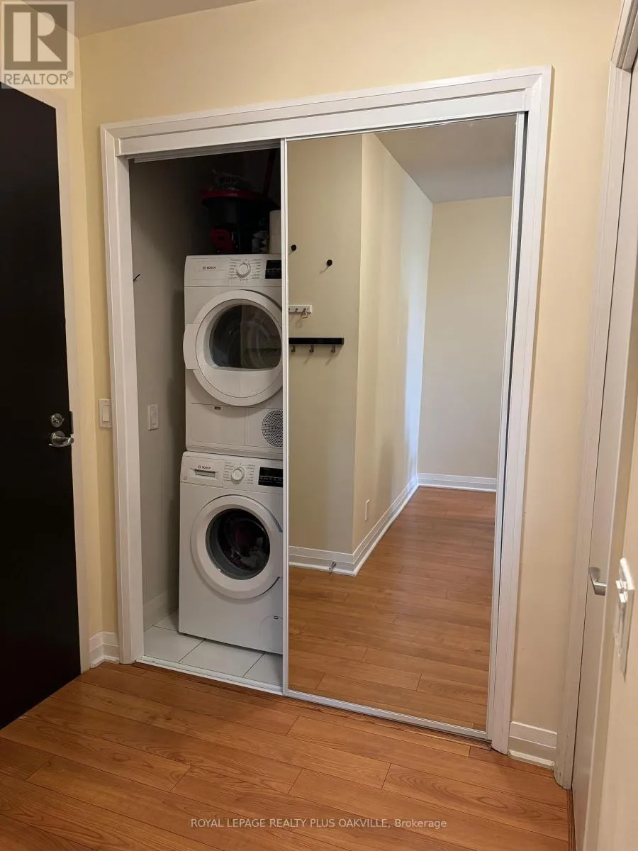 Burnhamthorpe/Hwy 427 This 5th floor, 1-bedroom + den condo in Valhalla offers just under 700 sq ft of living space with an open-concept layout and floor-to-ceiling windows. The den, measuring 8 x 8 feet, can serve as an office or potential second bedroom. The main living area includes an additional office nook, while the kitchen features a large movable island and pantry. The bedroom, which fits a queen bed, has a walk-in and a linen closet. Recent updates include bedroom laminate flooring (2016), a Bosch washer and dryer (2018), a Bosch dishwasher (2022), pull down window blinds (2024) and front entrance sliding mirror closet doors (2025). Valhalla provides numerous amenities for residents. The building offers 24-hour concierge service, multiple gyms, an indoor pool and hot tub, yoga rooms, saunas, a theatre room, a billiard room, a children's play room, and two party rooms. Three guest suites are available for rental, and the building is pet-friendly, allowing two pets per unit. The condo's location near the parking spot and storage on the 3rd floor adds convenience. With low-cost internet options and a policy against short-term rentals, Valhalla combines comfort and practicality for its residents. (id:27476)