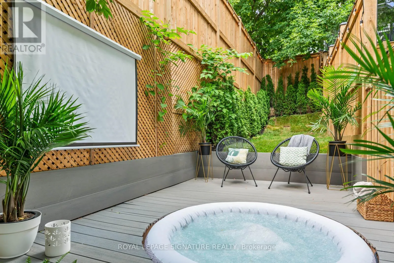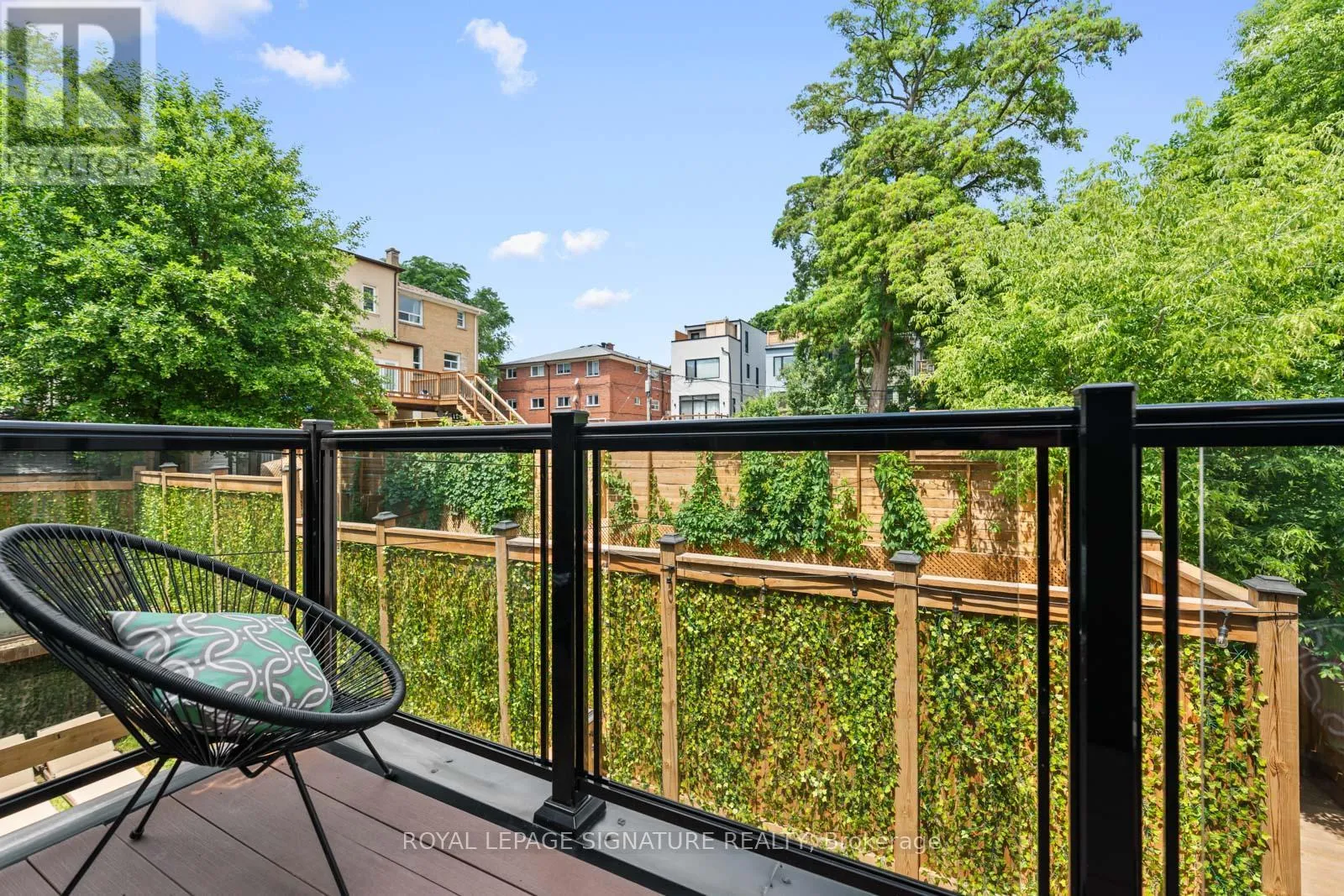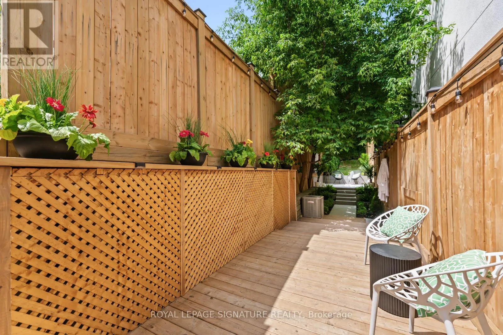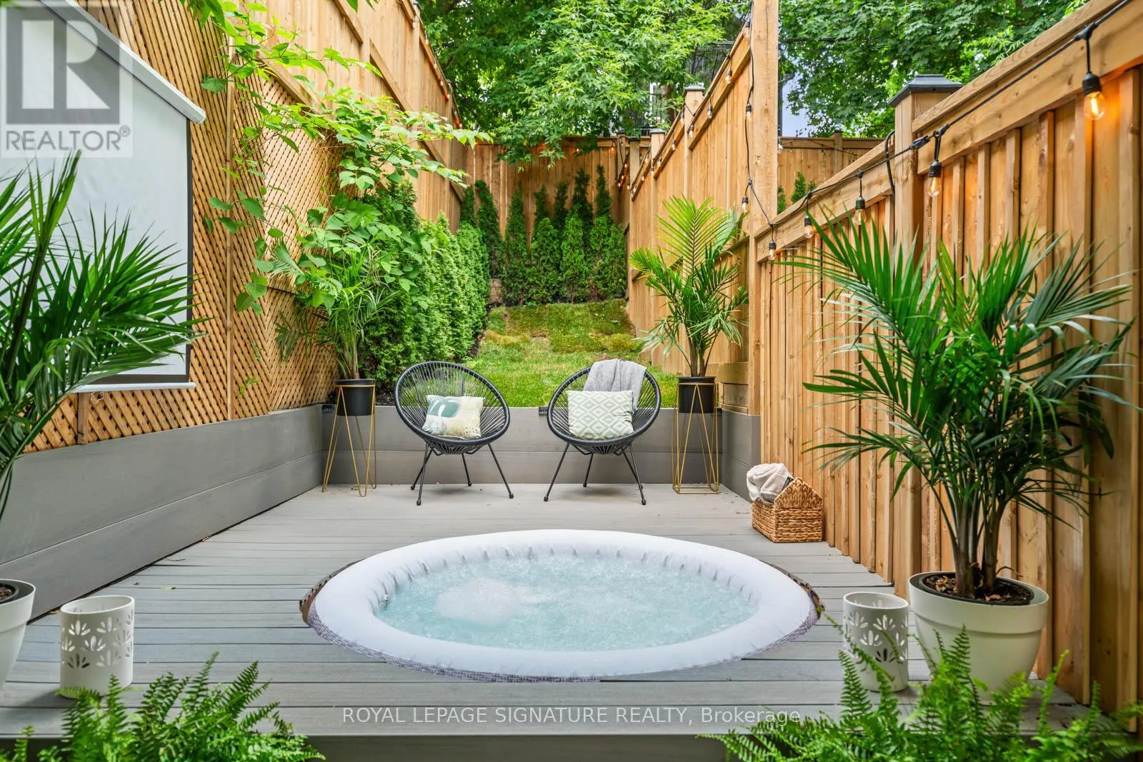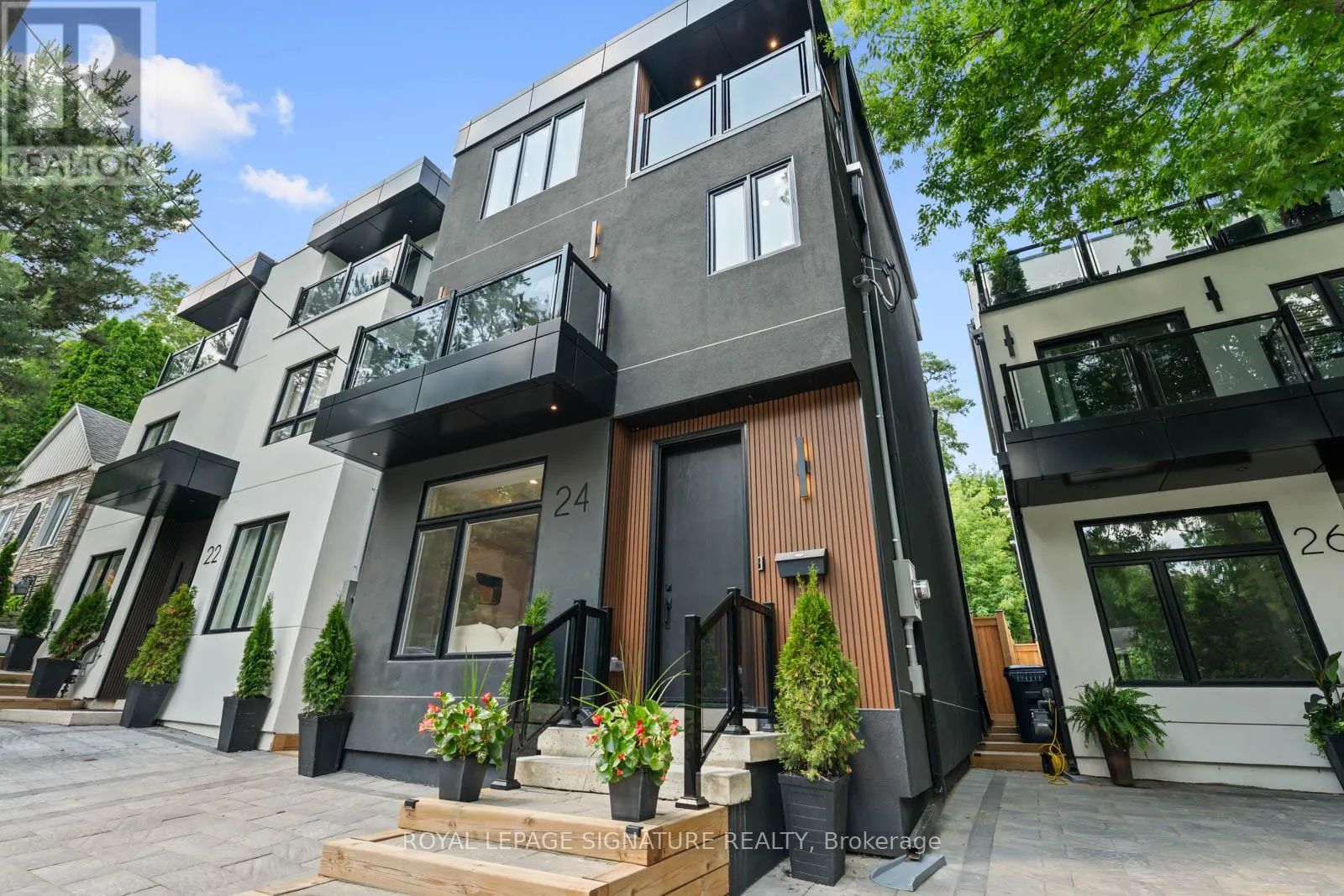 Leslie St & Gerrard St E Your Private Oasis in Prime Leslieville!! Welcome to 24 Harriet St! This one-of-a-kind, custom built, detached 3-storey modern masterpiece is nestled on a quiet street in the heart of vibrant Leslieville, just steps to Queen East, trendy cafes, parks, and more. Step into your own private backyard retreat complete with a hot tub, mature trees, privacy fencing, and a massive entertainers deck, perfect for summer nights, outdoor movies, and unforgettable gatherings! Inside, this thoughtfully designed home stuns with its soaring ceilings, wide-plank engineered hardwood floors, and in-ceiling speakers throughout. The gourmet kitchen is a chefs dream with quartz countertops and backsplash, built-in panelled fridge, gas range with pot filler, ample storage, and a large island with seating. The dining area features a stylish feature wall, floating shelves, and custom built-ins, all flowing into a sun-drenched living space with floor-to-ceiling sliding doors for seamless indoor/outdoor living. The upper levels boast three spacious bedrooms, each with their own private balcony, generous closet, and spa-like ensuite bathroom. The luxurious primary suite includes a custom walk-in closet, 2 private balconies and a six-piece ensuite with soaker tub, glass shower, and double vanity. Elegant oak stairs with glass railings enhance the modern aesthetic and open flow. Don't miss this rare opportunity to own a turnkey designer home in one of Torontos most desirable neighbourhoods! (id:27476)