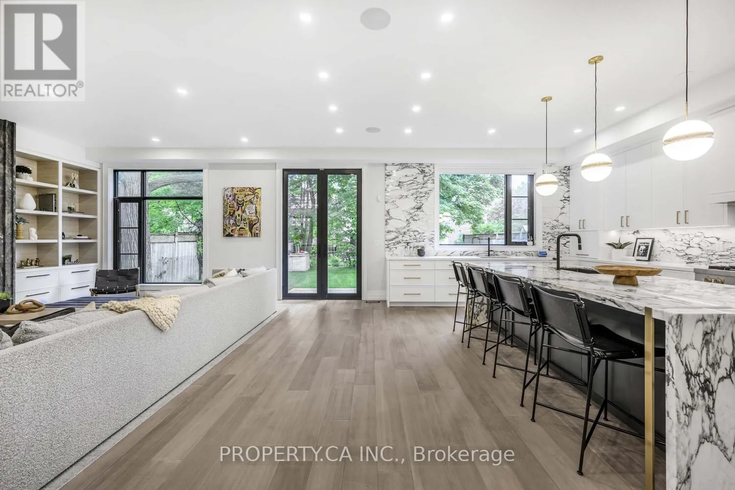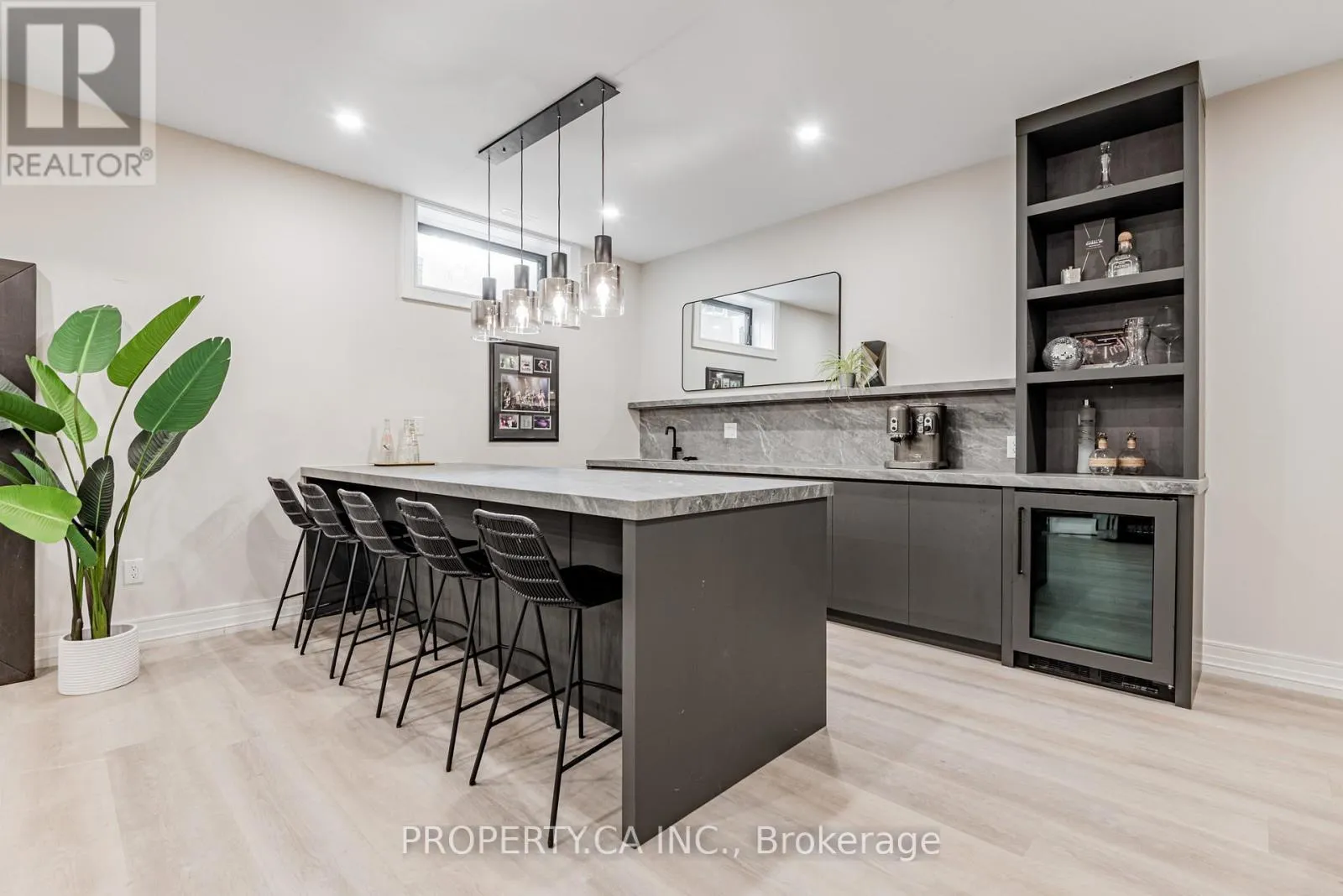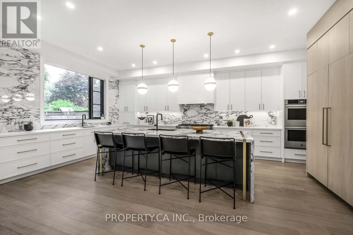 Bathurst And Lawrence Welcome to 8 Manor Haven Road A Custom Home Across from the Park!This beautifully designed 4+1 bedroom, 6-bathroom home offers over 3500 sqft luxurious living in a prime family-friendly location. Designed by Shaun Lipsey, it features premium finishes and a thoughtful, functional layout throughout. The main floor features 10ft ceilings, pre-engineered hardwood floors, pot lights, and floor-to-ceiling inline windows that flood the home with natural light. Spacious principal rooms include a formal living room and a large separate dining room, ideal for entertaining. The chefs kitchen by California Kitchens is a true showstopper, equipped with top-of-the-line JennAir appliances, including a side-by-side fridge and freezer, two wall ovens, and a massive 10-ft island with ample seating. A dedicated prep space with drink fridge, paired with a huge walk-in pantry offer exceptional storage and prep space. The family room features a cozy fireplace framed by a stunning floor-to-ceiling granite feature wall, creating a dramatic and welcoming focal point.Upstairs, you'll find four spacious bedrooms and three full bathrooms, including a primary retreat with a walk-in closet by Closets by Design and a spa-like ensuite with heated floors.The finished basement offers 1570 sqft includes a fifth bedroom, full bathroom, and a large open-concept rec space ideal for a home office, gym, or guest suite. A built-in bar adds flexibility for entertaining. Additional highlights include a heated mudroom, built-in Sonos surround sound, gas BBQ hookup, and a large private backyard. Located directly across from a park, this home delivers top-tier quality, comfort, and modern family living (id:27476)