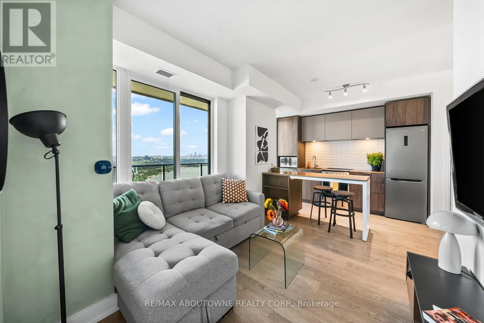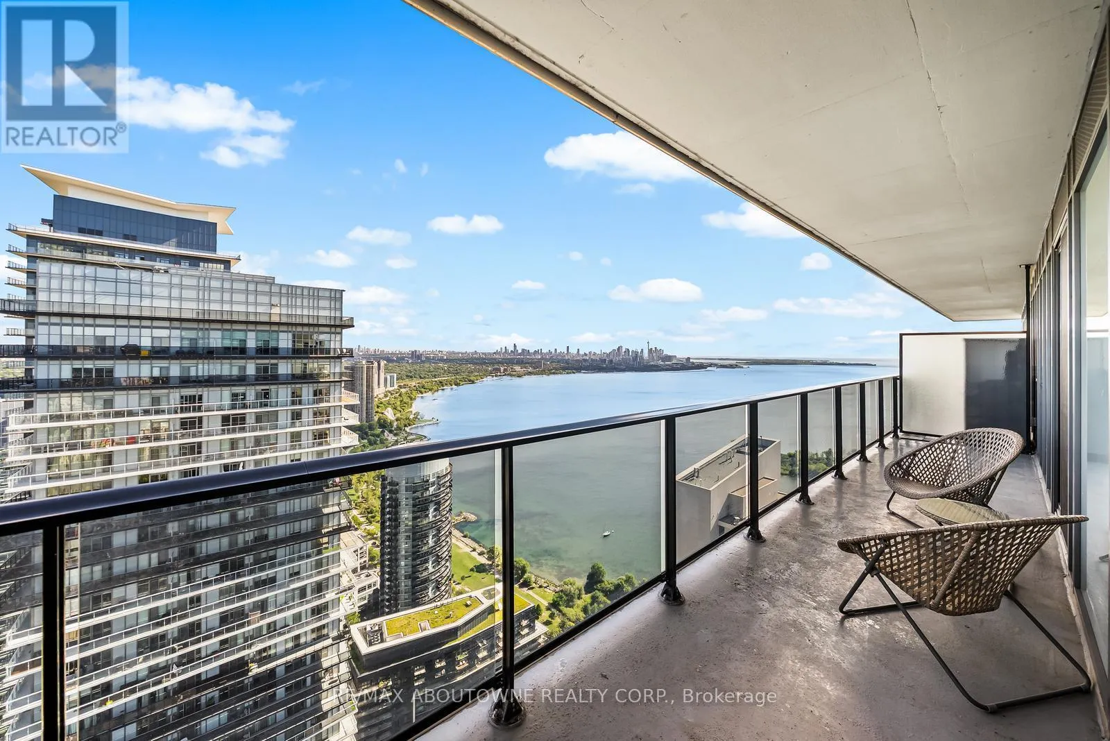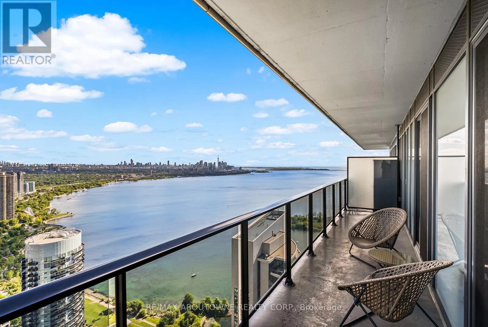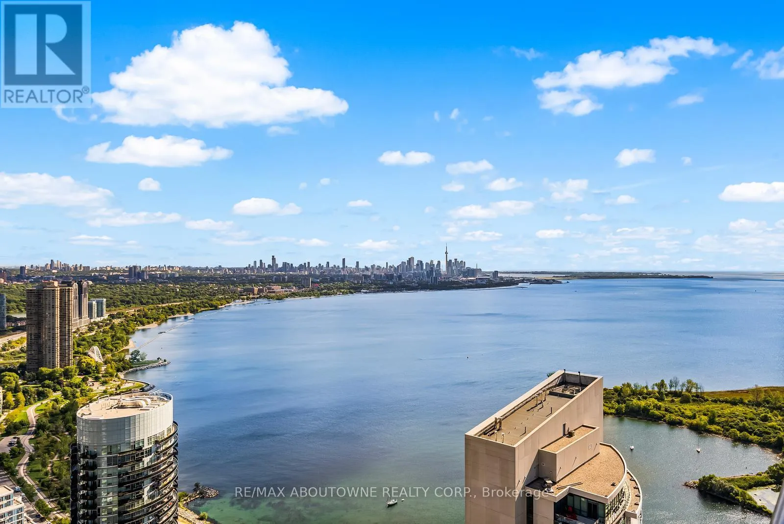 Cross Streets: Lakeshore Rd W & Silver Moon Dr. ** Directions: Park Lawn Rd, Lakeshore Rd W &Silver Moon Dr. Welcome to Vita on the Lake, where luxury living meets an unparalleled waterfront lifestyle. Perched on the 51st floor, this one-bedroom plus den residence offers breathtaking, unobstructed panoramic views that sweep across Lake Ontario, the downtown Toronto skyline, and the Humber Bay shoreline. Every glance out of the floor-to-ceiling windows is a reminder that you are living above it all, surrounded by light, water and sky. With approximately 615 square feet of thoughtfully designed interior space and an oversized 165 sq ft balcony, this suite is perfect for both everyday living and entertaining. The open-concept layout blends a modern kitchen complete with quartz countertops, integrated appliances, and sleek cabinetry with a bright living and dining area. The versatile den provides an ideal space for a home office, nursery, or guest bedroom, and two spa-inspired bathrooms. This unit also includes one parking space and one locker for added convenience. Whether you're relaxing on your balcony watching the sunrise, hosting friends against a glittering skyline backdrop, or enjoying lakeside trails right outside your door, A seamless blend of lakeside calm and downtown energy. Enjoy premium amenities including 24-hour concierge service, an outdoor pool, sauna, fully equipped fitness and yoga studios, elegant party and dining rooms, and comfortable guest suites for visiting friends and family. Located in Toronto's coveted Humber Bay Shores community, you are just steps to waterfront parks, the scenic boardwalk, popular cafés, and convenient shopping. TTC, Metro, and Mimico GO Station are moments away, providing quick connections to downtown, while the Gardiner Expressway and QEW offer effortless access to the rest of the city. (id:27476)