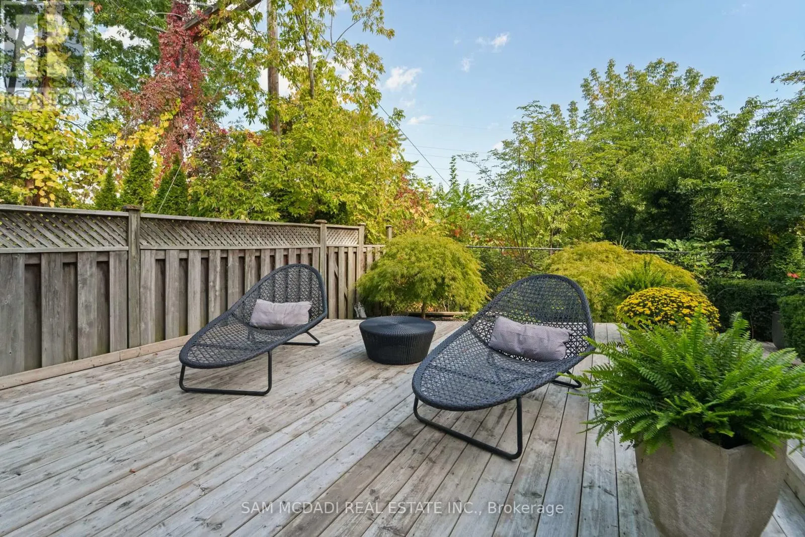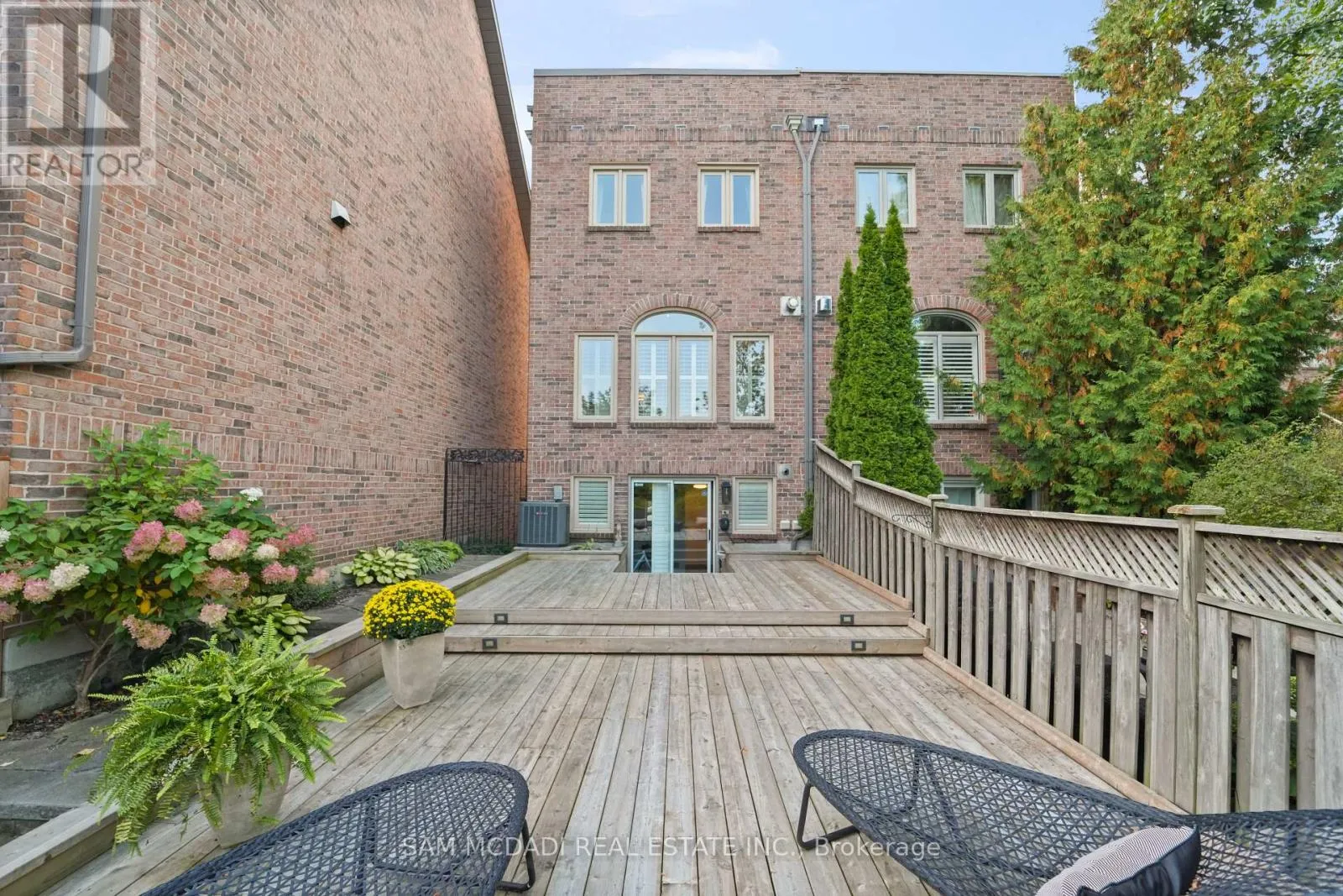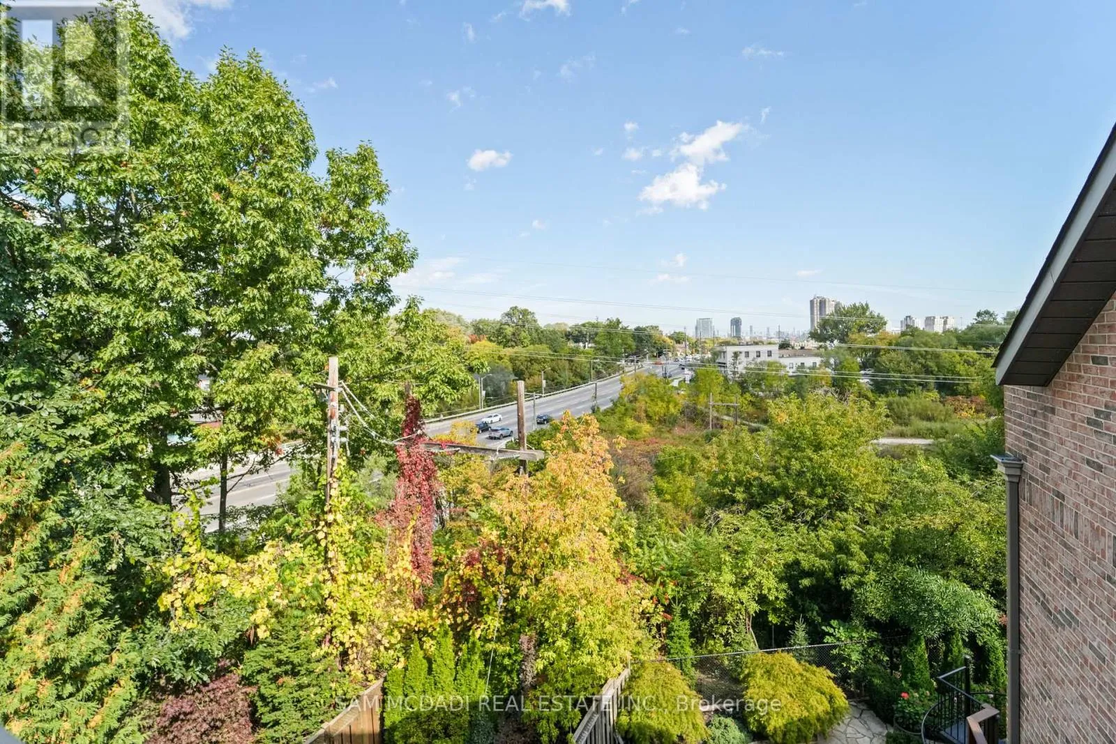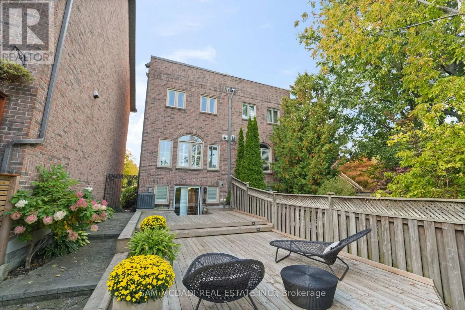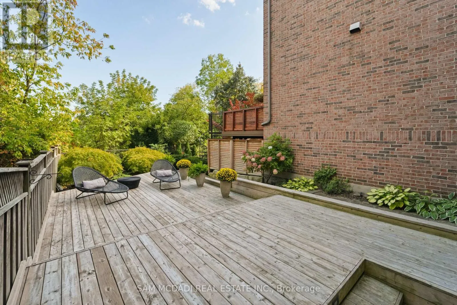 Cross Streets: Grand Avenue/Queensway. ** Directions: Queensway West of Park Lawn to Grand Ave. Located just minutes from downtown Toronto, High Park, The Kingsway, and the vibrant Bloor West Village, this impeccably maintained executive end-unit townhome is tucked away on a rare and expansive ravine lot, offering exceptional privacy and tranquil views. The highly sought-after 16-foot-wide model features a sleek, contemporary design paired with a warm and inviting atmosphere, all within a bright, open-concept layout. Inside, you'll find soaring 9-foot ceilings, gleaming hardwood floors, and generously sized principal rooms. The walkout basement adds functional living space, while the top-floor sundeck provides the perfect setting for a private bedroom retreat or home office complete with rough-in plumbing for added flexibility. On the main level, the sun-filled eat-in kitchen boasts granite countertops, a stylish backsplash, and stainless steel appliances. The open-concept layout flows seamlessly into the living and dining areas, making it ideal for both everyday living and entertaining. Step outside to the beautifully landscaped, ravine-backed backyard, a serene, private space divided into two thoughtfully designed zones. The newer deck flooring, ambient lighting, and natural surroundings create an ideal spot for summer evenings and quiet relaxation. This impressive home effortlessly combines urban convenience with the peaceful charm of nature, a rare gem not to be missed. (id:27476)