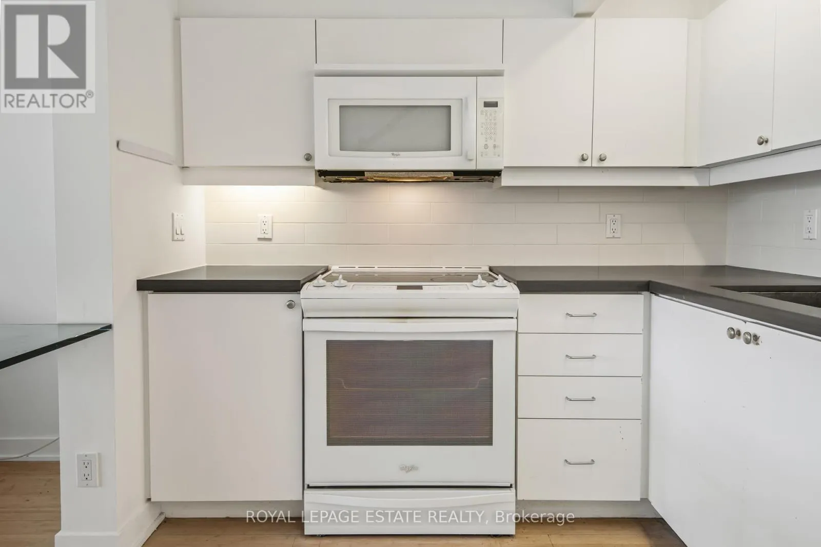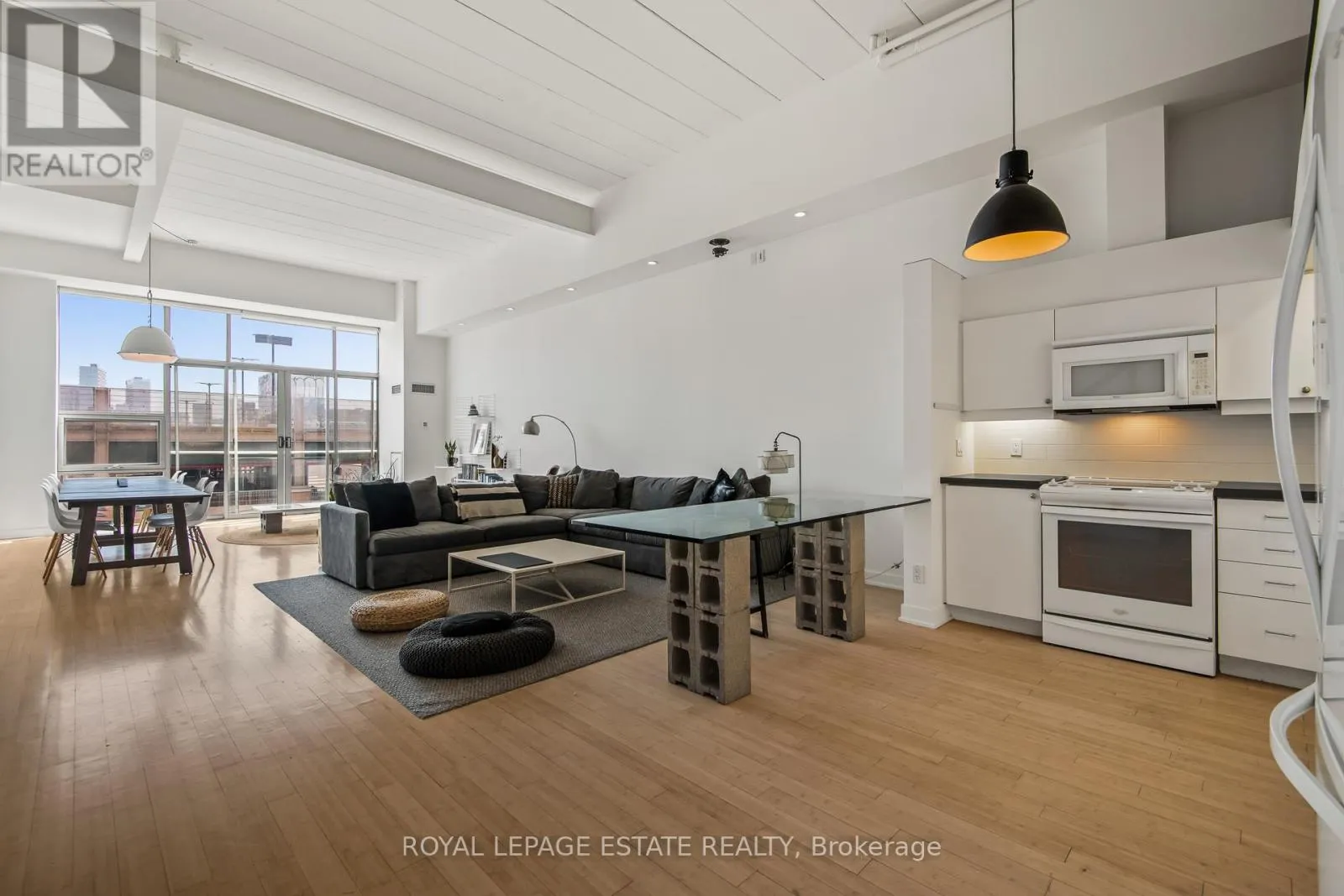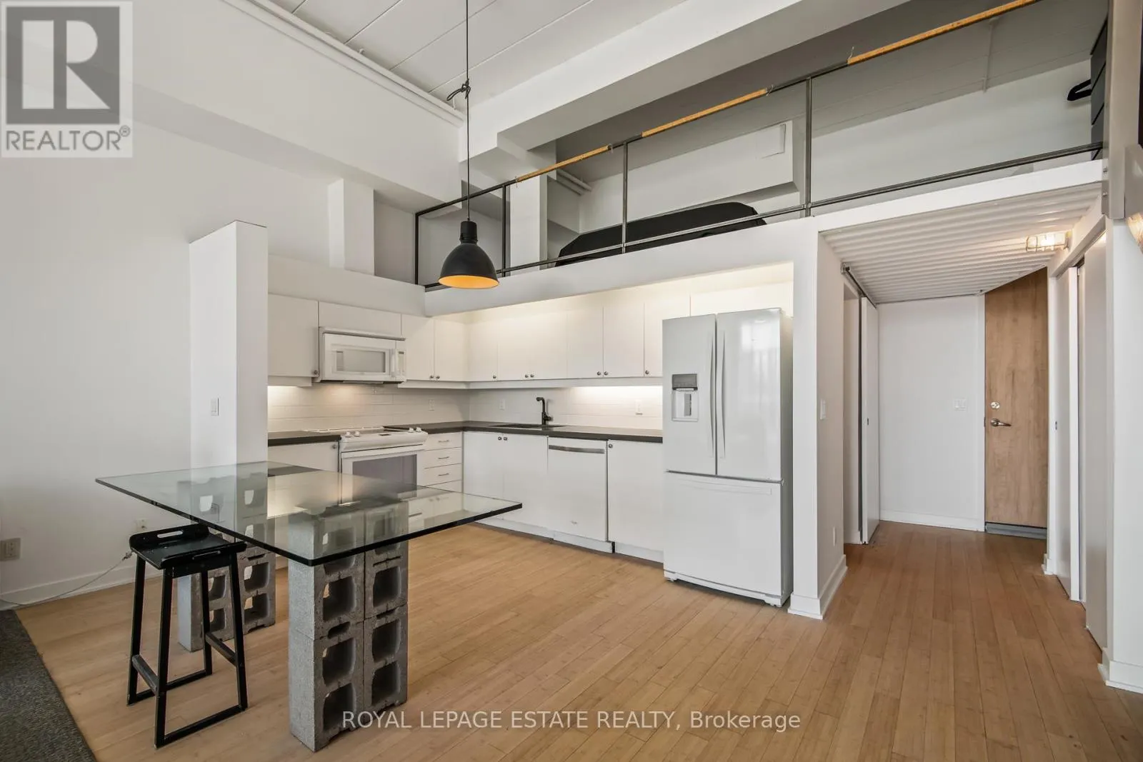 Spadina & College Welcome to Kensington Market Live/Work Lofts. Suite 301 is a magnificent south facing authentic 2 storey hard loft with unparalleled aesthetic grandeur. Possessing more than 1000 square feet, sprawling 13' + ceilings, dramatic wall to wall windows and Juliette balcony. Features include an open concept kitchen with ample storage, spa-like bath with ensuite laundry, hardwood floors throughout and a generous bedroom mezzanine level that spans entire width of the unit. The space is awash in sunlight, has cityscape views and has been meticulously curated. This genuinely expansive canvas is rarely found and hypnotising upon entry; personal design possibilities are limitless. The size and scale of the space are truly awe inspiring allowing for bold choices and endless configurations. This is a rare opportunity to fully realise your creative vision in a low turnover 7 storey boutique building in the true heart of Kensington market. The neighbourhood is vibrant, alive with a deep rooted sense of community. Every conceivable resource and amenity are steps away; shops, restaurants, TTC, schools, museums. Walk and Bike score of 100, no need to be hassled by driving. Building amenities include a lovely courtyard with picnic area and large party room. This space is dreamy and not to be missed. parking avail to rent in building and monthly permitted parking available at Green P across the street at discounted rate. (id:27476)
