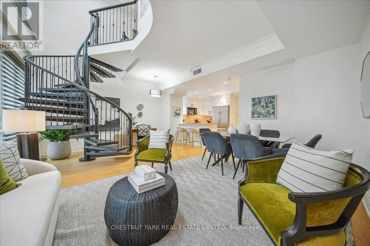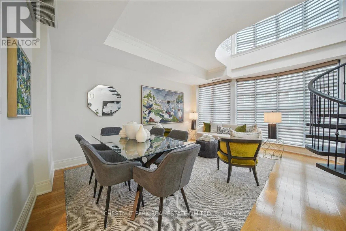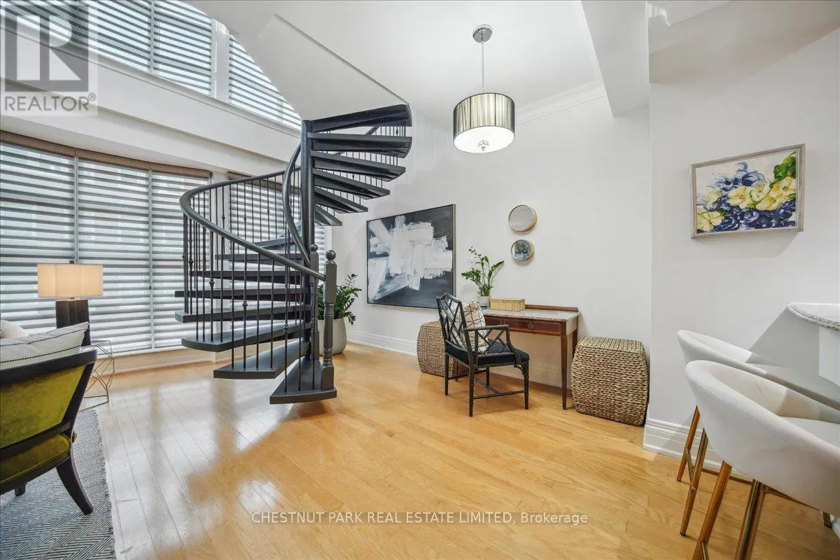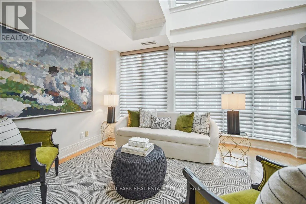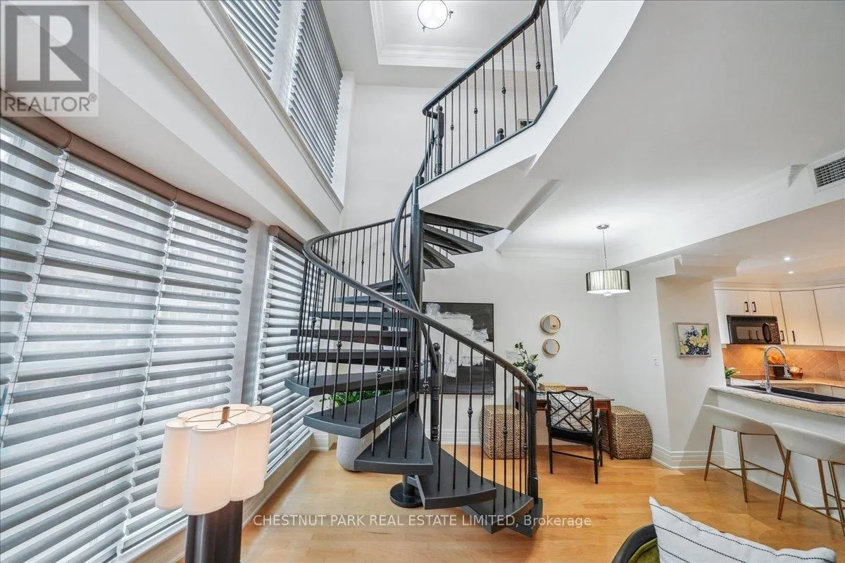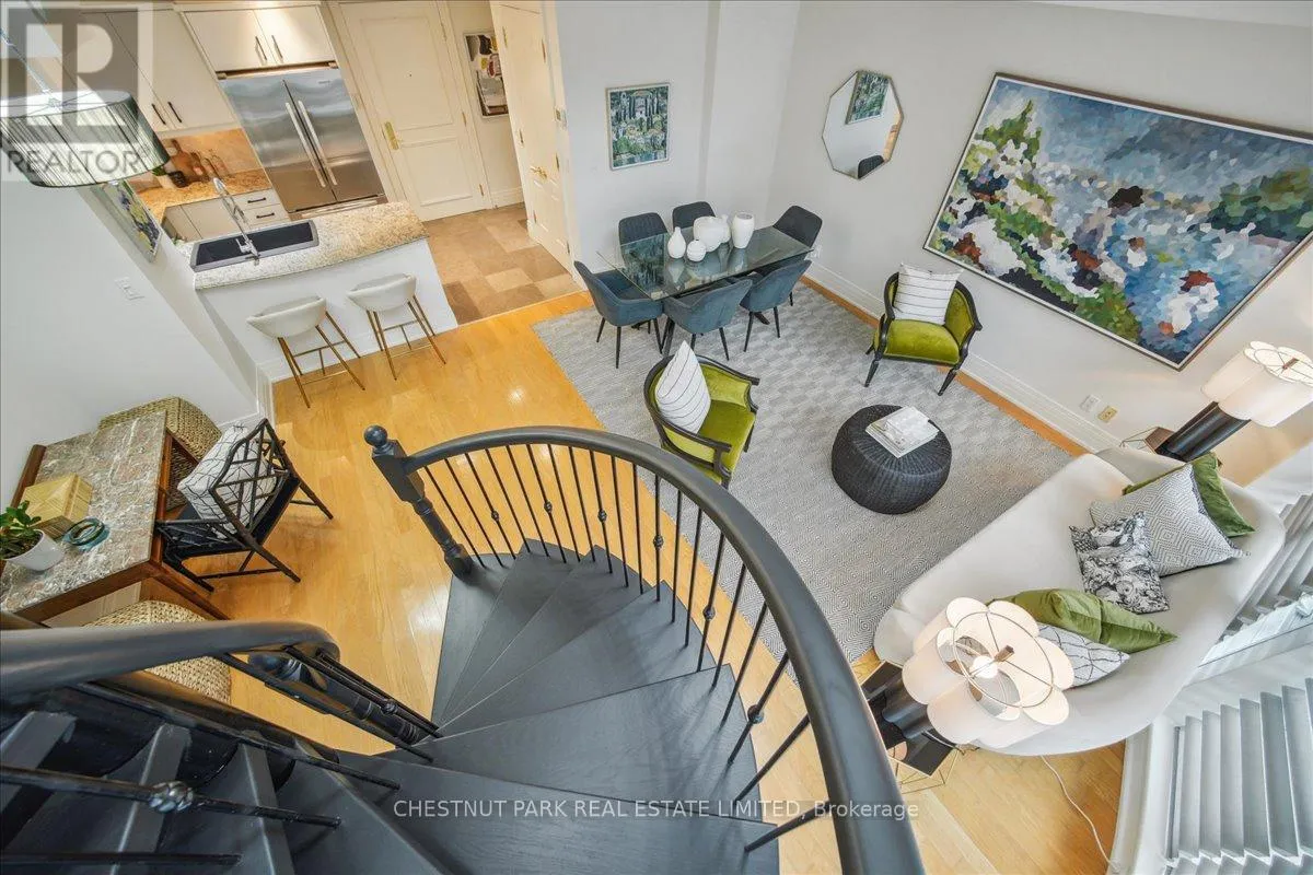 Yonge & St Clair Unbelievable value! Luxurious, rare, 2-storey 1-bedroom plus den in a distinguished boutique building. Midtown, Yonge and St. Clair, parking and locker. Incredible opportunity, dramatic and refined, this unique two-storey residence features 18 feet of floor-to-ceiling windows flooding the space with natural light. A sweeping circular staircase and gleaming hardwood floors set the tone for elegant urban living. The living room boasts 10 feet ceilings while the kitchen is equipped with granite counters, a full-size refrigerator, and a brand-new Bosch oven. Finishing off the main floor is a spacious powder room. An impressive primary bedroom offers a spa inspired ensuite with a deep tub and two closets-one walk-in, both with custom-fitted California closets. A built-in bookcase anchors the perfect work-at-home den. The suite has been freshly painted throughout and has automatic blinds for effortless comfort. Enjoy full-service 24-hour concierge and porter service, indoor pool, serene landscaped courtyard, inviting party room, and gym. 'The building's impressive limestone facade and grand circular drive add timeless curb appeal. Cable TV and internet are included in maintenance, and there's a convenient secondary suite entrance /exit from the 3rd floor. Pet-friendly, one dog (under 75 lbs.) or two cats permitted. (id:27476)