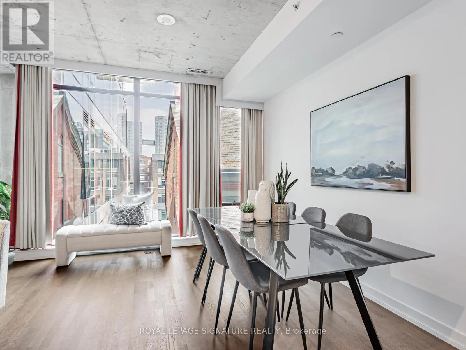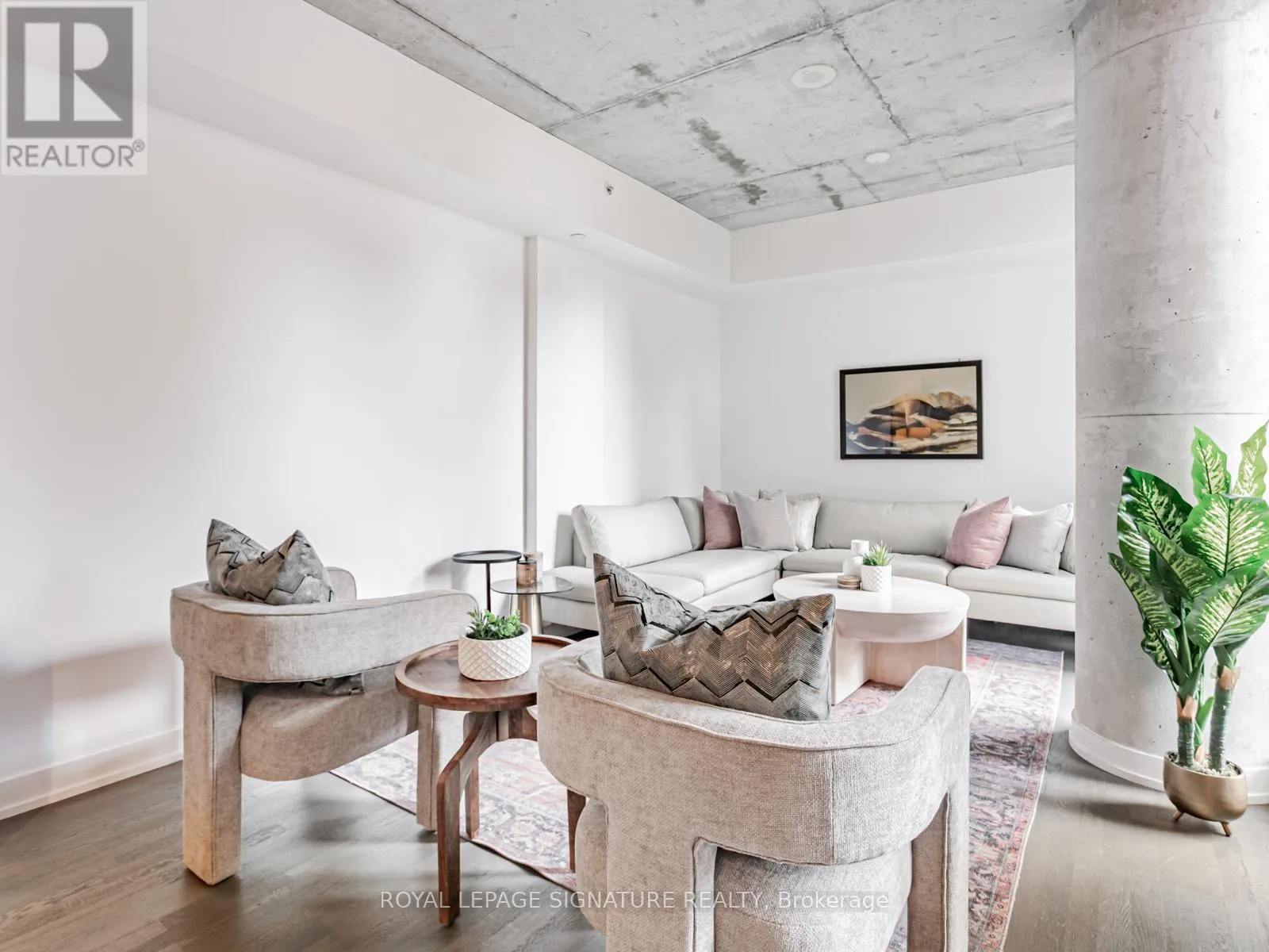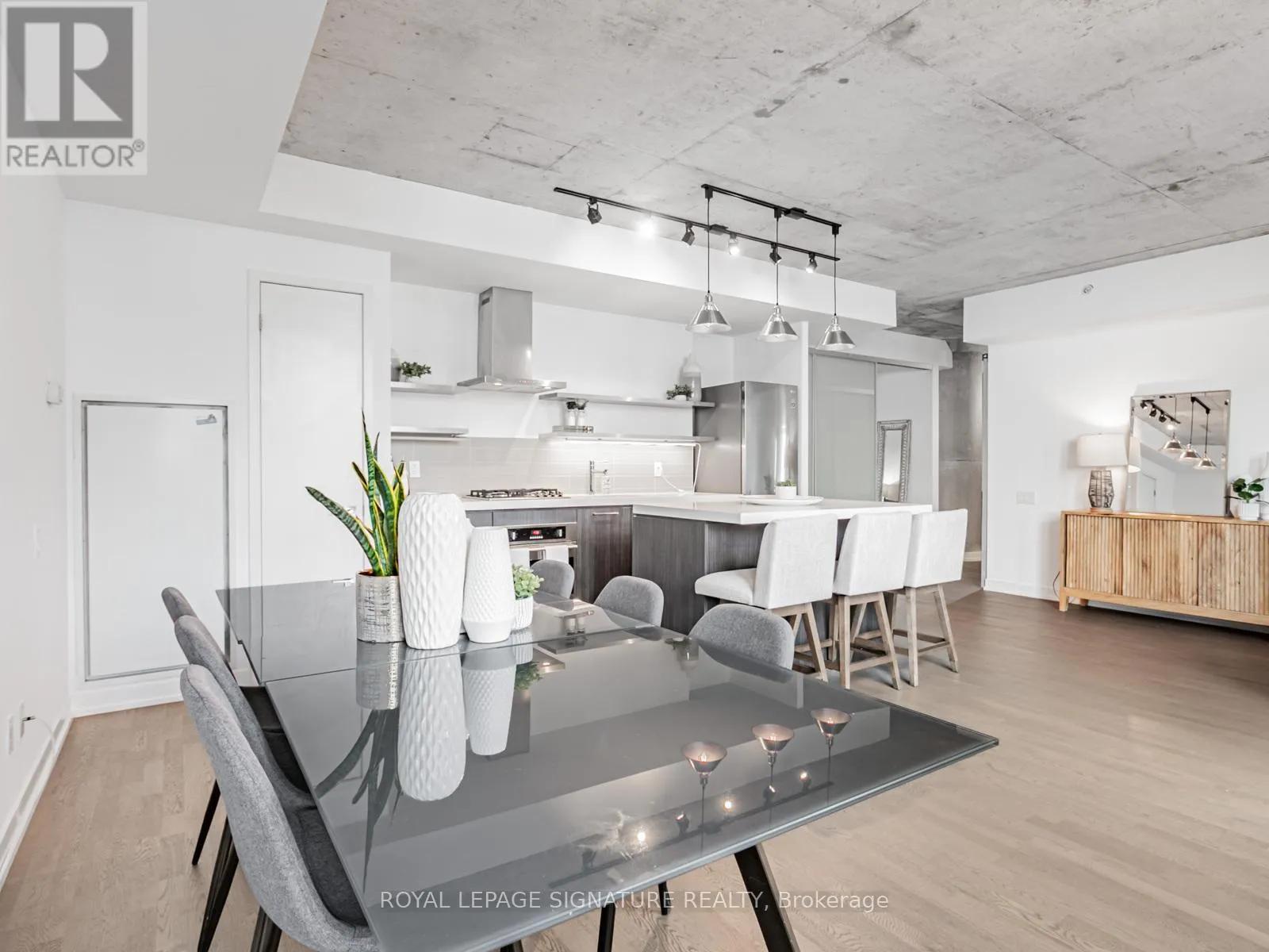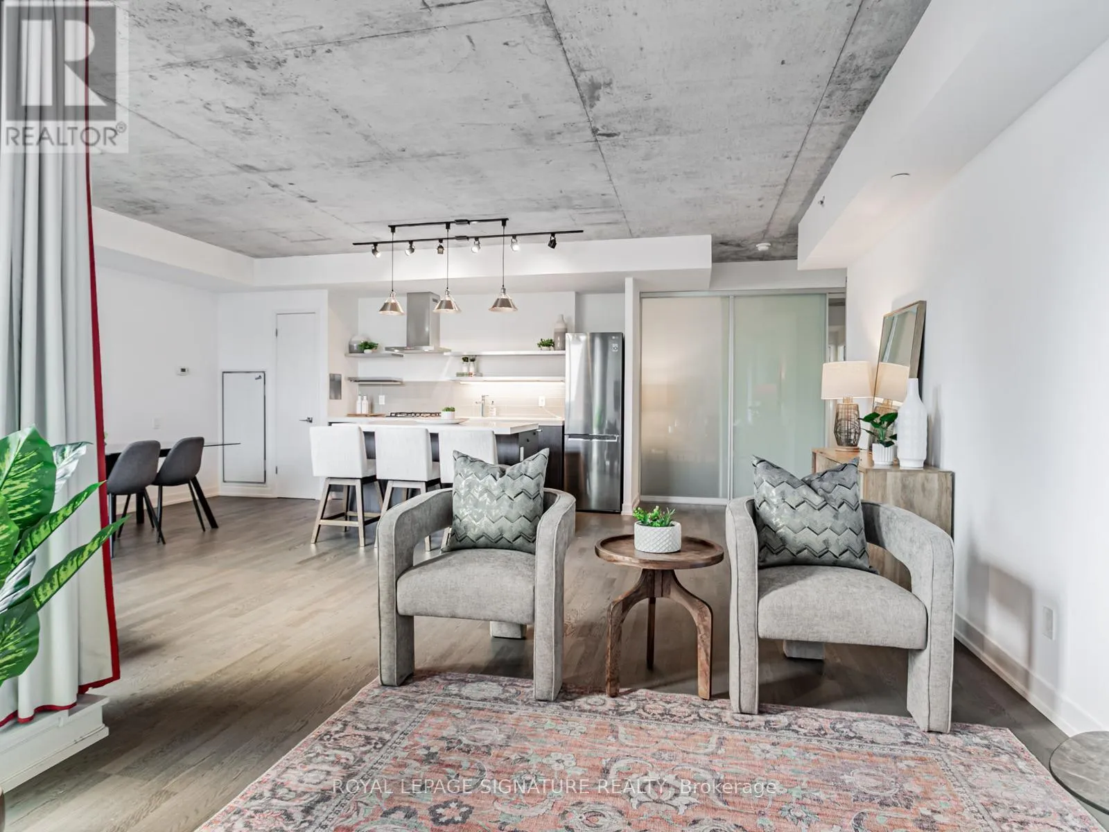 Cross Streets: King/Portland. ** Directions: North Side of King. Big Loft Energy at Fashion House! Nearly 1000 sq ft of bold, open-concept living in one of King West's most iconic addresses. This oversized loft blends urban edge with soft sophistication - think soaring ceilings, exposed concrete, wide-plank hardwood floors, and a gallery-like layout that's made for entertaining. The sleek chefs kitchen features stone counters, premium appliances, and a generous island that anchors expansive living and dining zones. The king-sized bedroom is tucked away for privacy and boasts a dreamy walk-in closet, while a spacious separate den easily works as a stylish home office or a second bedroom. Underground parking included - a rare luxury in this prime location. Fashion House is beloved for its boutique feel and jaw-dropping rooftop infinity pool overlooking the skyline. Residents enjoy a 24-hour concierge, gym, party room, guest suites, and a lobby with serious red-carpet energy. Steps to The Well, Waterworks Food Hall, Lee, Gusto 101, Buca, the Financial District, Queen West, and the waterfront. This isn't just a loft. Its a lifestyle. Big space. Big style. Big energy. Don't sleep on it - your next chapter starts here. (id:27476)