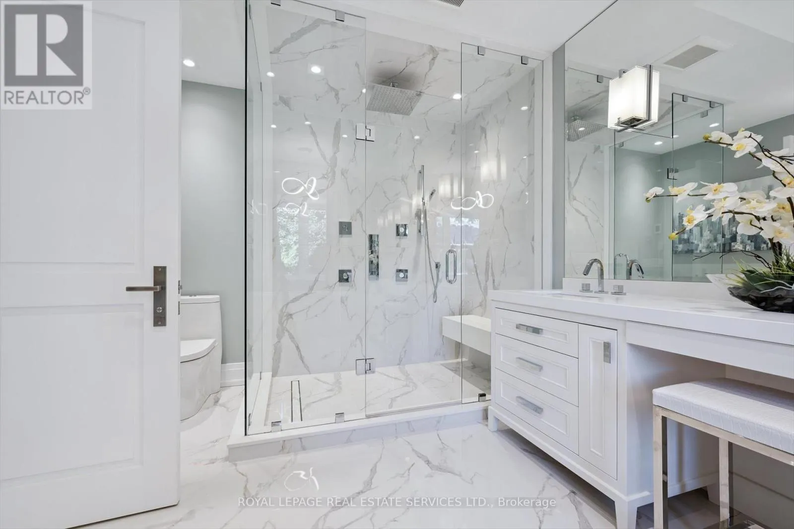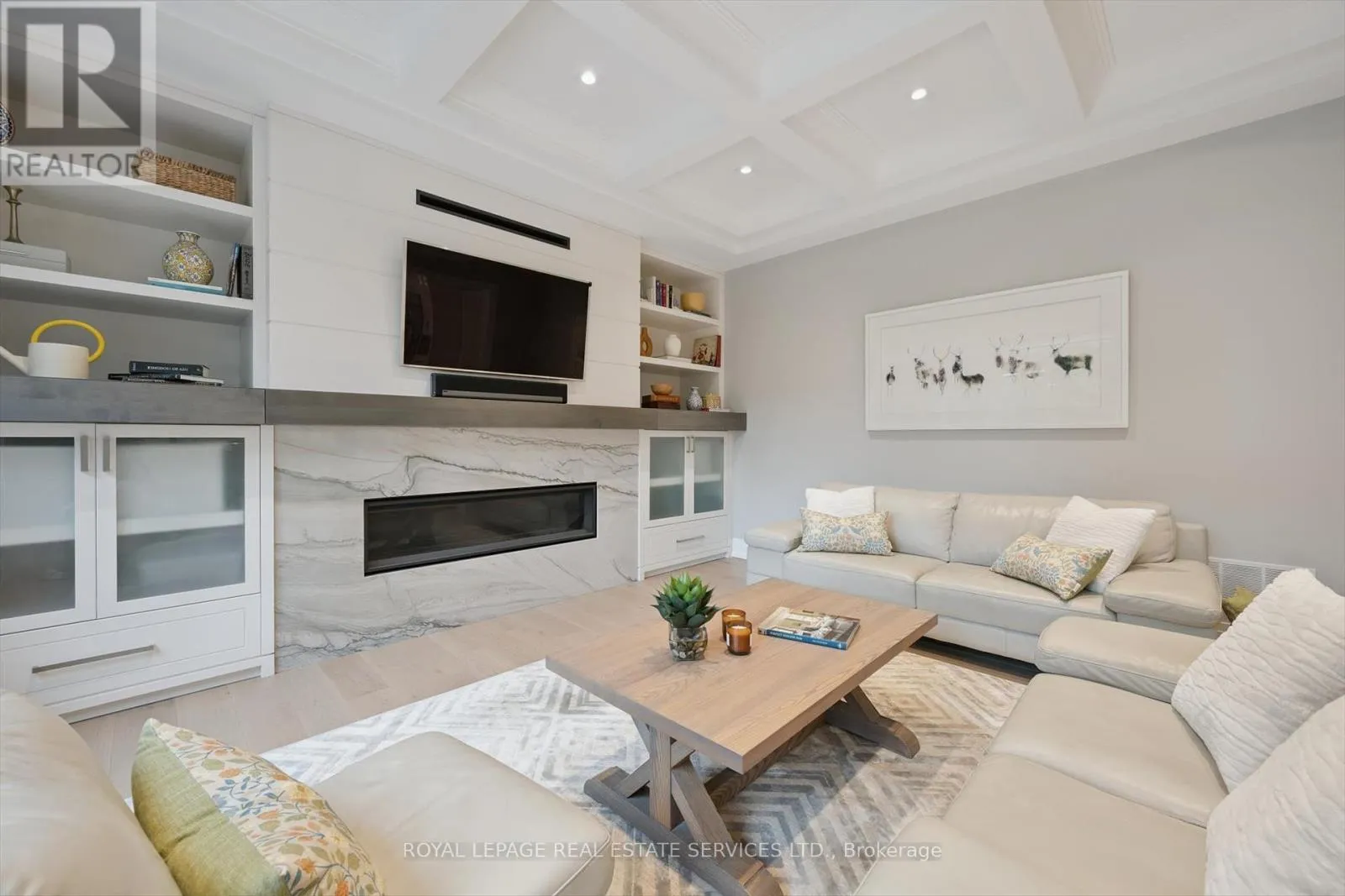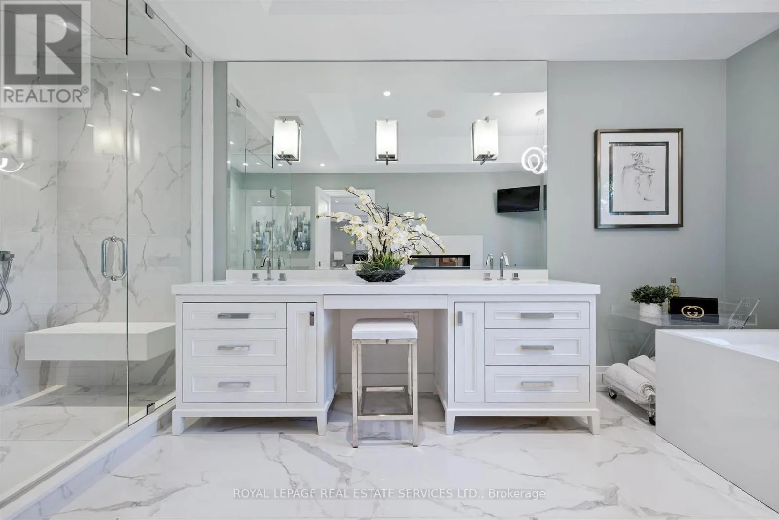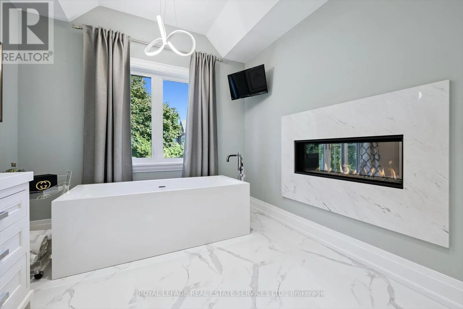 Cross Streets: Burnhamthorpe Road and Shaver Avenue North. ** Directions: Burnhamthorpe Road / Shaver Avenue North / Westglen Crescent. AS FEATURED ON CTV LIFE CHANNEL'S LISTING LARGE! This exquisite custom-built residence blends modern sophistication with timeless elegance. Built in 2019 and offering approx. 3,700 SF above grade plus a fully finished lower level, this exceptional Glen Park home showcases meticulous craftsmanship, refined finishes, and thoughtful design at every turn. The brick and stone exterior opens to a grand, light-filled interior with engineered hardwood floors, intricate millwork, custom-matched vents, and striking architectural details. The impressive foyer features a remote-lowering chandelier, white oak floating stairs with pin lighting, feature wall with sconces, and skylight with mood lighting. The round double-height living room welcomes an abundance of natural light while the formal dining room boasts an elegant ceiling design and pot lighting. A private office with custom built-ins and a live-edge desk combines beauty and function. At the heart of the home lies a chef's kitchen with custom cut quartzite waterfall island, counters, and backsplash, GE Monogram appliances, Bosch Wi-Fi coffee station, pot filler, and a concealed prep kitchen with swing door. The adjoining family room invites connection with its waffle ceiling, gas fireplace, and built-in display cabinetry. Upstairs, the luxurious primary suite offers a tray ceiling, two-sided fireplace, extensive built-ins, walk-in closet and a private balcony overlooking the mature backyard. The spa-inspired ensuite features a freestanding air tub, double vanity with make-up centre, and glass shower with rain head and body jets. A junior suite with balcony and ensuite complements two additional bedrooms joined by a heated-floor Jack-and-Jill bath. The fully finished lower level impresses with radiant in-floor heating, a tiered theatre with KEF speakers and BenQ projector, vibrant red quartz wet bar, office/craft room, gym, and walk-up to the beautifully landscaped backyard with stone patio, glass panels, and BBQ hookup. (id:27476)
