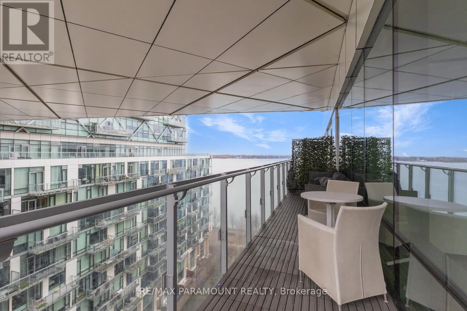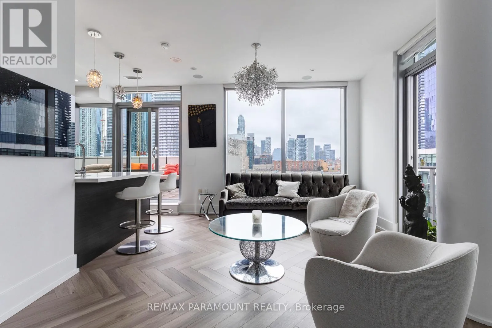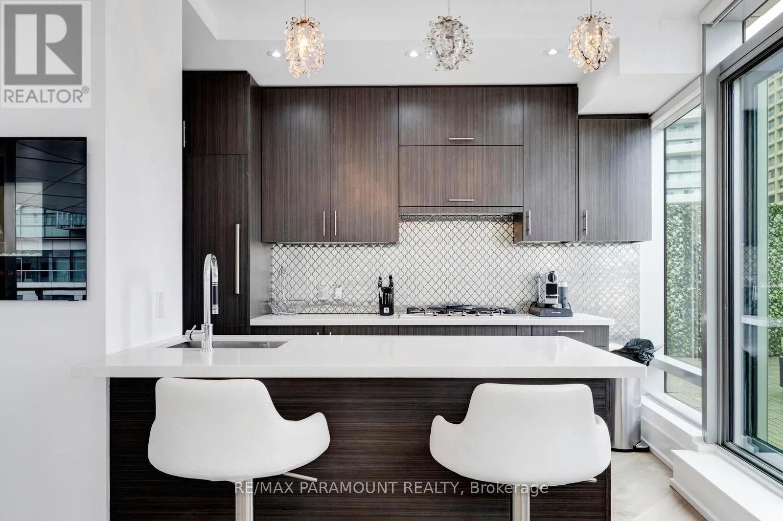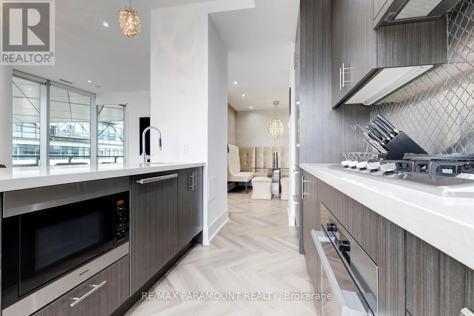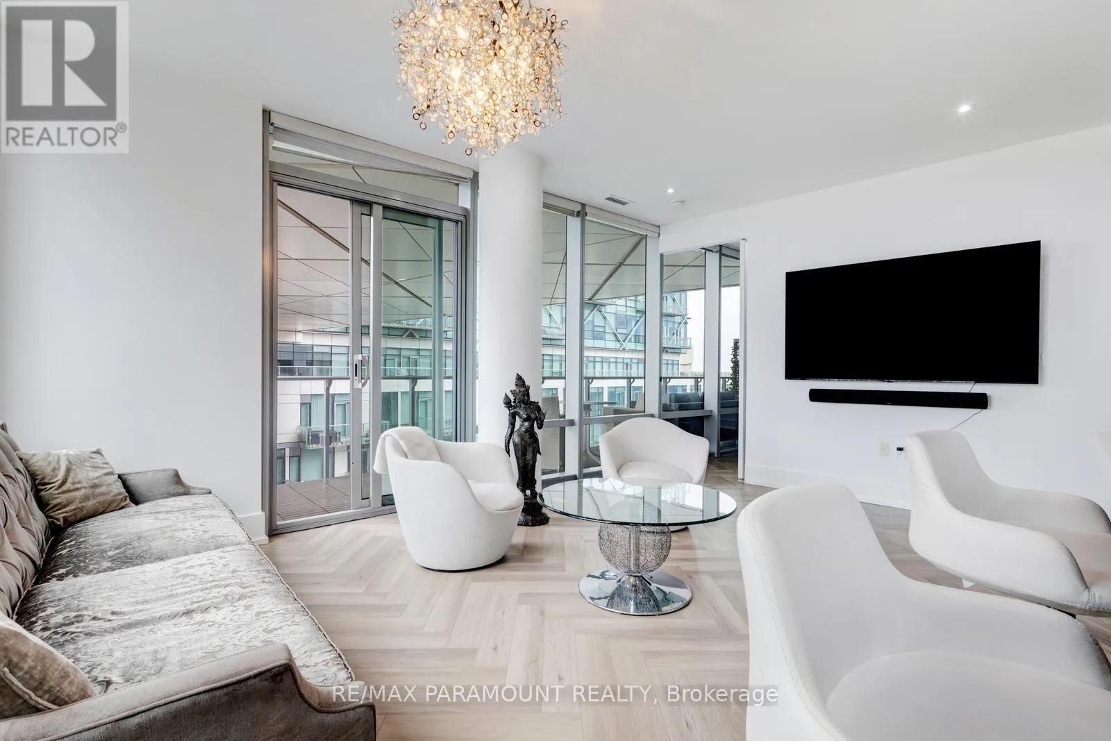 Yonge St & Queens Quay E Stunning Designer Residence with Private Terraces & Smart Home Features. Step into this spectacular, upgraded home featuring a grand living room illuminated by elegant pot lights and enhanced with automated floor-to-ceiling curtains. Soak in the natural light from expansive windows, and enjoy seamless indoor-outdoor living with a walk-out to your large private terrace. The modern chef-inspired kitchen is a true show stopper equipped with a Downsview Kitchen, sleek modern-profile cabinetry, Miele appliances, gas cooking, granite countertops, and a stylish breakfast bar perfect for entertaining or everyday living. Enjoy 10-foot ceilings and newly installed pre-engineered herringbone hardwood flooring throughout the home, adding warmth and sophistication to every room. Live luxuriously with Control4 Smart Home automation, allowing you to manage lighting, temperature, blinds, and entertainment from your smartphone. Brand new TVs are included, and a high-end built-in sound system delivers an immersive audio experience. All bathrooms are outfitted with automated heated Everest toilets, and custom-made furniture throughout the home is thoughtfully designed and included in the sale. The oversized den offers a perfect, separate space for your home office ideal for remote work or creative pursuits. Both balconies feature elegant LED lighting, creating a magical ambiance in the evenings. Enjoy resort-style amenities, including indoor and outdoor pools, sauna, games room, billiards room, and scenic boardwalk access. Located just minutes from the Financial District, QEW, and DVP, convenience meets lifestyle in this exclusive offering. Bonus: Seller is open to Vendor Take Bank Financing with just 5% down. A Rare Opportunity!!! (id:27476)
