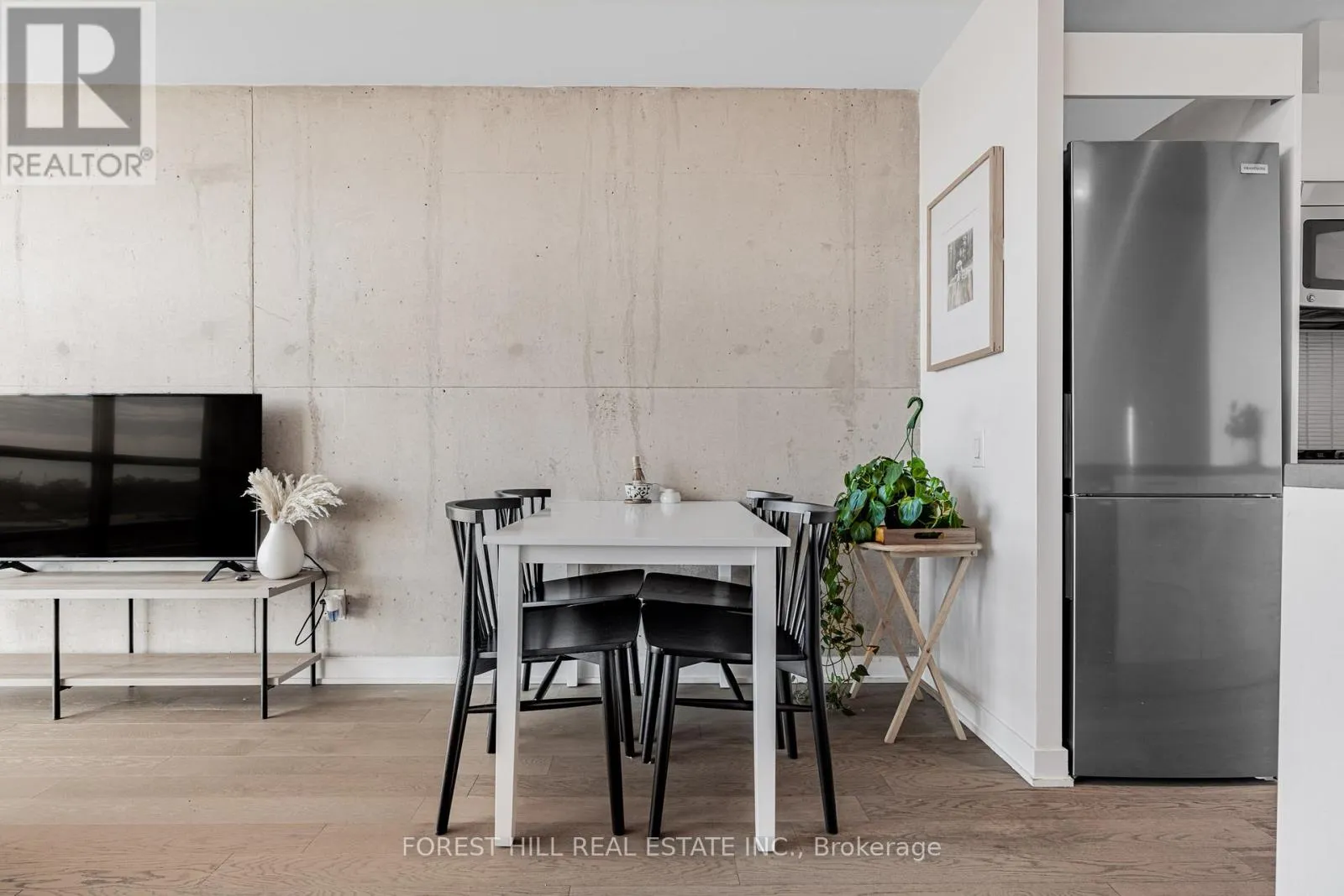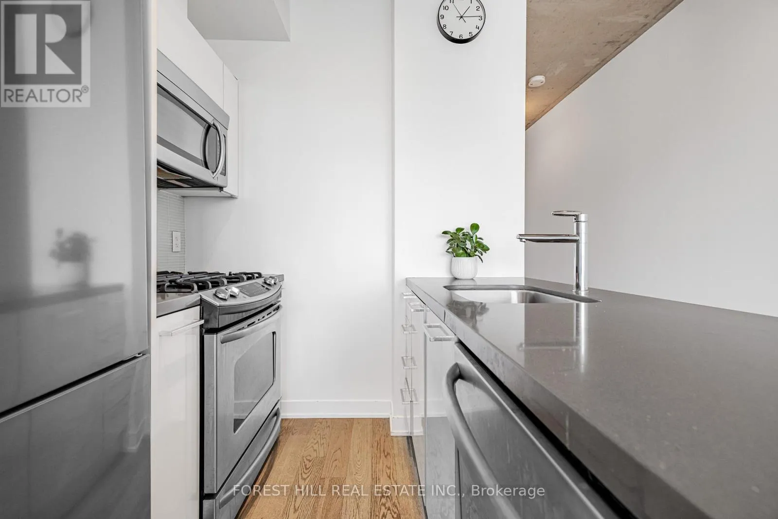 Dundas St E / Carlaw Ave Experience incredible sunsets and UNOBSTRUCTED skyline views from this gorgeous one bedroom loft in Leslieville's sought-after WorkLofts! Freshly painted in 2025. This sun-filled suite combines industrial charm with modern comfort. Soaring 9Ft concrete ceilings, a bright open layout, and an unobstructed west facing view of the downtown skyline create a space that feels bright and inspiring. Enjoy cooking in your sleek Scavolini kitchen with quartz countertop and gas range. High end finishes with engineered hardwood flooring throughout. The building is quiet, well-maintained, and known for its LOW, stable maintenance fees over the years. Just one block from Queen Street East's best restaurants, cafés, and streetcars, and a short stroll to gyms, yoga, rock climbing, and spin studios. You'll love the easy 1-minute drive to the DVP, Lakeshore, or Gardiner Expressway, and soon the Ontario Line stop at Carlaw & Gerrard (only 4 minutes away) will make commuting even simpler. Easy access to the beach, bike lanes on Dundas Ave, three TTC lines. Residents also enjoy rooftop patio with BBQs, party room, and boardroom, onsite dry cleaning/shoe care services -- Everything you need for work, play, and relaxation in one stylish space. (id:27476)