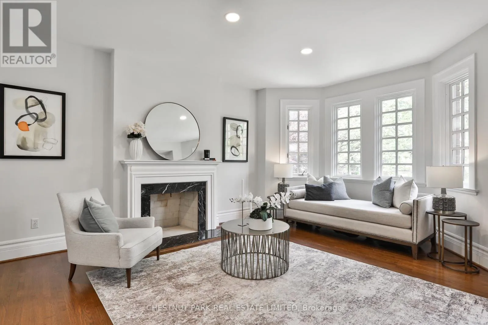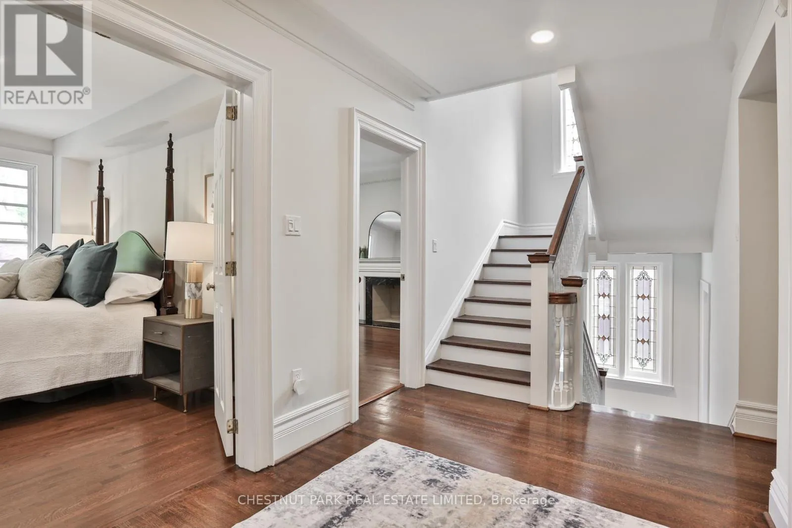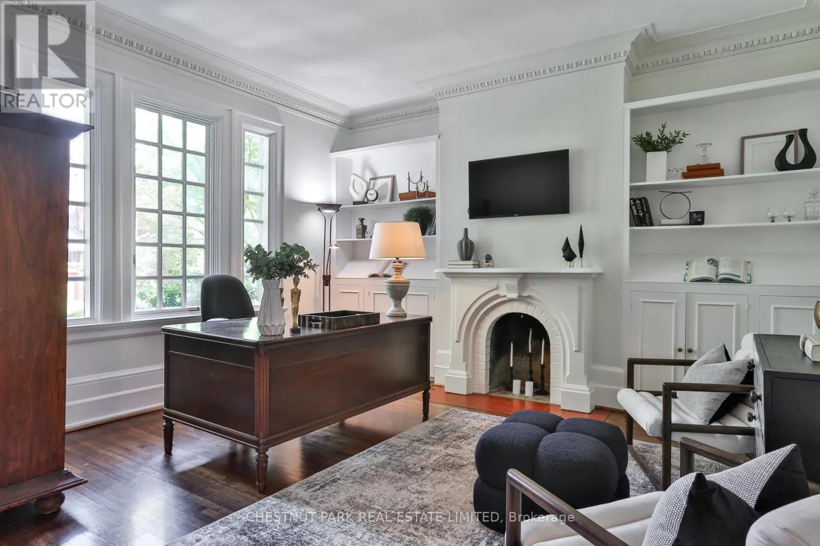 Cross Streets: West of Glen Road at Roxborough Drive. ** Directions: Glen Road at Roxborough Drive. Welcome to a timeless and handsome detached 3 storey heritage Georgian home in the heart of North Rosedale where classic elegance meets everyday comfort. This prestigious area surrounded by parks and ravines in close proximity to excellent private and public schools and access to downtown is ideal for those choosing a healthy family lifestyle. The beautifully landscaped front garden features stone paths flanked by beech trees, boxwood, and yews. Inside, high ceilings along with crown mouldings and two main floor wood-burning fireplaces create a warm, refined atmosphere. The main level showcases a formal living room and dining room, a family room, library and a bright eat-in kitchen and a main floor bathroom. Stained glass windows add beauty and character to the central staircase. The sunlit primary suite offers a fireplace, spacious dressing area and a luxurious 6-piece ensuite featuring a Bagno Italia soaker tub and a walk-in shower for 2! A second floor study with a fireplace and an additional bedroom with an ensuite bathroom complete this second level. The third level includes two generously sized bedrooms and an oversized bathroom. The lower level has a recreation room, fitness area, wine storage, and laundry. A private driveway with decorative pavers runs alongside the home, leading to a detached two-car garage at the rear. Enjoy the fenced south-facing garden with a spacious deck perfect for outdoor entertaining. Steps to Chorley Park, Rosedale Park, and Summerhill Market. Please click on virtual tour for a drone aerial view. (id:27476)