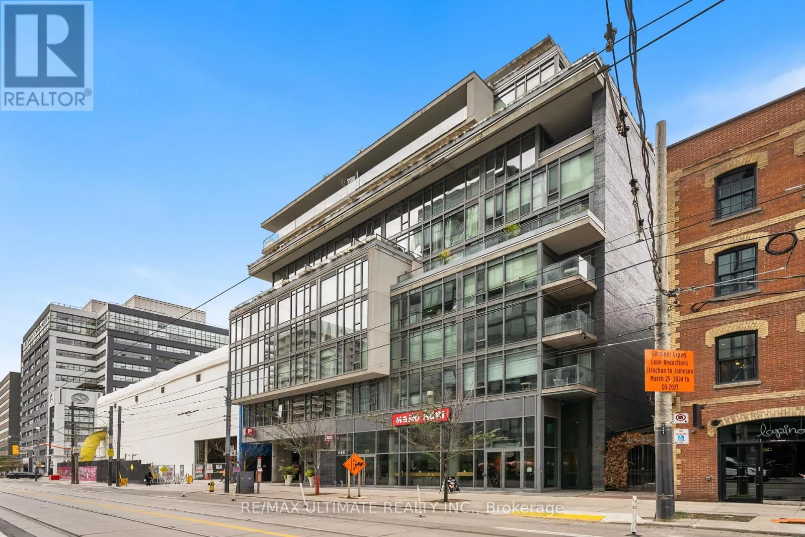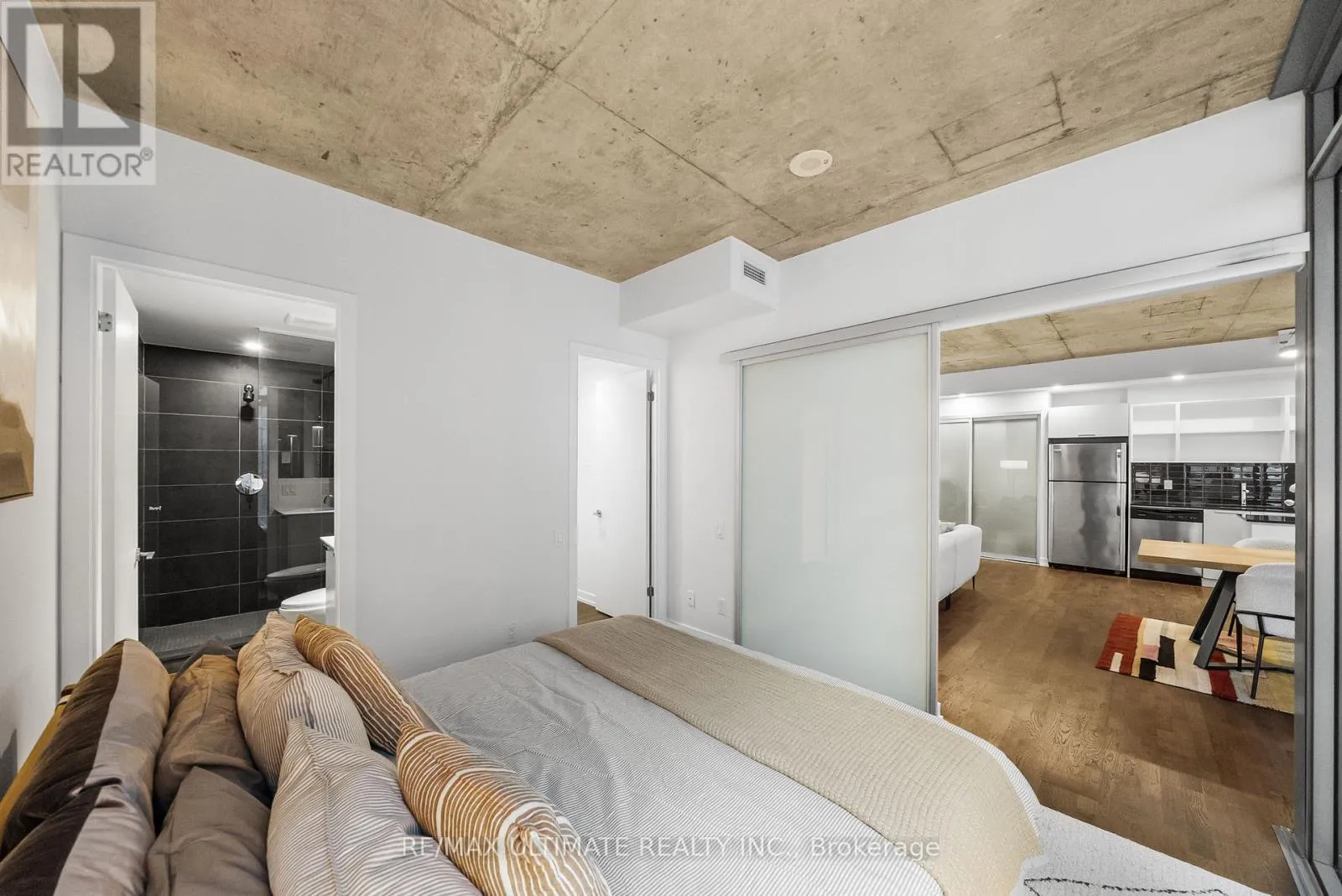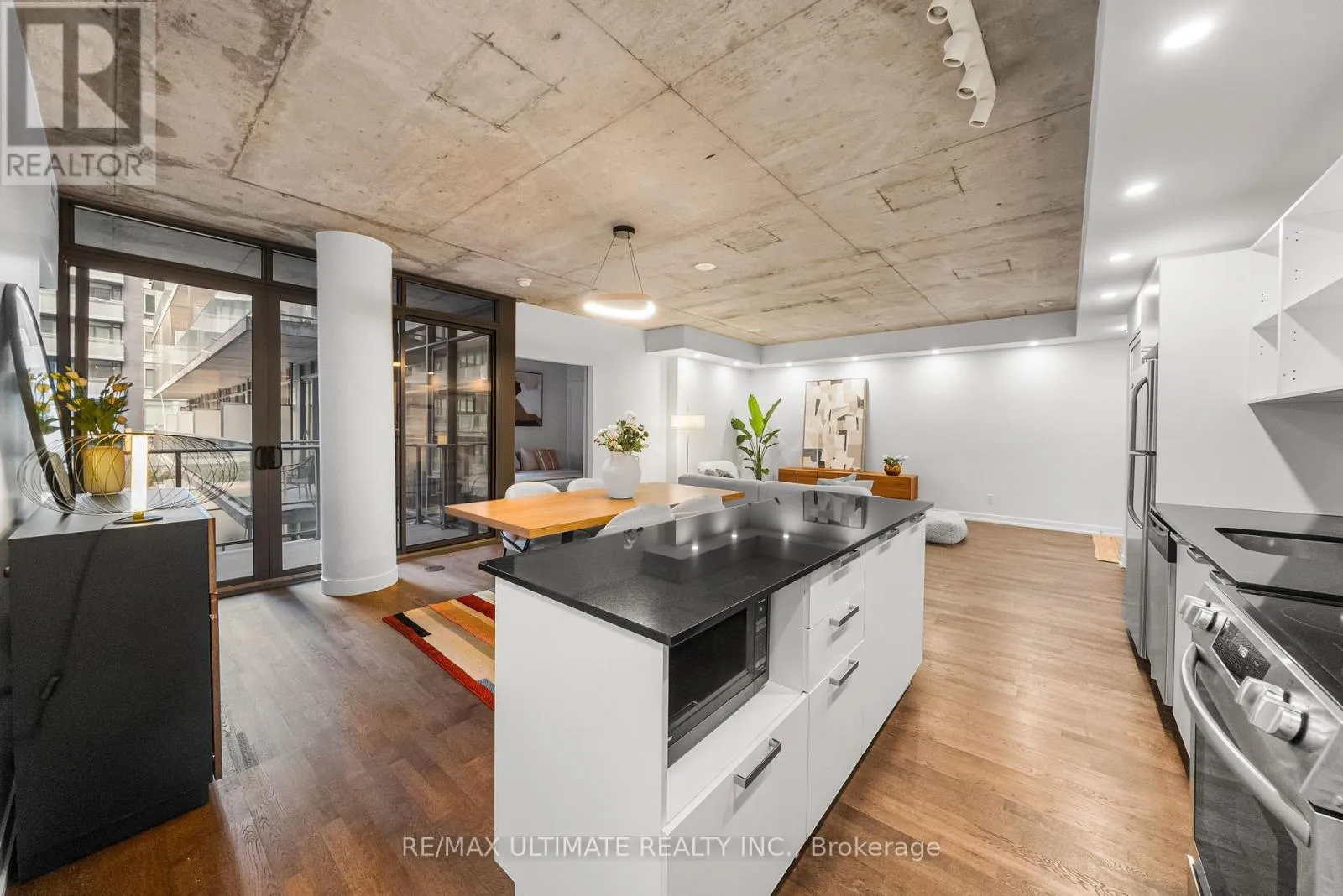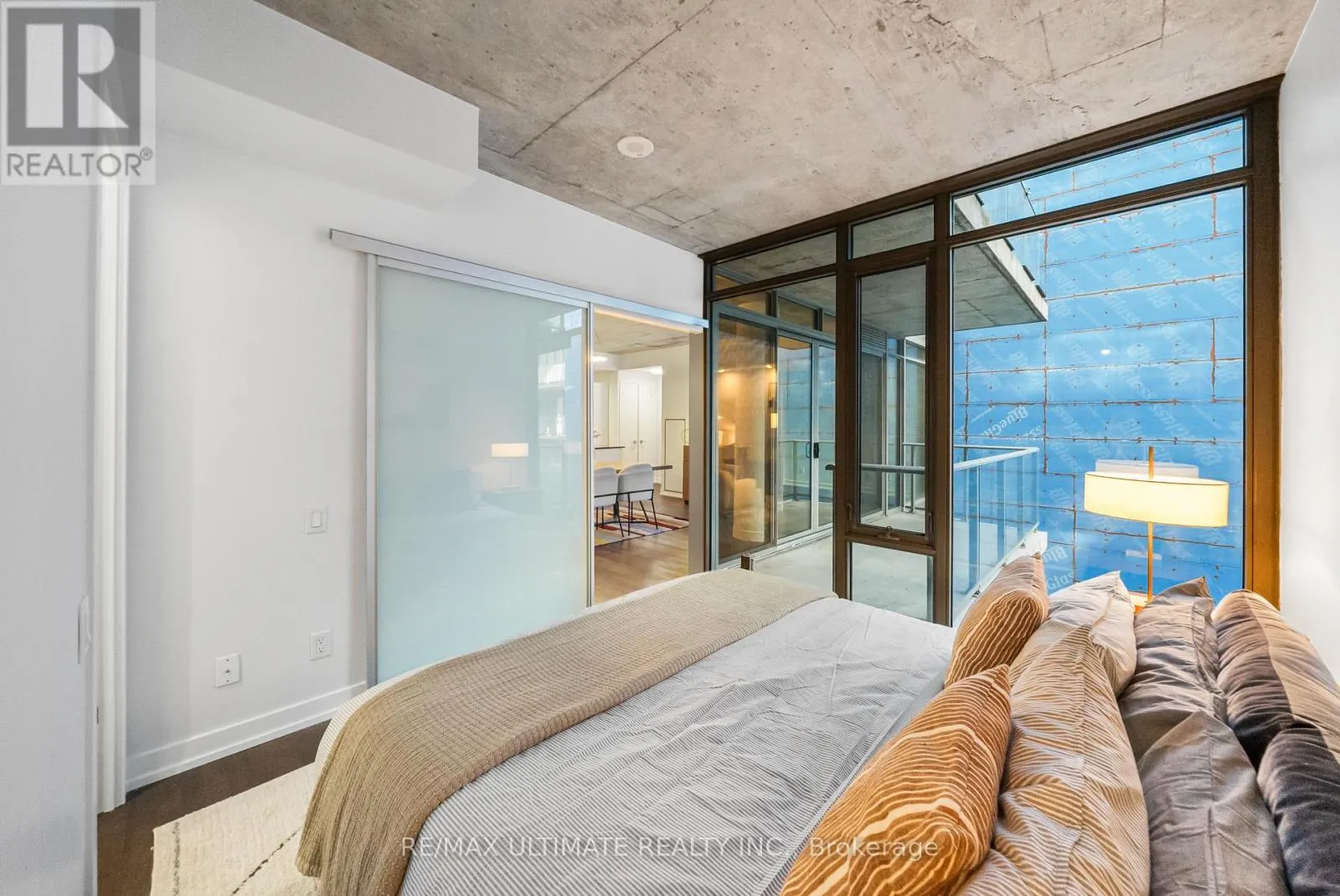King ST. W / Bathurst Experience boutique modern urban living in this stunning 1,086 sq ft 2 bedroom - 2 bathroom suite in the heart of King West. 991 sq ft of meticulously designed interior space and a generous 95 sq ft balcony. Designed with 9-ft exposed concrete ceilings and floor-to-ceiling windows, this home blends modern style with functional comfort. The open-concept kitchen includes an extra-wide marble-topped island, stainless steel appliances, and ample storage ideal for everyday cooking and effortless entertaining. The open-concept living and dining area extends seamlessly to a bright balcony, perfect for outdoor dining or unwinding with a view over the courtyard. The king-sized primary suite offers a peaceful retreat with a walk-in closet and a sleek glass-enclosed en-suite shower. The second bedroom provides flexibility for guests, a home office, or creative space, and is complemented by a full second bathroom. Additional highlights include in-suite laundry and generous storage throughout. This pet- friendly building offers premium amenities including a 24-hour concierge, a fully equipped gym, and an inner courtyard green space. 1 priority parking spot is included. Located steps from the King Streetcar, the upcoming Ontario Line, parks, restaurants, cafés, galleries, and shops, this is a rare opportunity to own a split layout condo in one of Toronto's most vibrant neighbourhoods. (id:27476)
