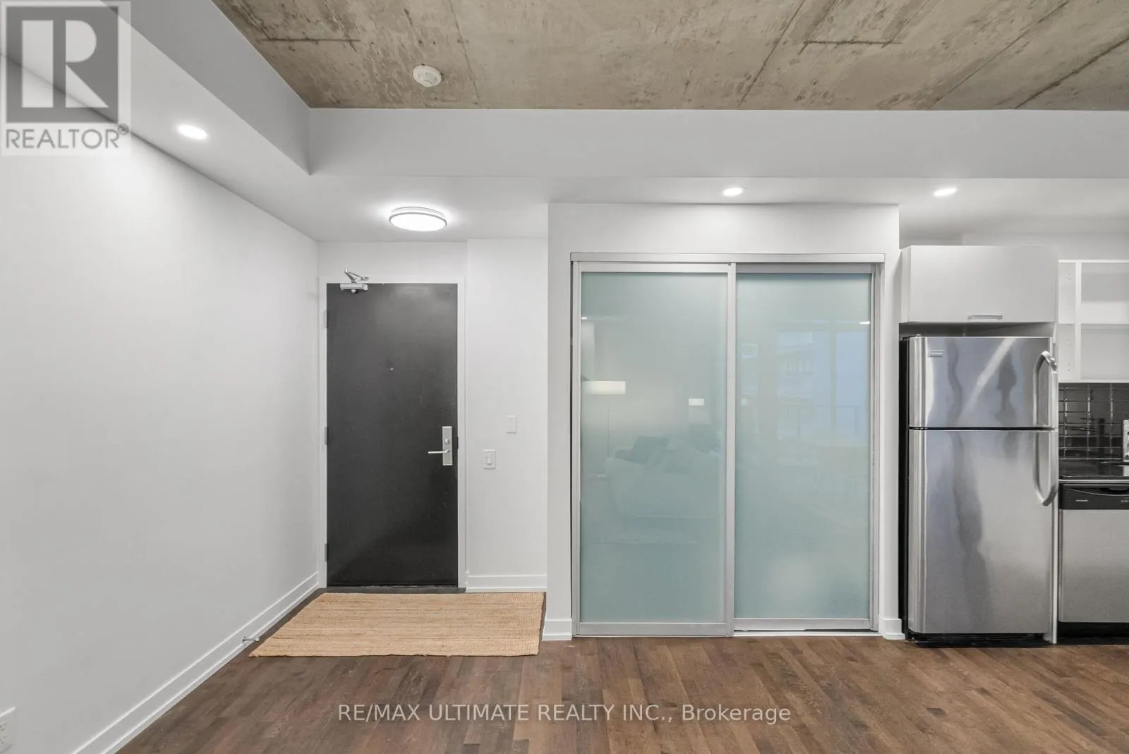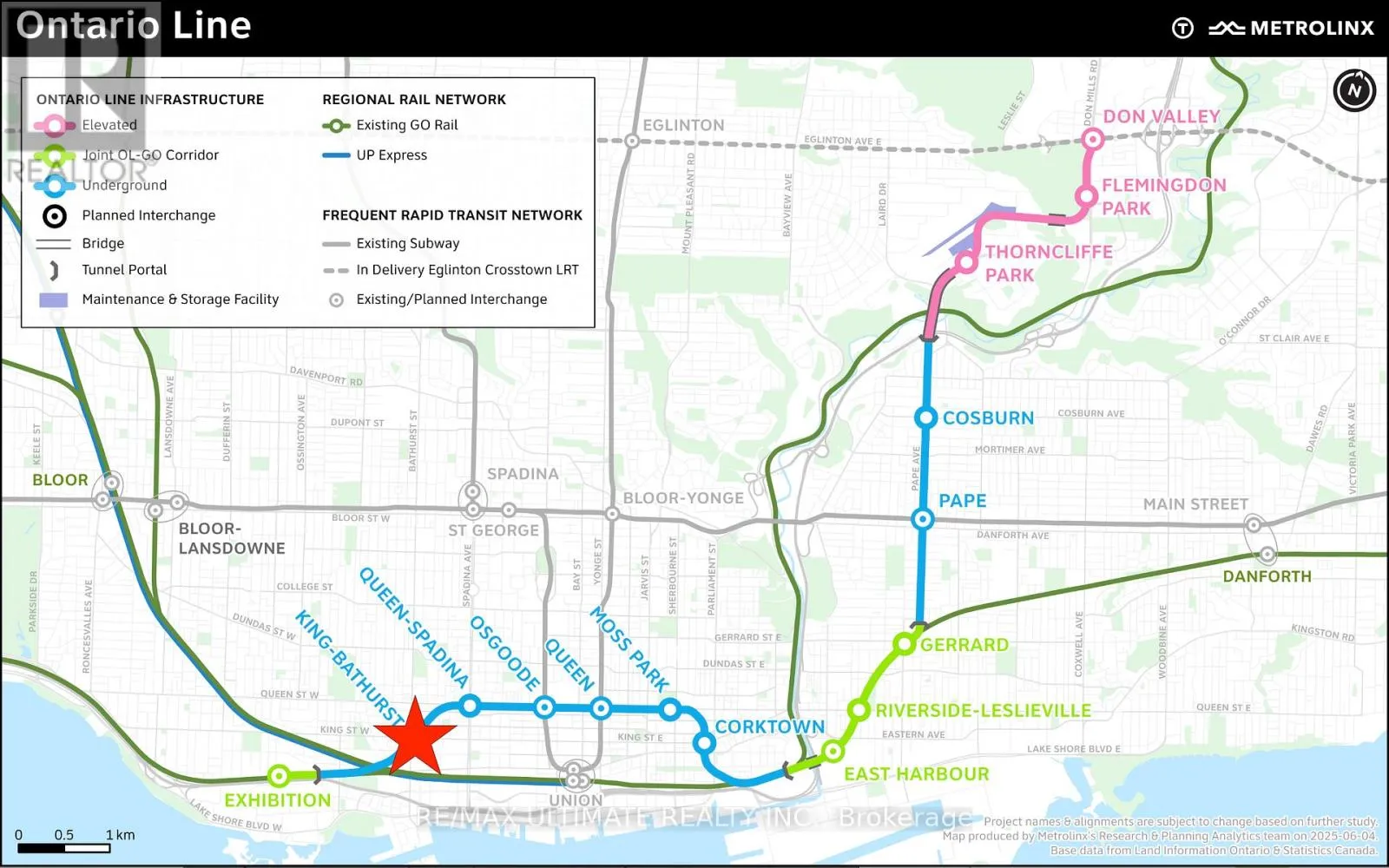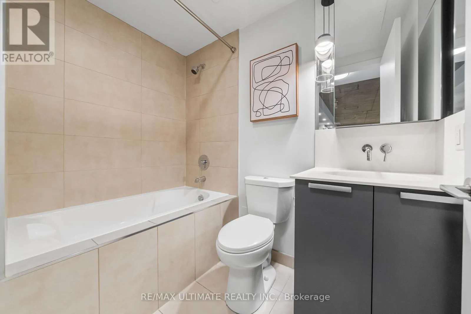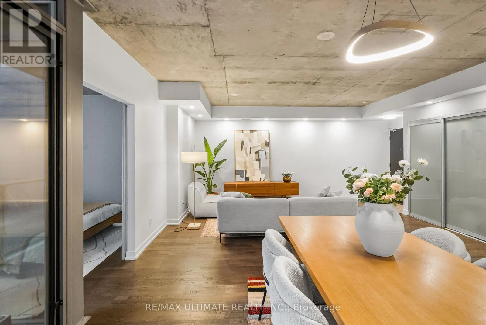 King ST. W / Bathurst Experience boutique modern urban living in this stunning 1,086 sq ft 2 bedroom - 2 bathroom suite in the heart of King West. 991 sq ft of meticulously designed interior space and a generous 95 sq ft balcony. Designed with 9-ft exposed concrete ceilings and floor-to-ceiling windows, this home blends modern style with functional comfort. The open-concept kitchen includes an extra-wide marble-topped island, stainless steel appliances, and ample storage ideal for everyday cooking and effortless entertaining. The open-concept living and dining area extends seamlessly to a bright balcony, perfect for outdoor dining or unwinding with a view over the courtyard. The king-sized primary suite offers a peaceful retreat with a walk-in closet and a sleek glass-enclosed en-suite shower. The second bedroom provides flexibility for guests, a home office, or creative space, and is complemented by a full second bathroom. Additional highlights include in-suite laundry and generous storage throughout. This pet- friendly building offers premium amenities including a 24-hour concierge, a fully equipped gym, and an inner courtyard green space. 1 priority parking spot is included. Located steps from the King Streetcar, the upcoming Ontario Line, parks, restaurants, cafés, galleries, and shops, this is a rare opportunity to own a split layout condo in one of Toronto's most vibrant neighbourhoods. (id:27476)