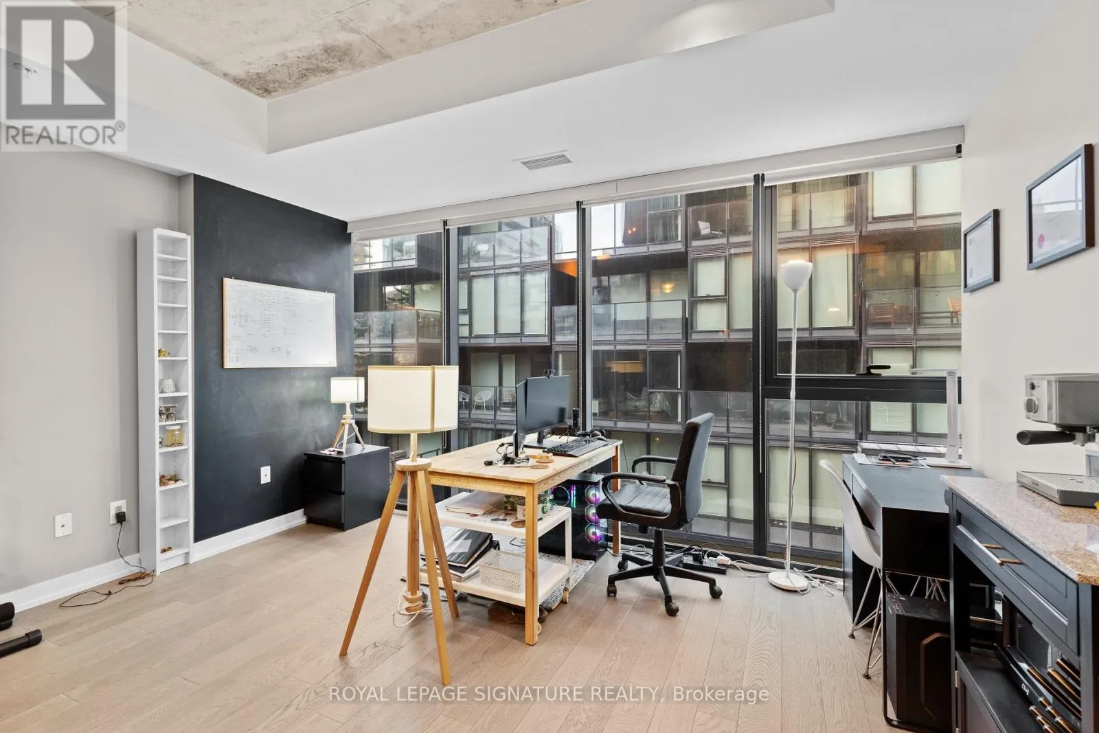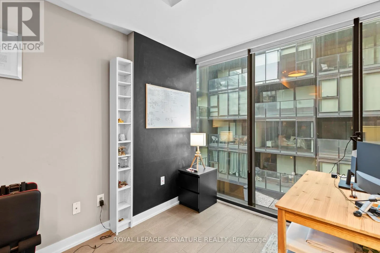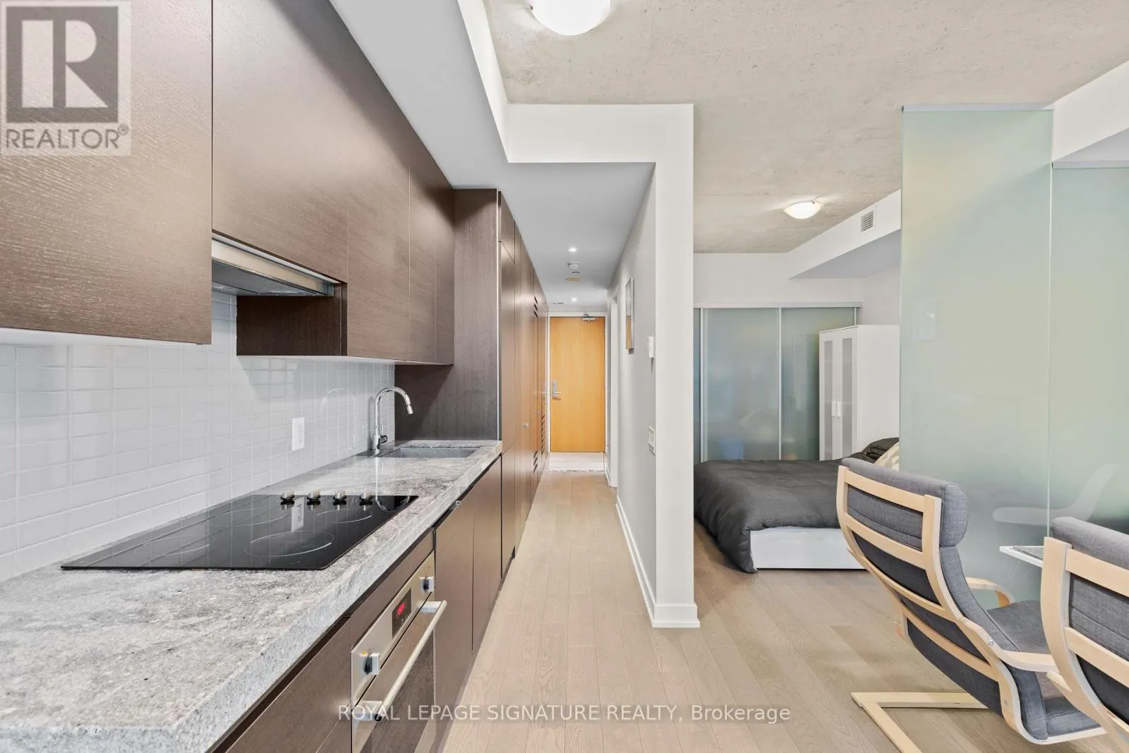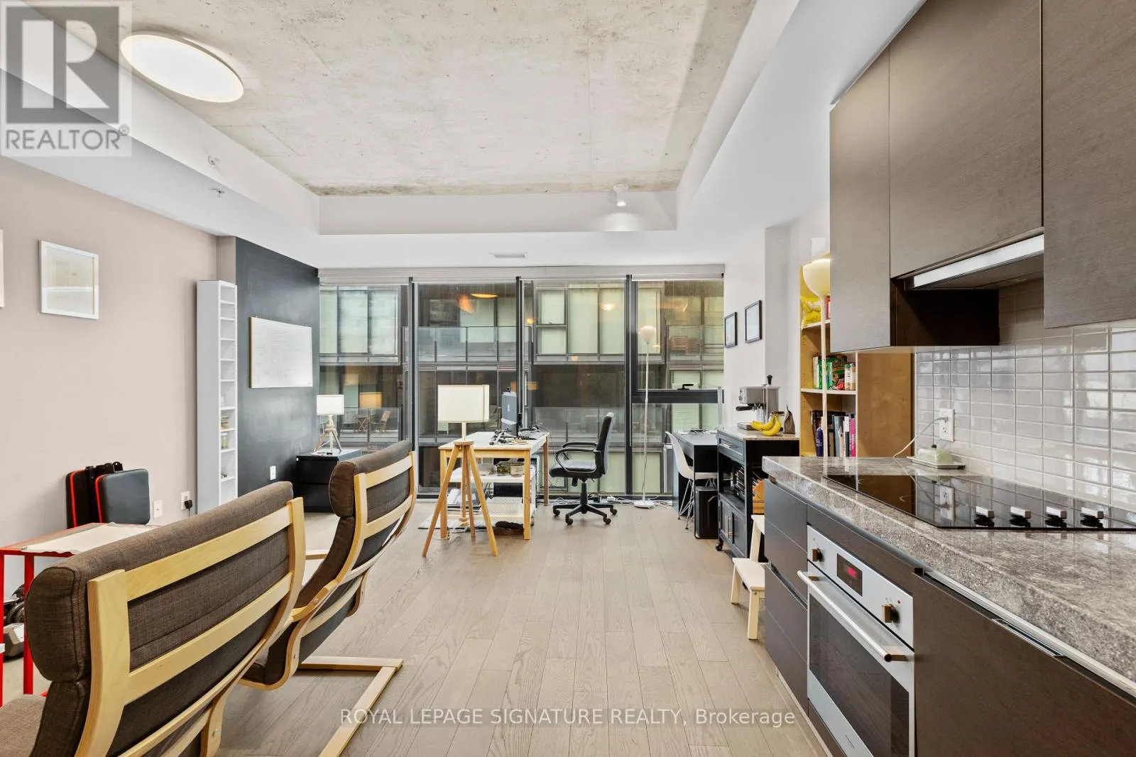 King & Bathurst Welcome to Unit 406 at the Thompson Residences, ideally situated in the heart of Toronto's iconic King West neighbourhood. This boutique one-bedroom suite is the perfect opportunity for a first-time buyer or investor looking for style, space, and location. One of the largest one-bedroom layouts in the building, it offers 583 square feet of functional living space with floor-to-ceiling windows and custom coverings, a sleek Scavolini kitchen with Euro-style appliances, exposed 9-foot concrete ceilings, beautiful engineered hardwood flooring, and a spa-inspired bathroom with a rain shower. Ample in-suite storage and a dedicated locker provide practical convenience. The open-concept living and dining area is ideal for both everyday living and entertaining. Steps to top restaurants, shopping, parks, and transit, this suite is perfectly positioned to experience everything Toronto has to offer. Priced to sell, don't miss this opportunity! (id:27476)