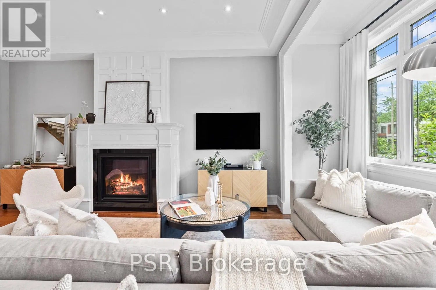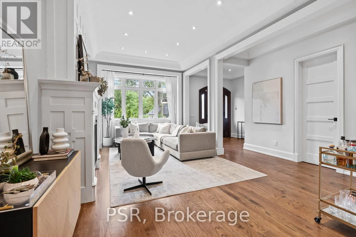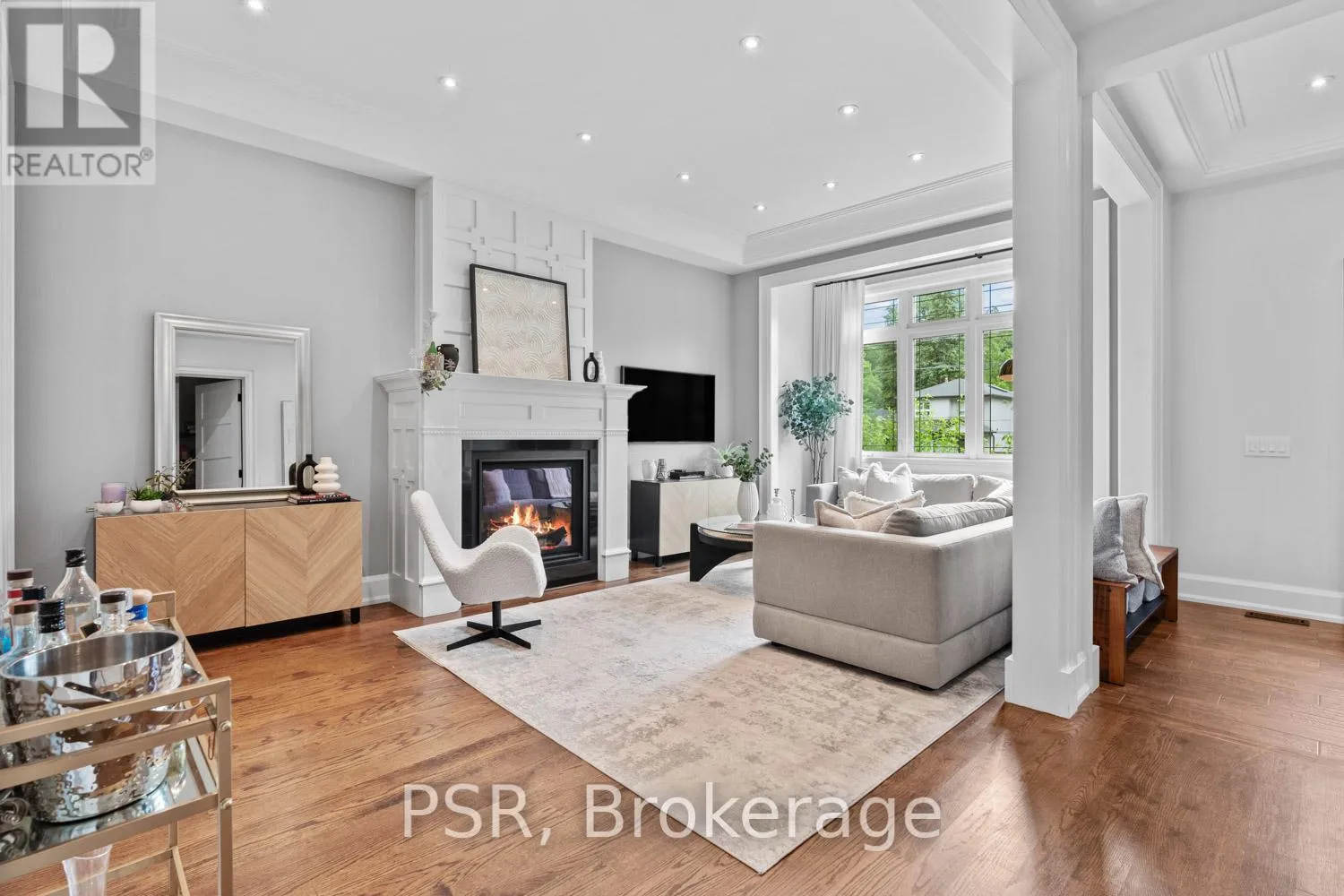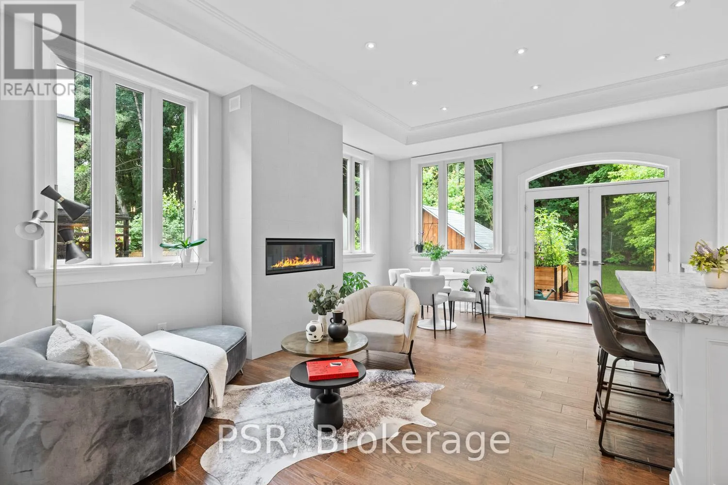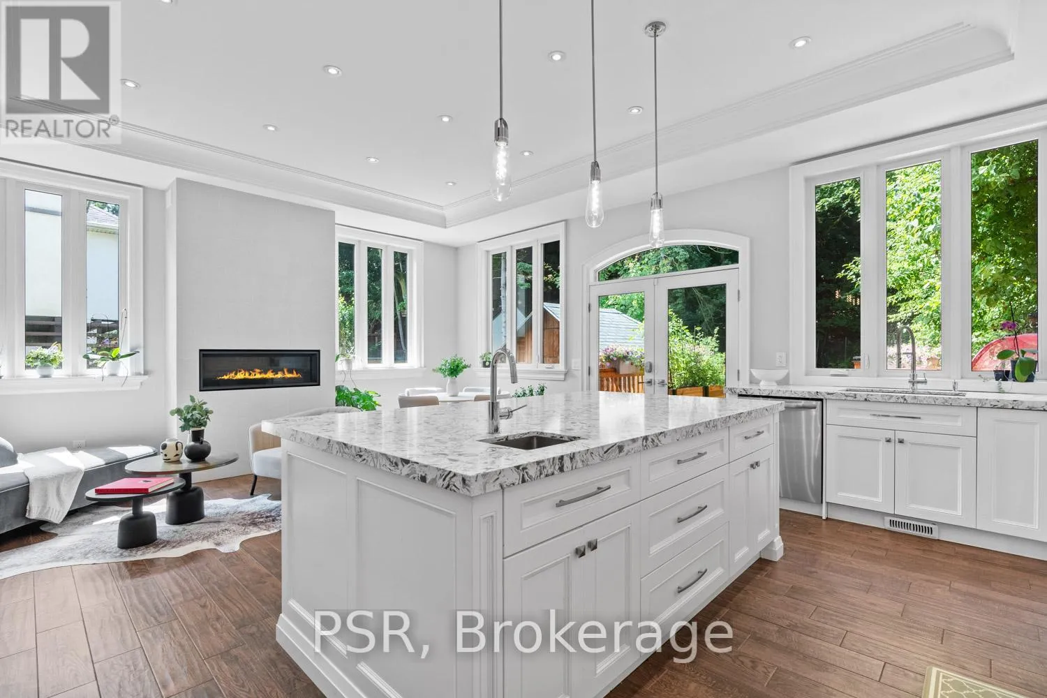 Bloor / South Kingsway This stately Swansea residence, gracing an impressive 190ft-deep lot, offering nearly 4000 square ft of luxurious living space, is a masterpiece of modern sophistication and precision craftsmanship. One of Toronto's most sought-after communities, the vibrant gardens lead to an exquisite granite facade, accentuated by a warm and commanding red-oak door beneath an archway. Step inside, and experience the tranquility of triple-glazed windows, the skylight illuminating the stairwell, the sleek glass railings, the solid oak and porcelain floors, the meticulous millwork, and the recessed ceilings. The main floor's soaring 10ft-ceilings and intimate fireplace enhance the spacious, well-defined living and dining rooms. The resplendent kitchen is a culinary haven, featuring quartz countertops, a grand centre island, an origami-inspired backsplash, a 6-burner gas range, and a fireplace warming the kitchen-side dinette and inglenook. Custom 8ft pocket doors transform the kitchen into a private drawing room, adding an elegance to evening gatherings. Upstairs, every bedroom boasts 9ft ceilings, and every bathroom is appointed with contemporary flair. The palatial primary suite is a serene retreat, complete with a customized walk-in closet with a skylight, micro-forest views, and a lavish 5-piece ensuite designed to pamper and impress. Downstairs offers 8ft ceilings, in-floor heating, a separate entrance, a stylish 4-piece bath, two expansive rec rooms-with one designed for effortless division for more rooms. A roughed-in kitchen ready to accommodate caterers, a nanny, or visiting friends and family. The rear grounds are a true oasis, with towering canopies, open skies, playful chipmunks, and blue jay songs. Enjoy the gas-line barbecue on the deck, terrace lounging, and fireside dining. This urban sanctuary is surrounded by iconic parks, serene waterside trails, Bloor West Village, the Cheese Boutique and the prestigious Swansea Public School and Ursula Franklin Academy. (id:27476)