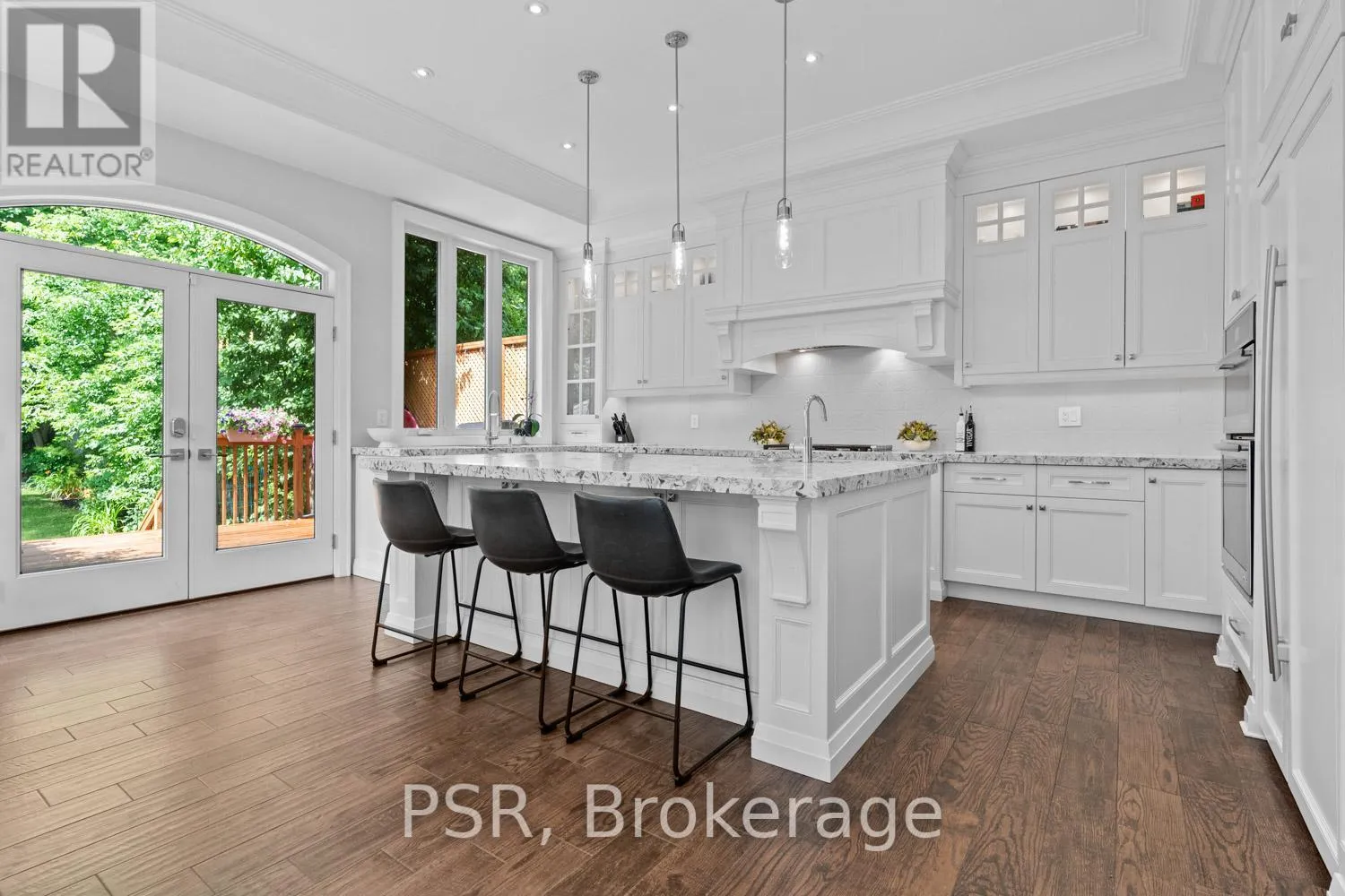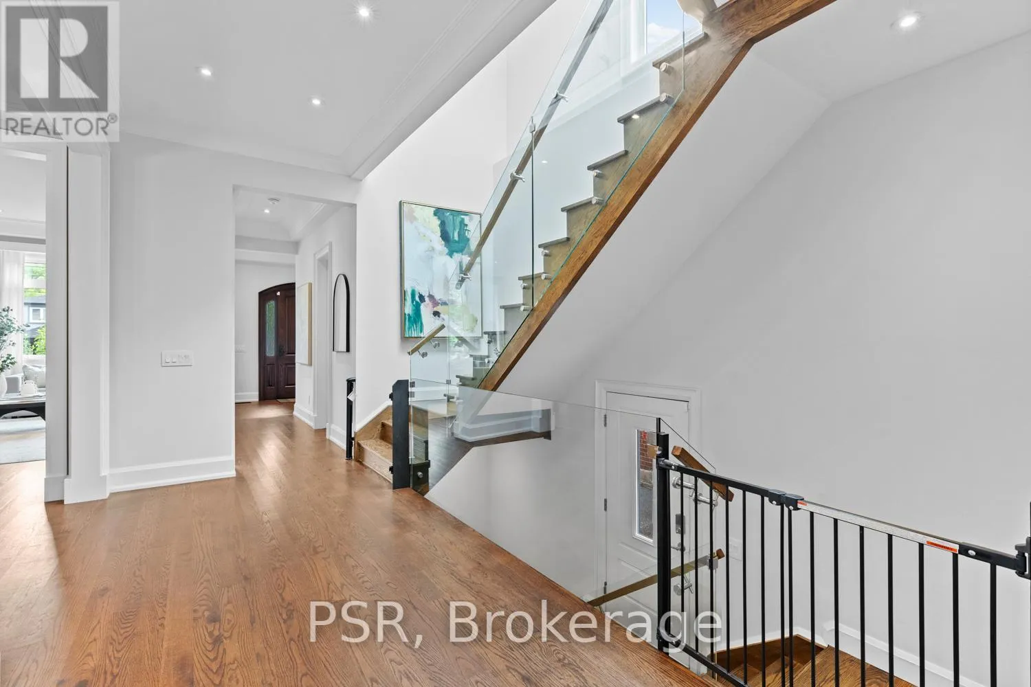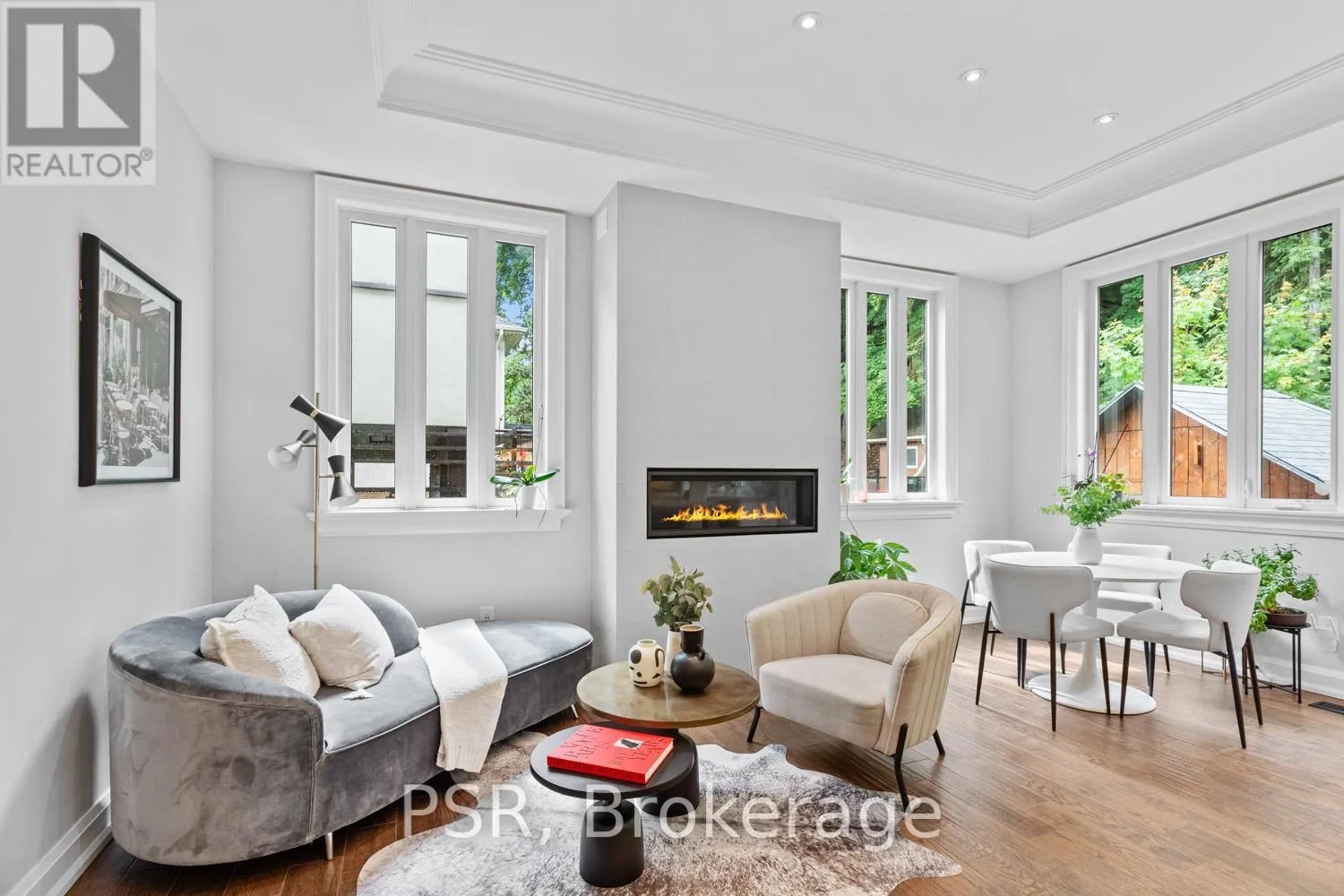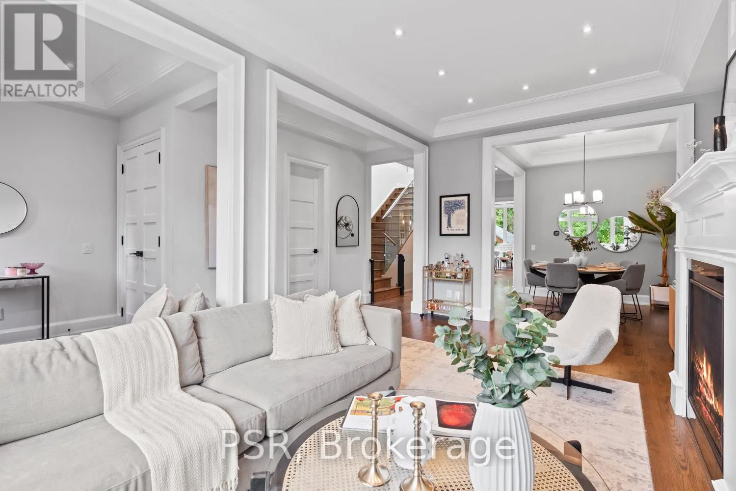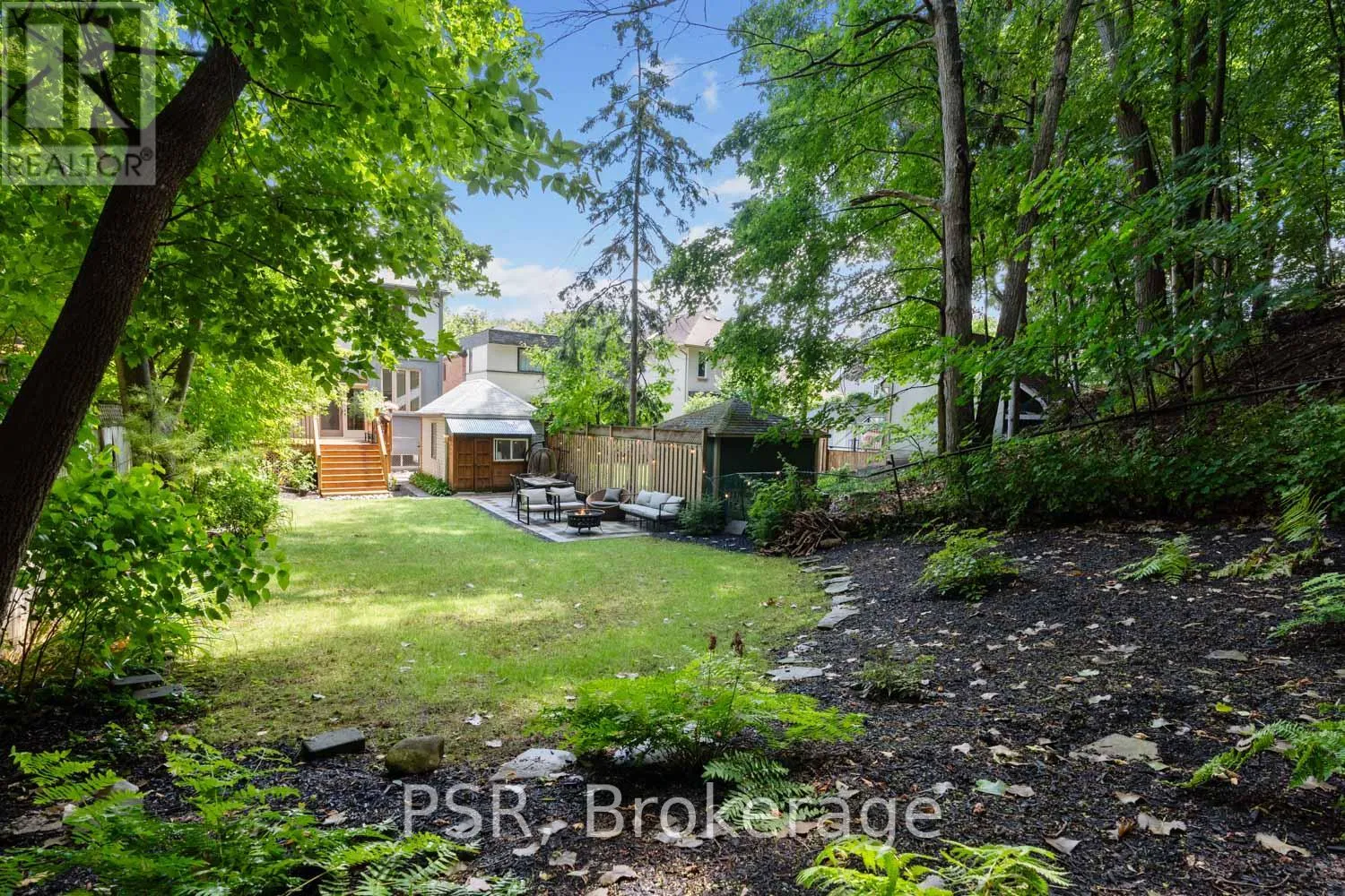 Bloor / South Kingsway This stately Swansea residence, gracing an impressive 190ft-deep lot, offering nearly 4000 square ft of luxurious living space, is a masterpiece of modern sophistication and precision craftsmanship. One of Toronto's most sought-after communities, the vibrant gardens lead to an exquisite granite facade, accentuated by a warm and commanding red-oak door beneath an archway. Step inside, and experience the tranquility of triple-glazed windows, the skylight illuminating the stairwell, the sleek glass railings, the solid oak and porcelain floors, the meticulous millwork, and the recessed ceilings. The main floor's soaring 10ft-ceilings and intimate fireplace enhance the spacious, well-defined living and dining rooms. The resplendent kitchen is a culinary haven, featuring quartz countertops, a grand centre island, an origami-inspired backsplash, a 6-burner gas range, and a fireplace warming the kitchen-side dinette and inglenook. Custom 8ft pocket doors transform the kitchen into a private drawing room, adding an elegance to evening gatherings. Upstairs, every bedroom boasts 9ft ceilings, and every bathroom is appointed with contemporary flair. The palatial primary suite is a serene retreat, complete with a customized walk-in closet with a skylight, micro-forest views, and a lavish 5-piece ensuite designed to pamper and impress. Downstairs offers 8ft ceilings, in-floor heating, a separate entrance, a stylish 4-piece bath, two expansive rec rooms-with one designed for effortless division for more rooms. A roughed-in kitchen ready to accommodate caterers, a nanny, or visiting friends and family. The rear grounds are a true oasis, with towering canopies, open skies, playful chipmunks, and blue jay songs. Enjoy the gas-line barbecue on the deck, terrace lounging, and fireside dining. This urban sanctuary is surrounded by iconic parks, serene waterside trails, Bloor West Village, the Cheese Boutique and the prestigious Swansea Public School and Ursula Franklin Academy. (id:27476)