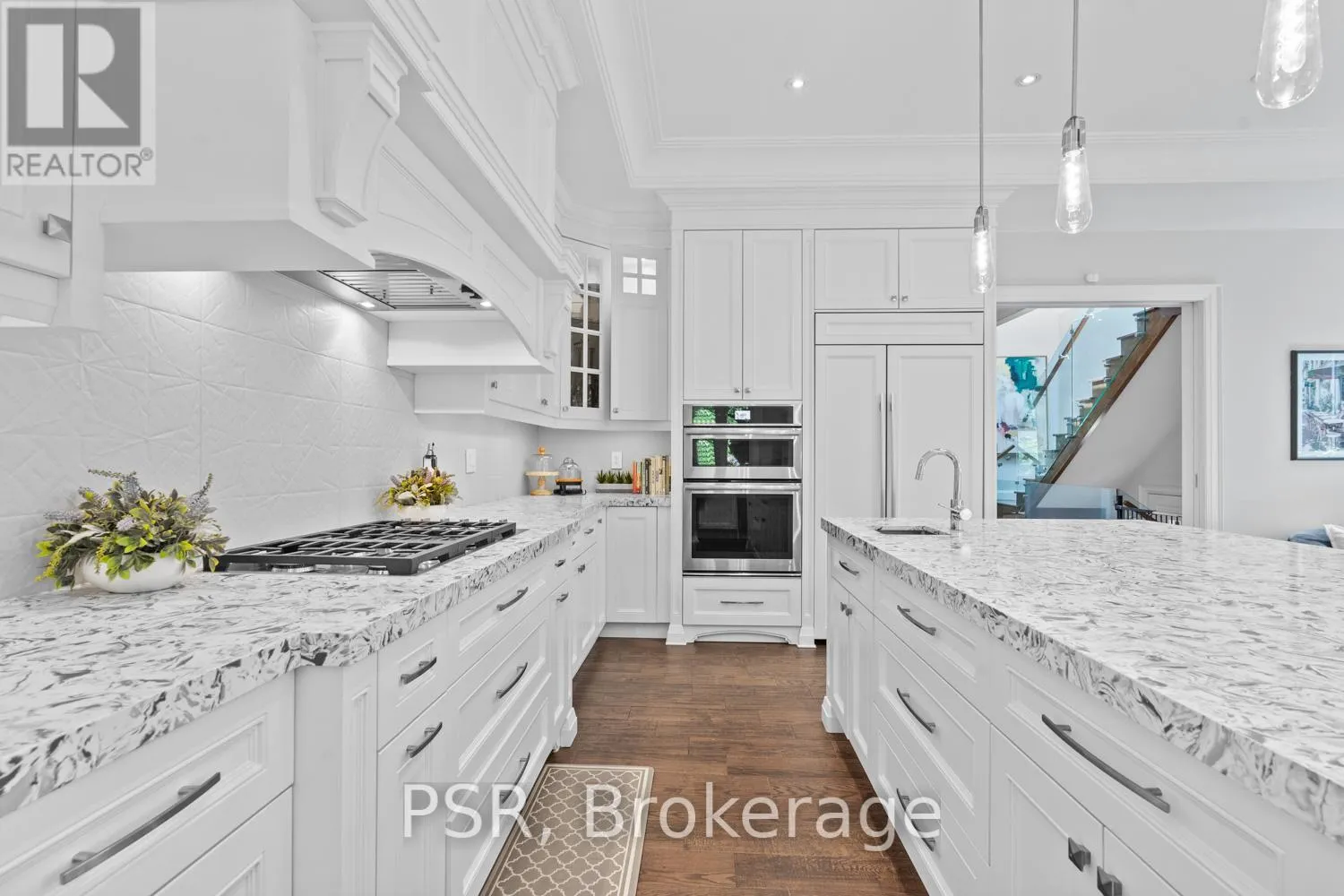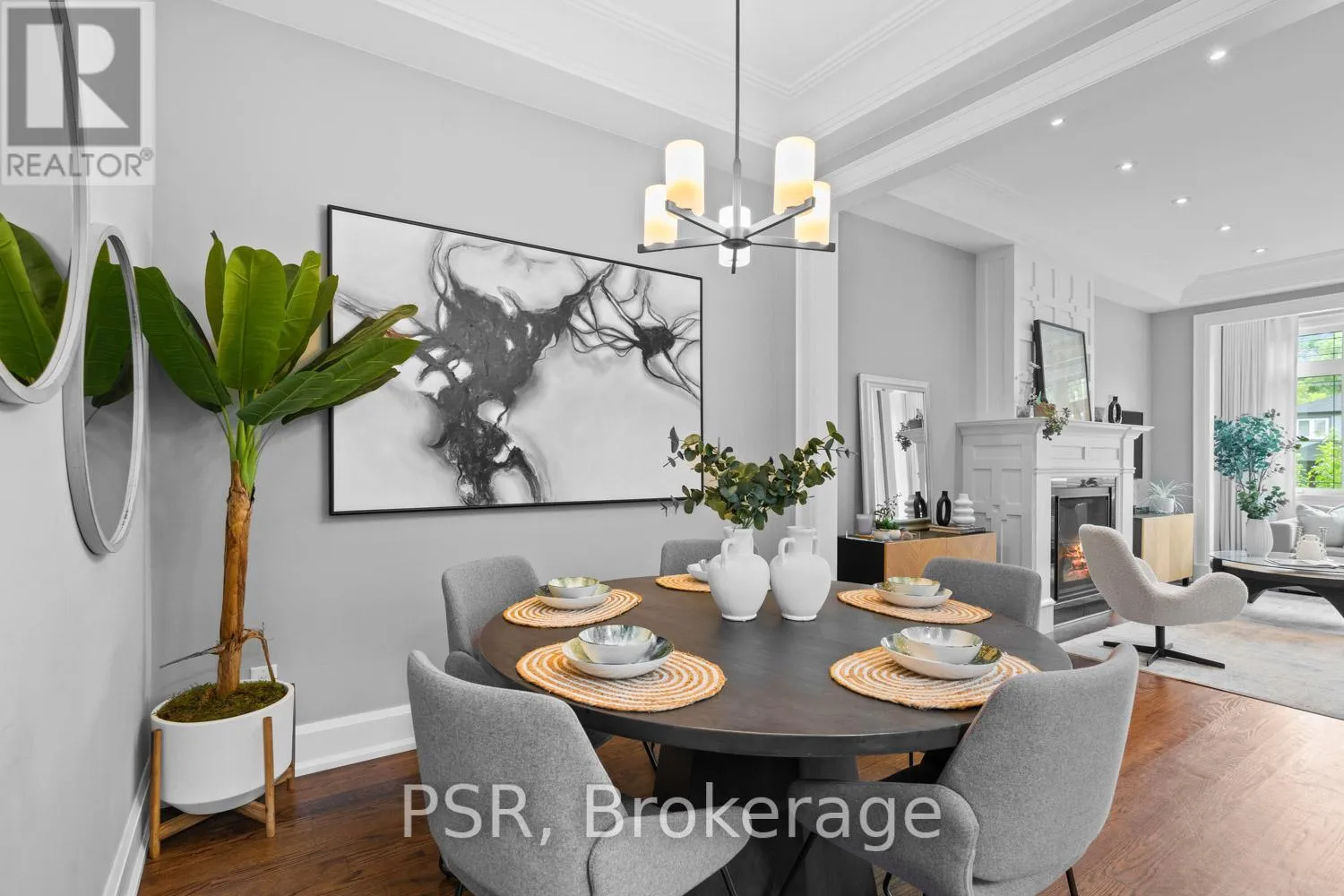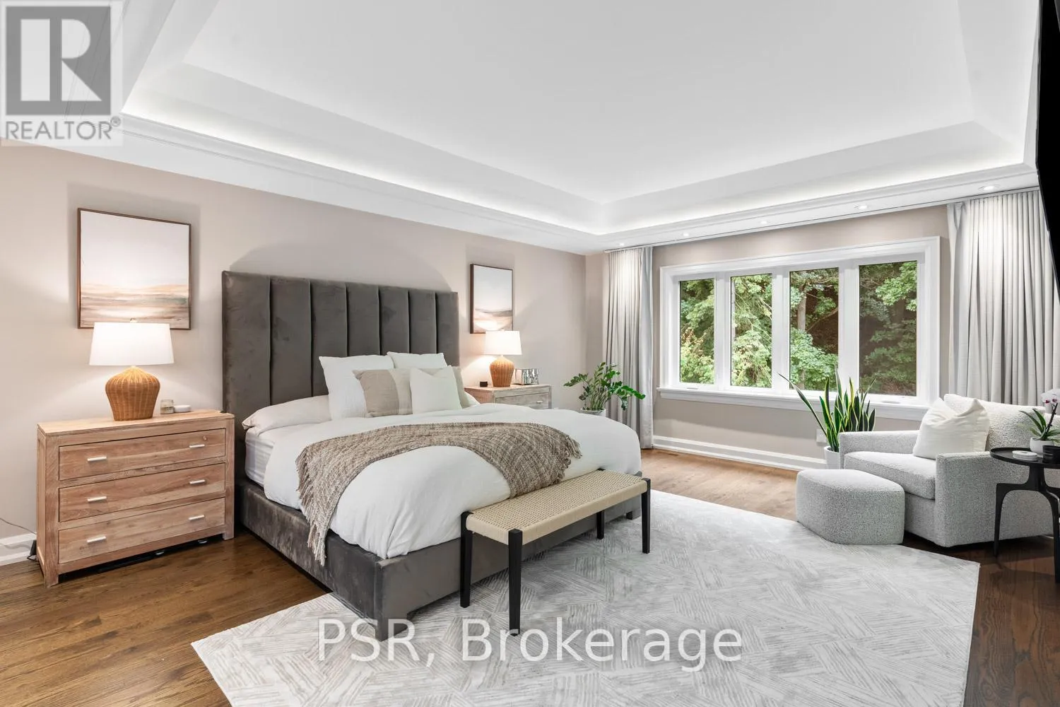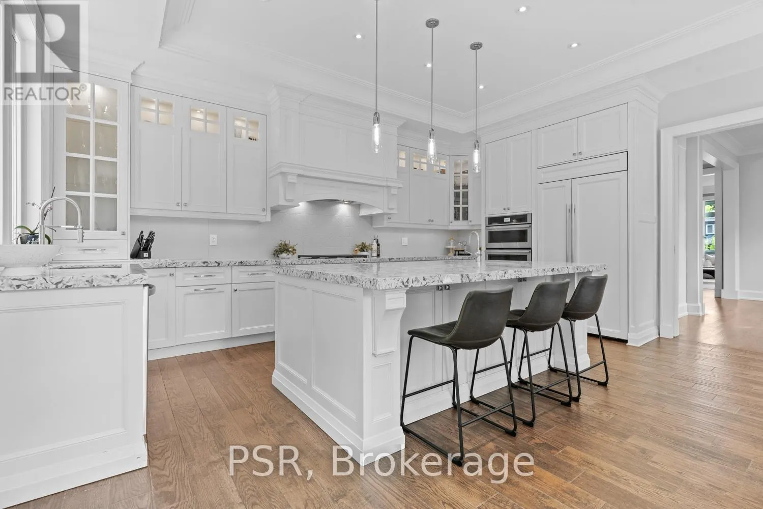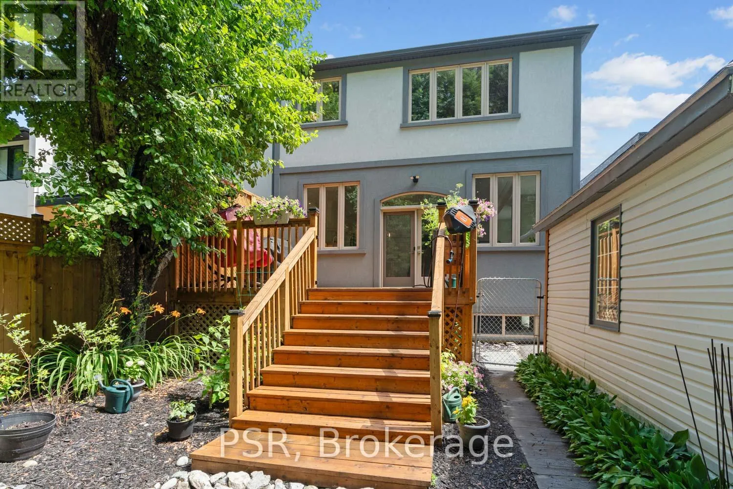 Bloor / South Kingsway This stately Swansea residence, gracing an impressive 190ft-deep lot, offering nearly 4000 square ft of luxurious living space, is a masterpiece of modern sophistication and precision craftsmanship. One of Toronto's most sought-after communities, the vibrant gardens lead to an exquisite granite facade, accentuated by a warm and commanding red-oak door beneath an archway. Step inside, and experience the tranquility of triple-glazed windows, the skylight illuminating the stairwell, the sleek glass railings, the solid oak and porcelain floors, the meticulous millwork, and the recessed ceilings. The main floor's soaring 10ft-ceilings and intimate fireplace enhance the spacious, well-defined living and dining rooms. The resplendent kitchen is a culinary haven, featuring quartz countertops, a grand centre island, an origami-inspired backsplash, a 6-burner gas range, and a fireplace warming the kitchen-side dinette and inglenook. Custom 8ft pocket doors transform the kitchen into a private drawing room, adding an elegance to evening gatherings. Upstairs, every bedroom boasts 9ft ceilings, and every bathroom is appointed with contemporary flair. The palatial primary suite is a serene retreat, complete with a customized walk-in closet with a skylight, micro-forest views, and a lavish 5-piece ensuite designed to pamper and impress. Downstairs offers 8ft ceilings, in-floor heating, a separate entrance, a stylish 4-piece bath, two expansive rec rooms-with one designed for effortless division for more rooms. A roughed-in kitchen ready to accommodate caterers, a nanny, or visiting friends and family. The rear grounds are a true oasis, with towering canopies, open skies, playful chipmunks, and blue jay songs. Enjoy the gas-line barbecue on the deck, terrace lounging, and fireside dining. This urban sanctuary is surrounded by iconic parks, serene waterside trails, Bloor West Village, the Cheese Boutique and the prestigious Swansea Public School and Ursula Franklin Academy. (id:27476)
