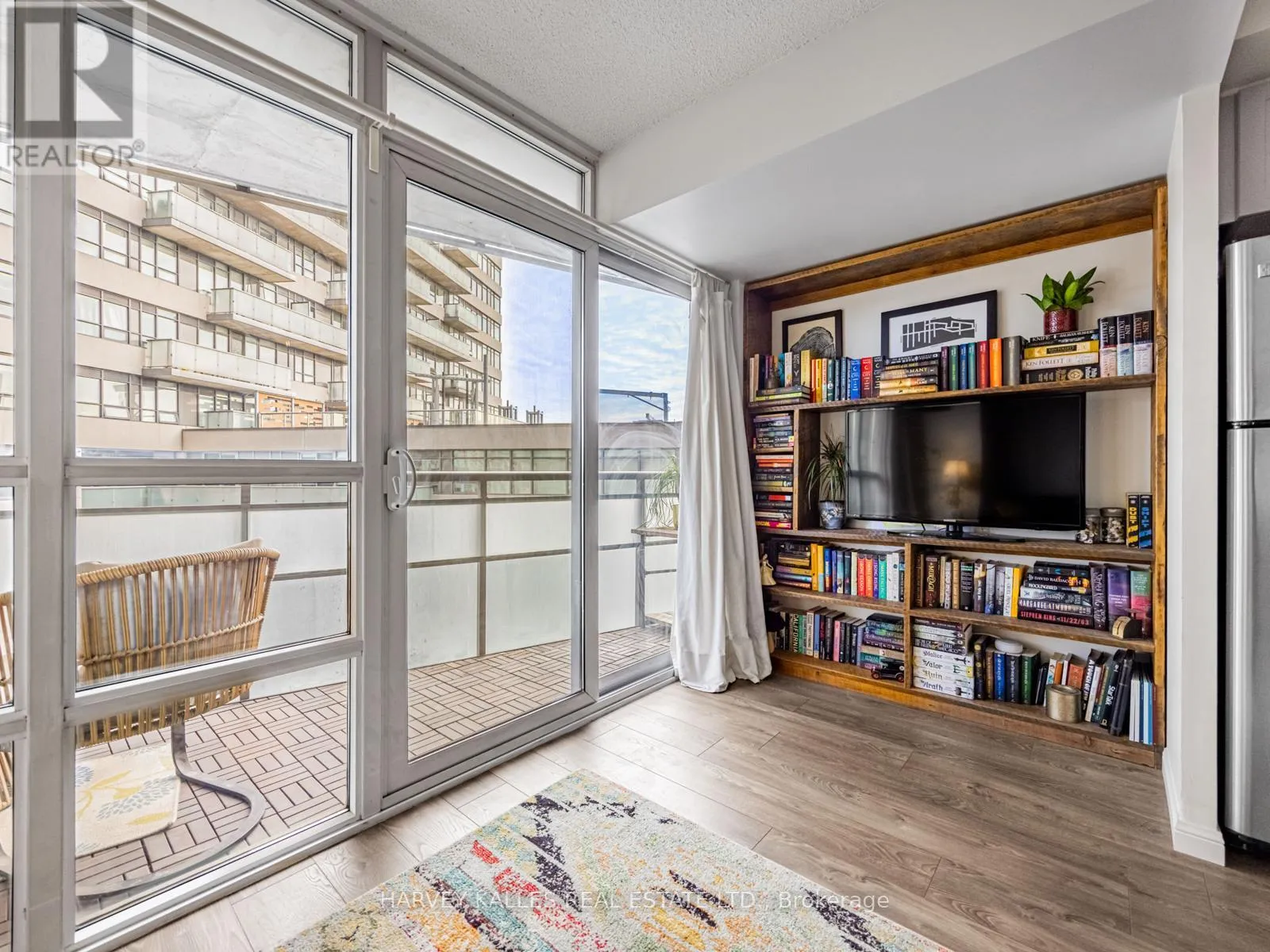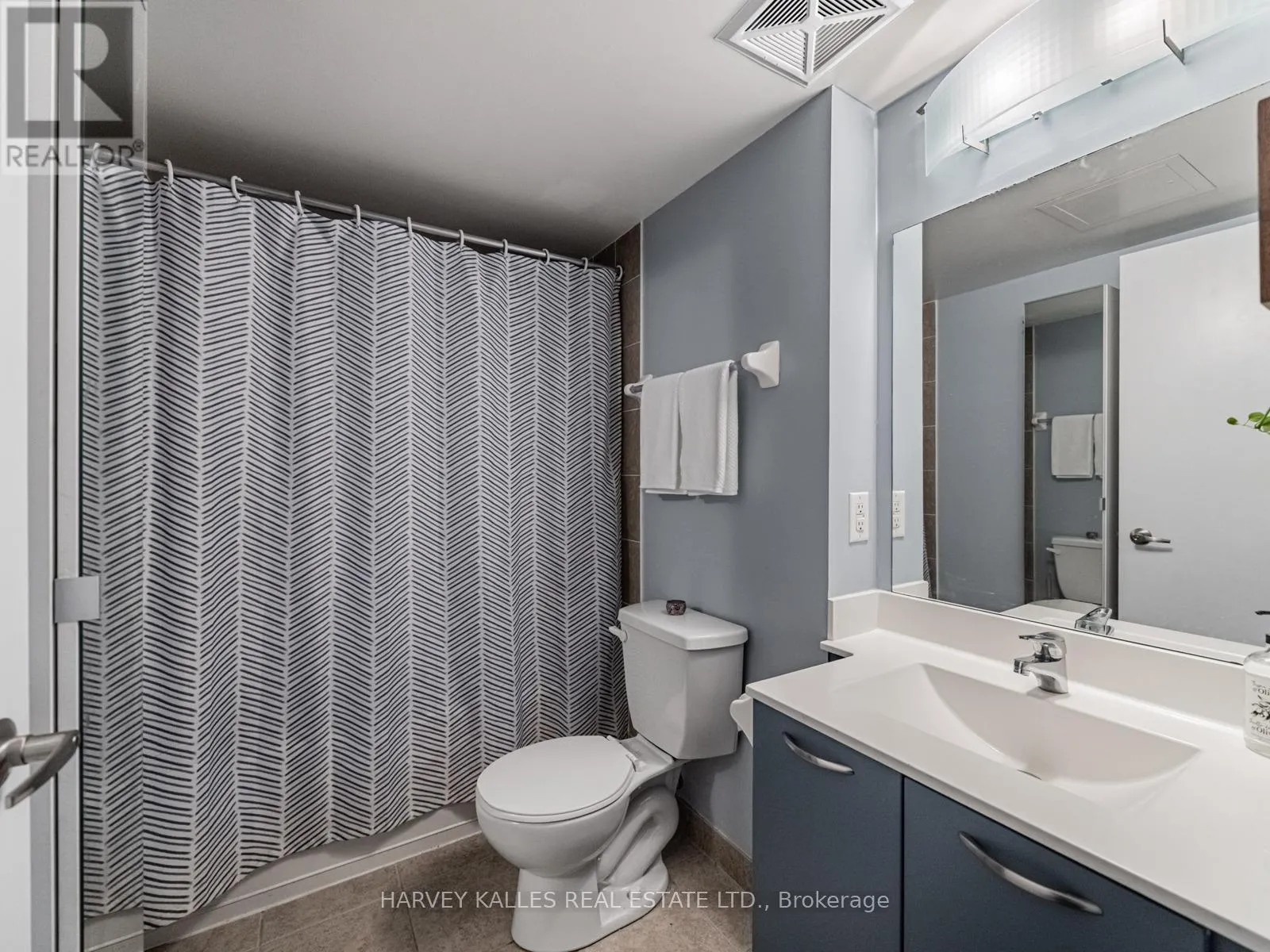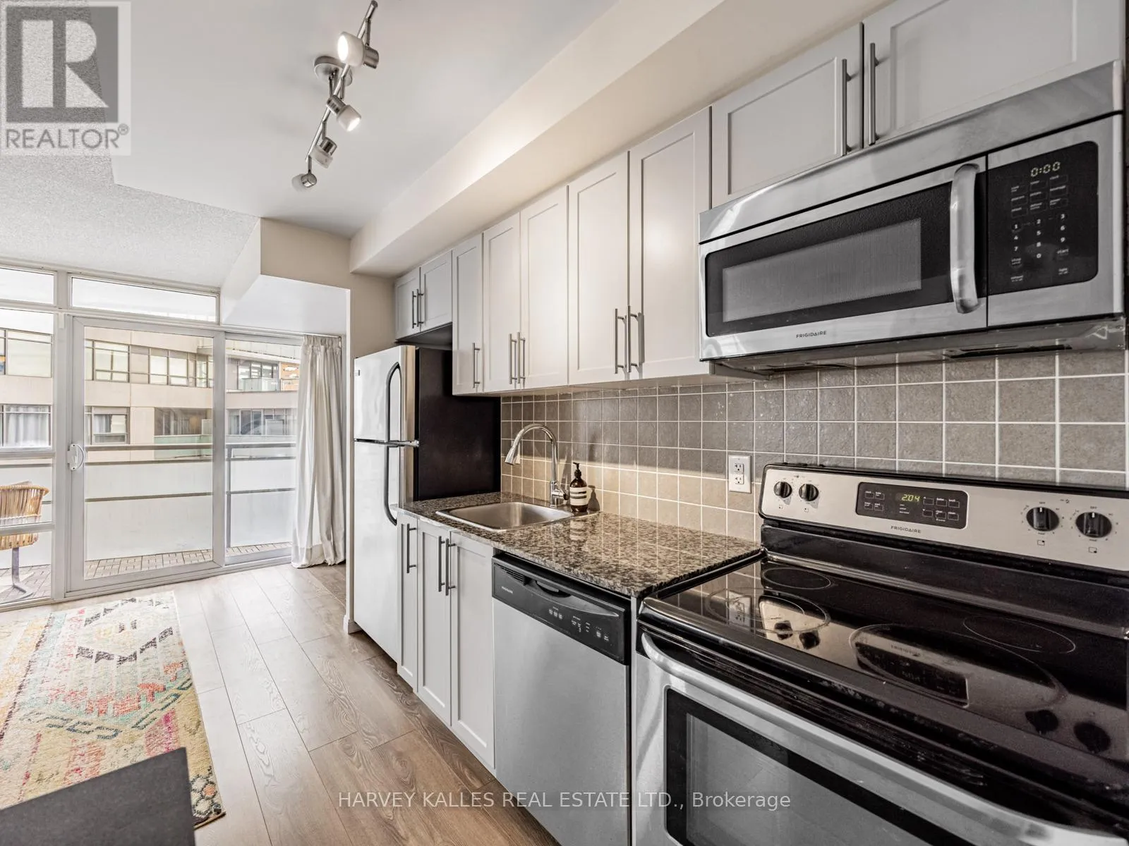 King/Dufferin Beautifully renovated and thoughtfully designed, this suite features a gourmet kitchen with updated cabinetry, stainless steel appliances, granite counters, and a unique extra-large movable centre island with built-in storage and seating for four. New laminate flooring throughout and a balcony with stunning city and lake views. The spacious primary bedroom offers a 4-piece ensuite and mirrored storage cabinet. Approximately 625 sq. ft. of perfectly laid-out space with excellent flow. Enjoy amazing amenities including access to a dog run. Located in the best part of King West-steps to restaurants, shops, public transit, and more. Parking and locker included. (id:27476)