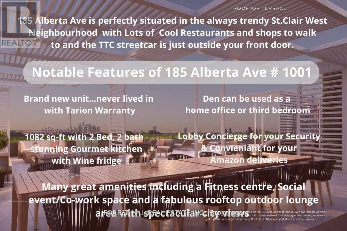 St. Clair Ave W & Alberta Ave **Price Reduced by $100k !! Now is your opportunity to own this brand new unit before its gone** Welcome To The Striking St. Clair Village Boutique Condo In The Always Trendy St Clair West Neighbourhood. This Spacious 1082 Sq/Ft Newly Built 2+1 Bed, 2-Bathroom Condo Has 9Ft Ceilings & Wide Plank Vinyl Flooring Throughout. The Stunning Kitchen Has Custom Cabinetry With Panel Doors, Elegant Stone Counters, Miele Appliances And A Sleek And Functional Island. When You Want A Little Bit Of Fresh Air, There is Fabulous Balcony For You To Enjoy and Grab A Glass Of Wine From Your Wine Fridge. Enjoy the Sunset with West and North Views ---- This Boutique Building Has Wonderful Amenities Including A Well Equipped Fitness Centre, Lounge/Party Room With Temperature Controlled Wine Storage And An Expansive Roof Top Terrace To Socialize And Enjoy The Awesome City And Skyline Views. All Along St. Clair West You Have Many Cool And Hip Restaurants, Shops And Services, The TTC At Your Doorstep And Your Very Own LCBO Downstairs To Keep That Wine Fridge Stocked. (id:27476)