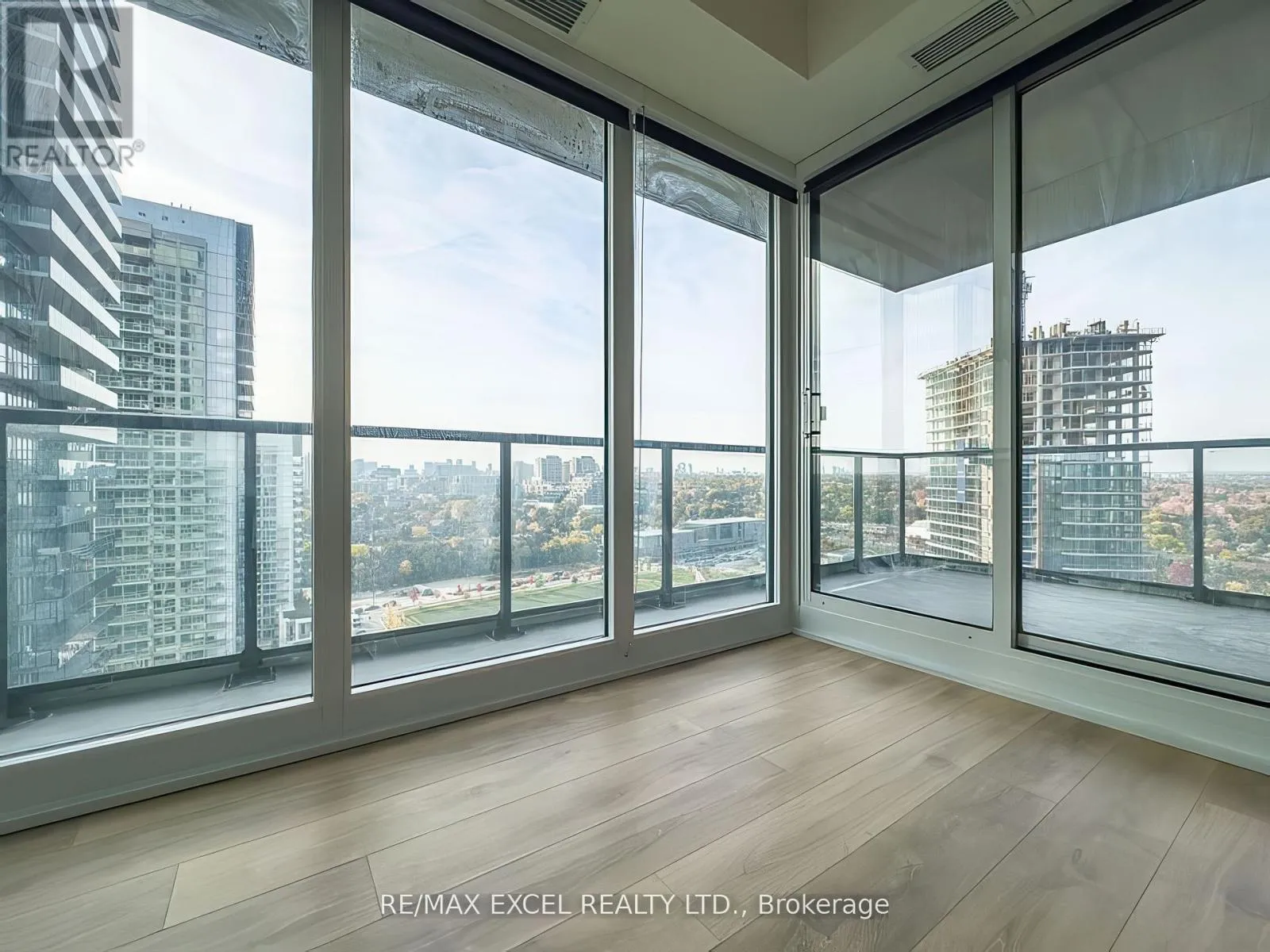 Leslie and Sheppard Stunning two-bedroom, two-bathroom corner unit with expansive panoramic park views. This bright and spacious layout features floor-to-ceiling windows and a large wrap-around balcony. The modern kitchen is equipped with top of the line appliances , ample cabinetry, and a quartz countertop. Hardwood flooring extends throughout the unit, which is in excellent condition. The primary bedroom includes a four-piece ensuite and a generous closet. High-end finishes throughout. Located in a luxurious, brand-new building by Concord, this northwest corner unit offers unbeatable access to amenities: a short walk to the subway, GO Train, future community center, parks, Bayview Village, Fairview Mall, IKEA, North York General Hospital, and highways 401 & 404. (id:27476)