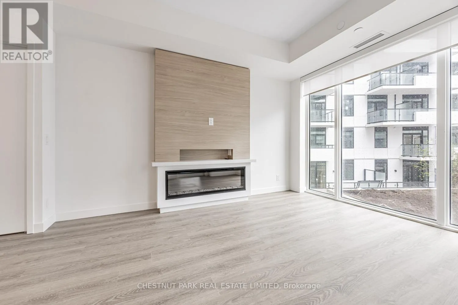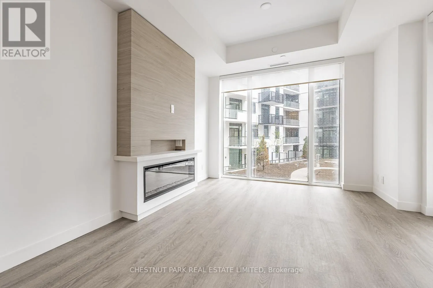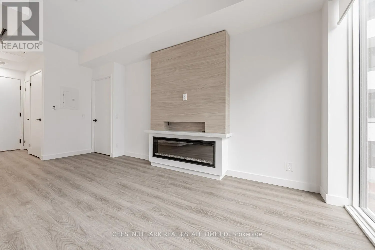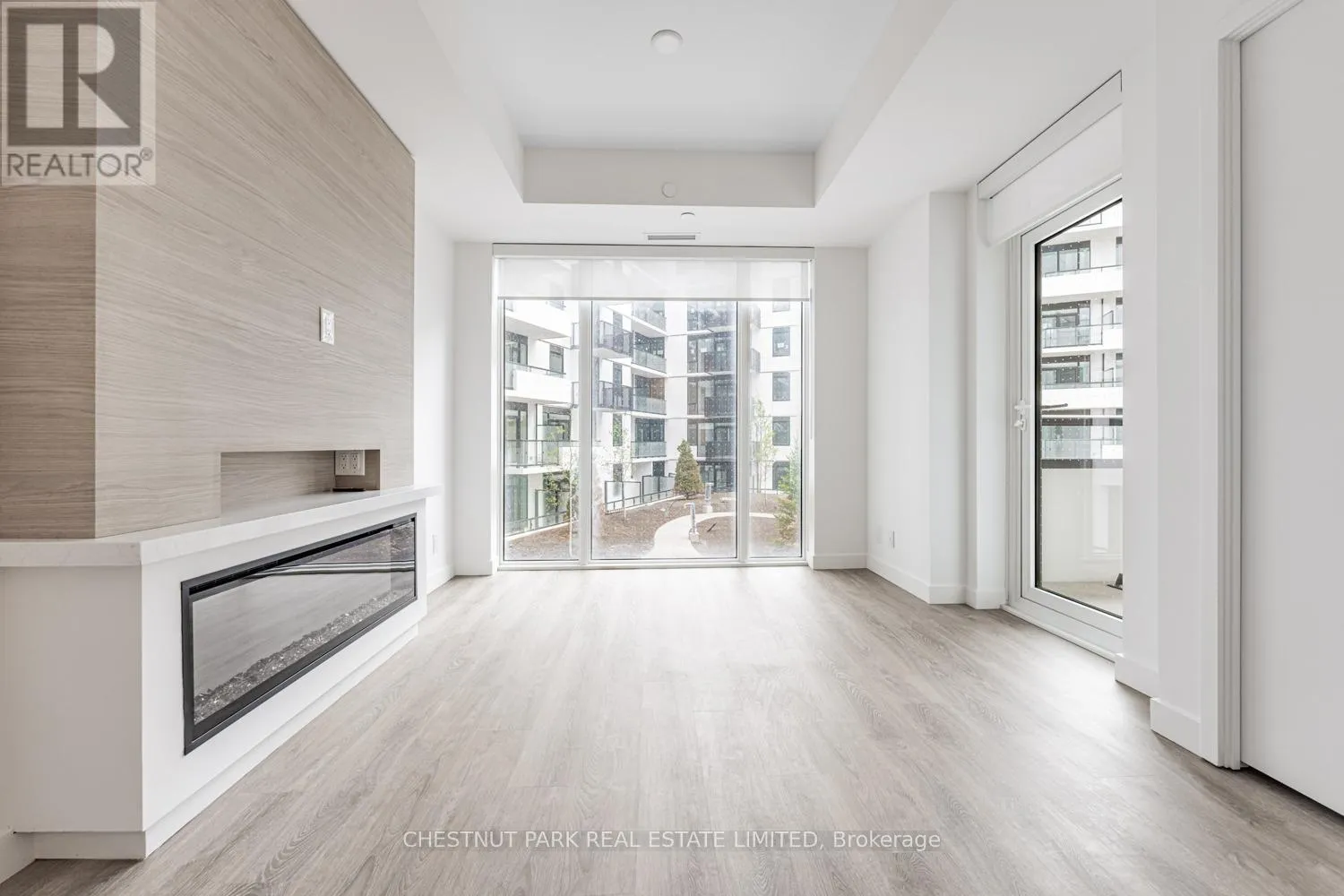 Cross Streets: Queen & Coxwell. ** Directions: Across Woodbine Park & Ashbridges Bay. Upgraded 1 bedroom with fireplace & rooftop green views at Queen & Ashbridge Condominiums. Open concept layout with light, bright & modern finishes including oak design vinyl flooring throughout, spacious walk-in closet and electric fireplace. Kitchen features quartz countertops/backsplash and integrated appliances. Stylish bathroom includes soaker tub, handheld shower head with slide bar and vanity with storage drawers. Balcony overlooks podium rooftop urban forest with trees and resident gardening plots, away from the surrounding streets. Building will feature exceptional amenities for this location, including concierge, spacious fitness centre (spin studio, cardio area, strength training area, functional training space, yoga studio, change rooms & steam rooms), beautifully furnished co-working space with double-height ceilings and windows, sky lounge with BBQ terrace and 7 guest suites. Located directly across from Woodbine Park with services, shopping, dining, and entertainment at doorstep. Quick commute to downtown via 501 streetcar or bike along Lake Shore. Farm Boy, Loblaw's & Bruno's Fine Foods approximately 15 minute walk away. Some images have been virtually staged. (id:27476)