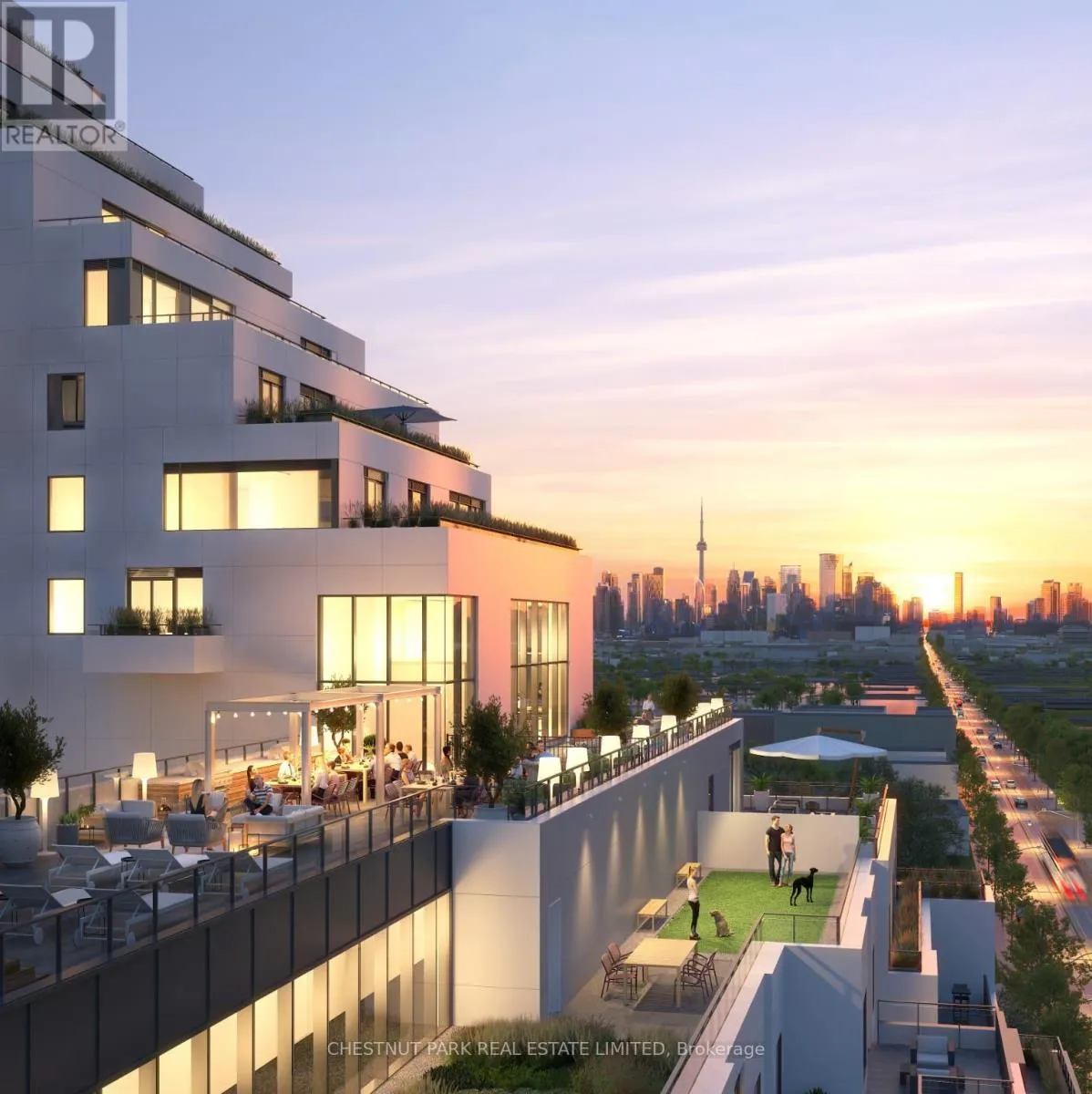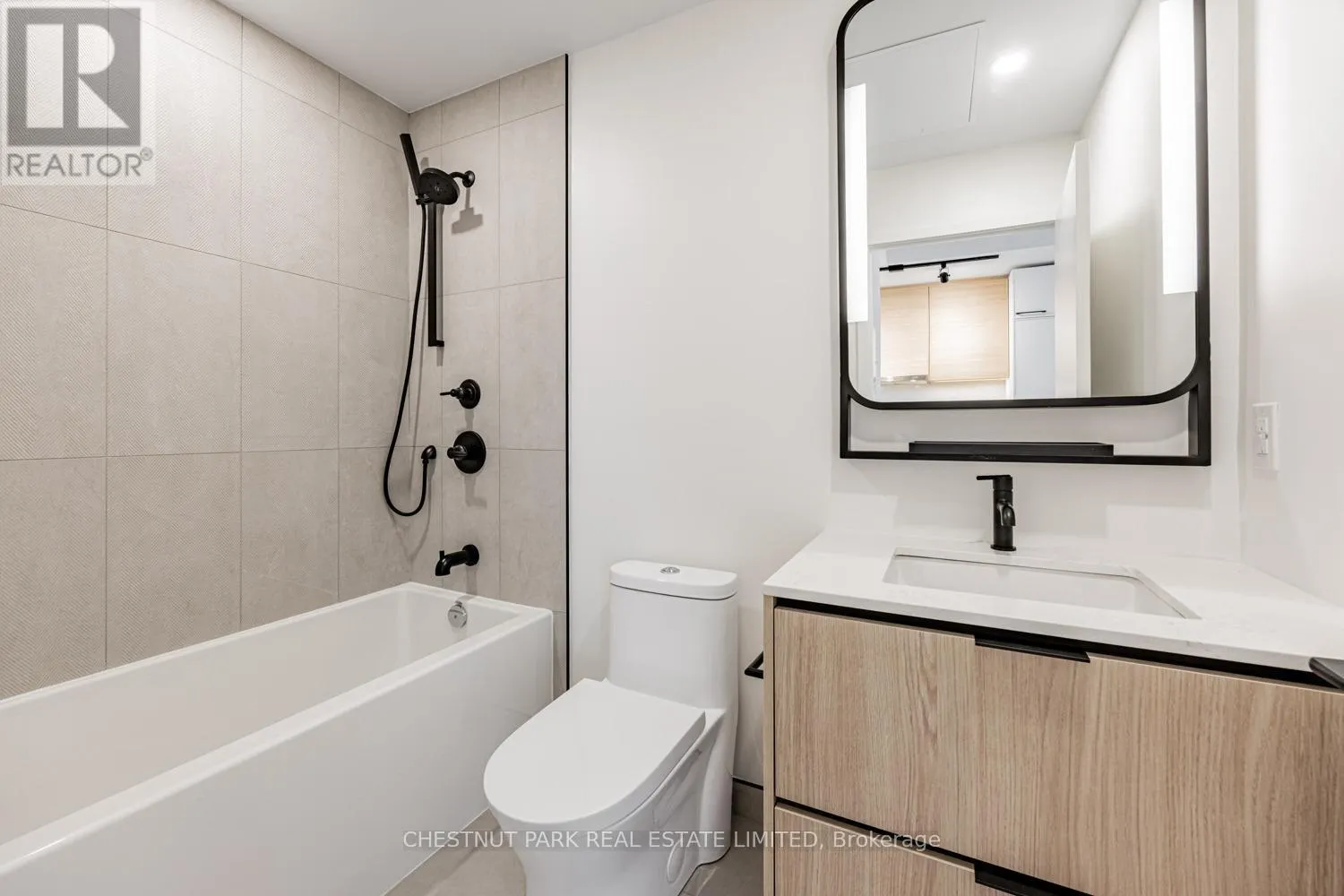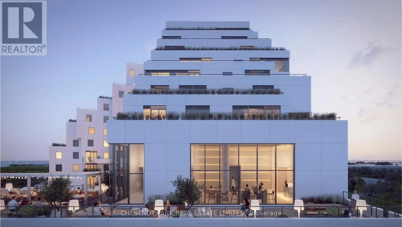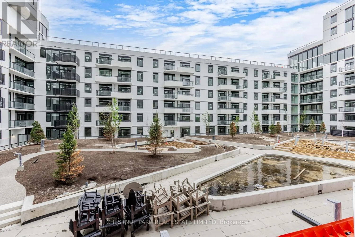 Cross Streets: Queen & Coxwell. ** Directions: Across Woodbine Park & Ashbridges Bay. Upgraded 1 bedroom with fireplace & rooftop green views at Queen & Ashbridge Condominiums. Open concept layout with light, bright & modern finishes including oak design vinyl flooring throughout, spacious walk-in closet and electric fireplace. Kitchen features quartz countertops/backsplash and integrated appliances. Stylish bathroom includes soaker tub, handheld shower head with slide bar and vanity with storage drawers. Balcony overlooks podium rooftop urban forest with trees and resident gardening plots, away from the surrounding streets. Building will feature exceptional amenities for this location, including concierge, spacious fitness centre (spin studio, cardio area, strength training area, functional training space, yoga studio, change rooms & steam rooms), beautifully furnished co-working space with double-height ceilings and windows, sky lounge with BBQ terrace and 7 guest suites. Located directly across from Woodbine Park with services, shopping, dining, and entertainment at doorstep. Quick commute to downtown via 501 streetcar or bike along Lake Shore. Farm Boy, Loblaw's & Bruno's Fine Foods approximately 15 minute walk away. Some images have been virtually staged. (id:27476)
