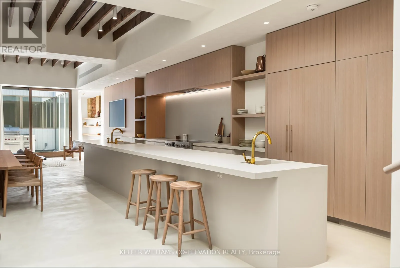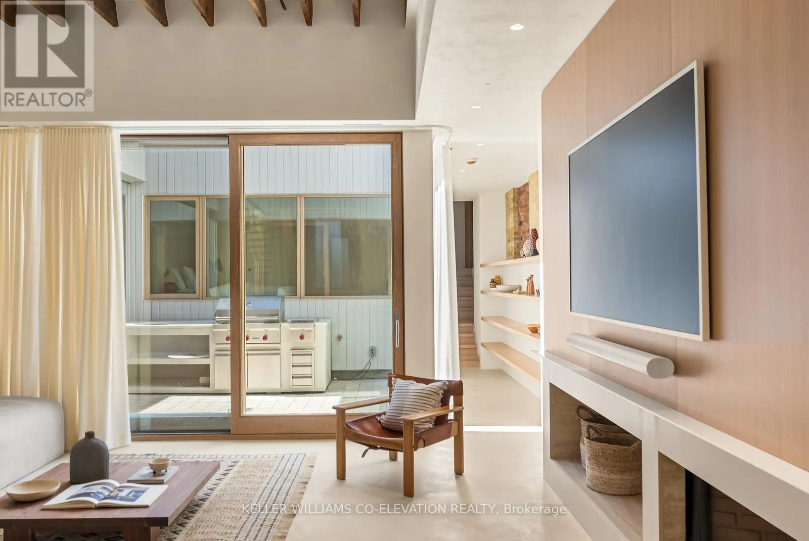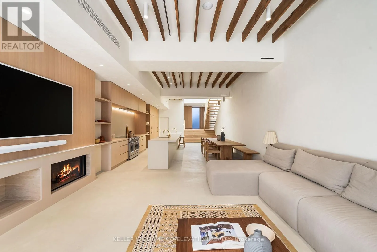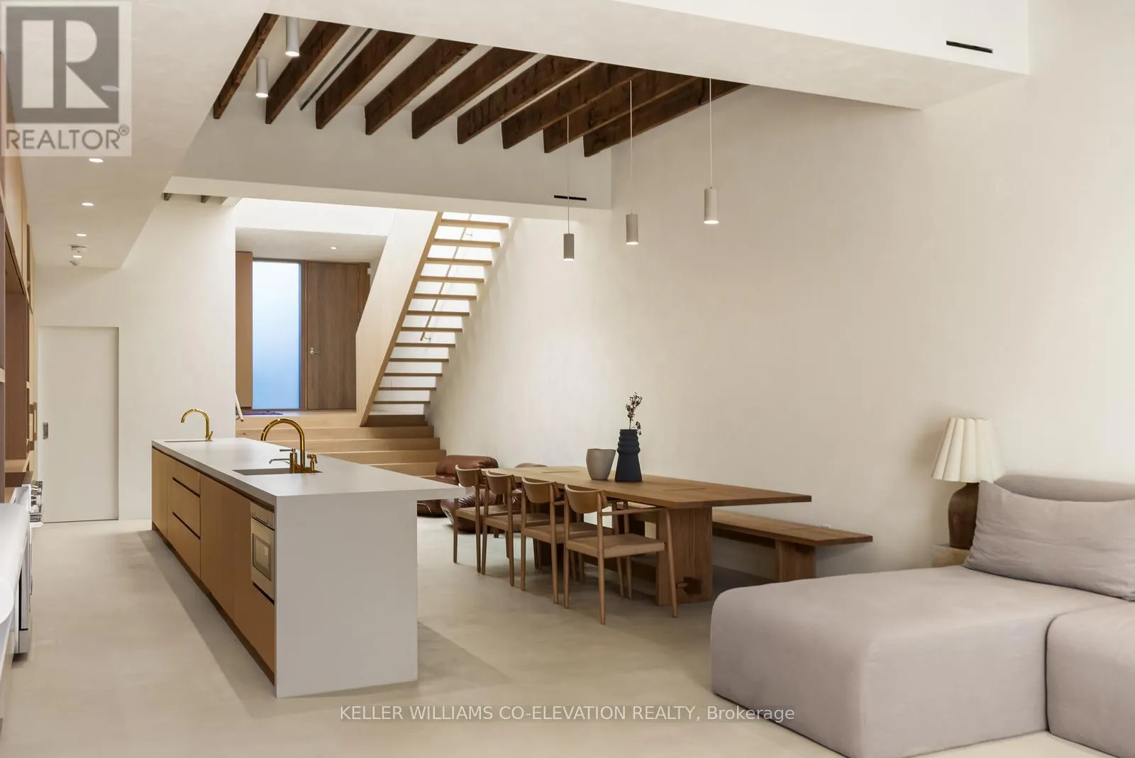 Cross Streets: Lansdowne & Wallace. ** Directions: South of Dupont. Welcome to the North Residence at 722 Lansdowne, a fully furnished Executive Mid-Term Rental located in Toronto's vibrant Junction neighbourhood. Designed by StudioAC, one of Canada's most celebrated architecture firms, this luxurious 2 bed, 2 bath home is a perfect balance of heritage, innovation, serenity and refined opulence. The interior features a monochromatic palette of limewash painted walls, micro-cement floors, and solid white oak millwork. The main floor opens to a double height atrium and a monumental dining, kitchen and living space. Original exposed rafters and brickwork nod to the building's history, while curated stone surfaces bring elegant modern craftsmanship to every detail. A centre courtyard and expansive rooftop terrace provide this home with a connection to nature and light. The huge primary suite has a spa like en suite with a walk out to a signature Japanese maple courtyard. Fully furnished with a King bed in the primary, Queen bed in the second bedroom, sectional couch, dining table, dining chairs and accent furniture. All appliances, equipped kitchen, gym equipment, built in office, gas bbq & secure interior parking. (id:27476)