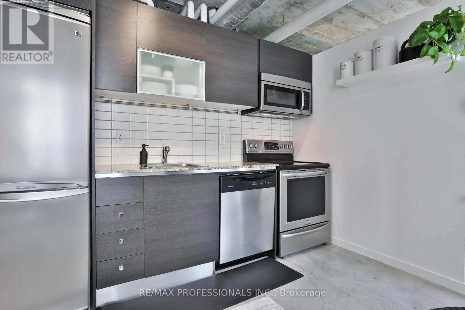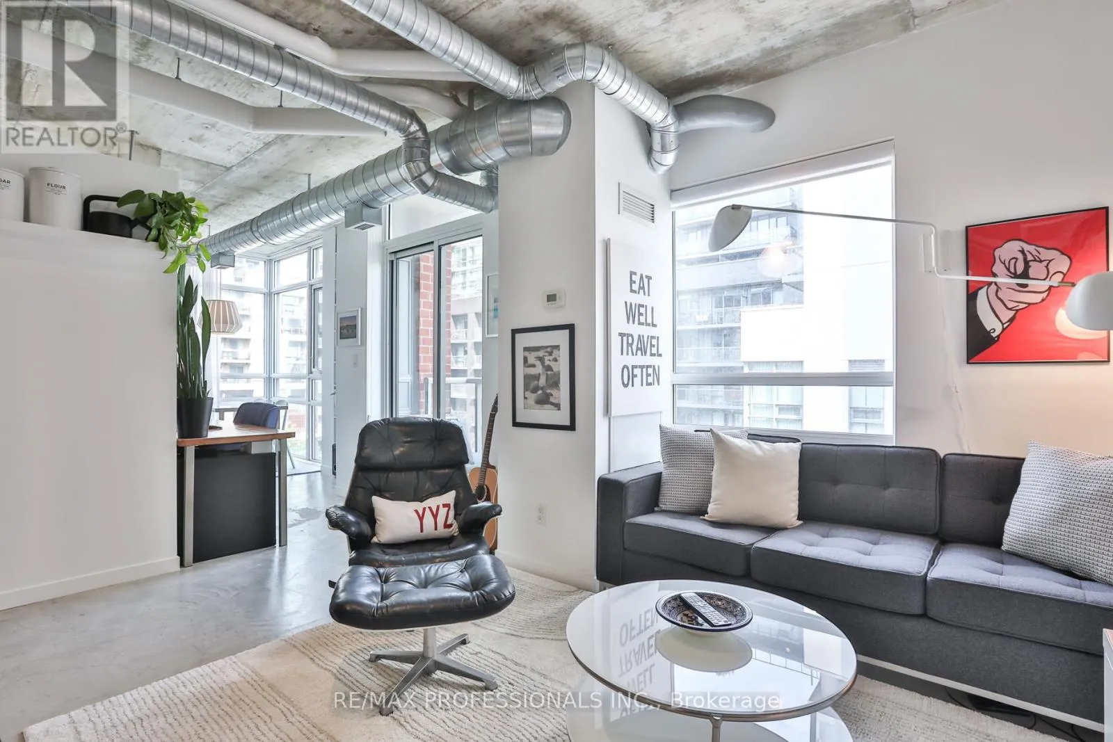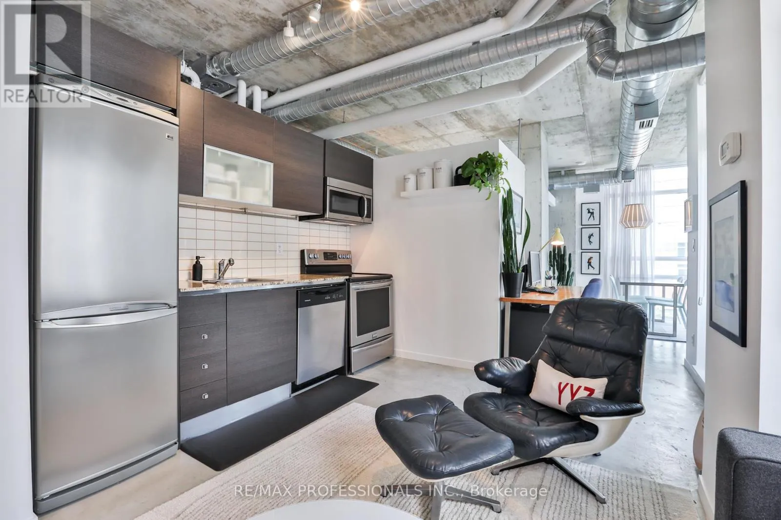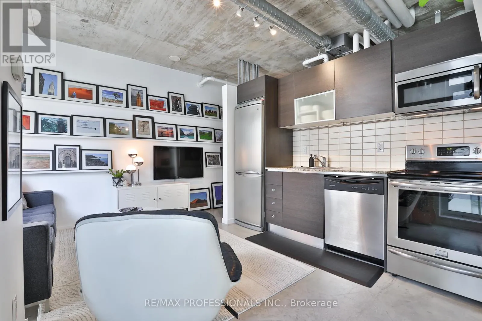 Cross Streets: Queen/Dufferin. ** Directions: South of Queen. Welcome to the Westside Gallery Lofts, where industrial-chic style meets unbeatable location! Nestled in the vibrant heart of Queen West, this cool and contemporary 1 bedroom suite offers the ultimate in stylish urban living. Step into a thoughtfully designed open concept space featuring polished concrete floors, soaring 9 foot ceilings, floor-to-ceiling windows, and exposed ductwork that give the unit its signature loft feel. The modern kitchen is well-appointed with stainless steel appliances, granite countertops, and seamlessly flows into the living and dining areas, perfect for entertaining or relaxing at home. A walk-out balcony extends your living space and brings in tons of natural light. The spacious bedroom includes a large double closet and a 4-piece ensuite bath, providing both comfort and functionality. Building amenities include a party room, guest suites, visitor parking, and plans to expand the gym/fitness centre into the current pool area. Experience the energy of one of Toronto's most dynamic neighbourhoods. Surrounded by Queen West's top restaurants, bars, cafes, galleries, and boutique shopping, you're just steps from iconic hotspots like The Drake Hotel, Gladstone House, the Ossington Strip, and Trinity Bellwoods Park. With 24-hour TTC service at your doorstep, the Exhibition GO Station a short walk away, and easy access to King West, Liberty Village, Parkdale, and the Gardiner Expressway, every corner of the city is within reach. (id:27476)
