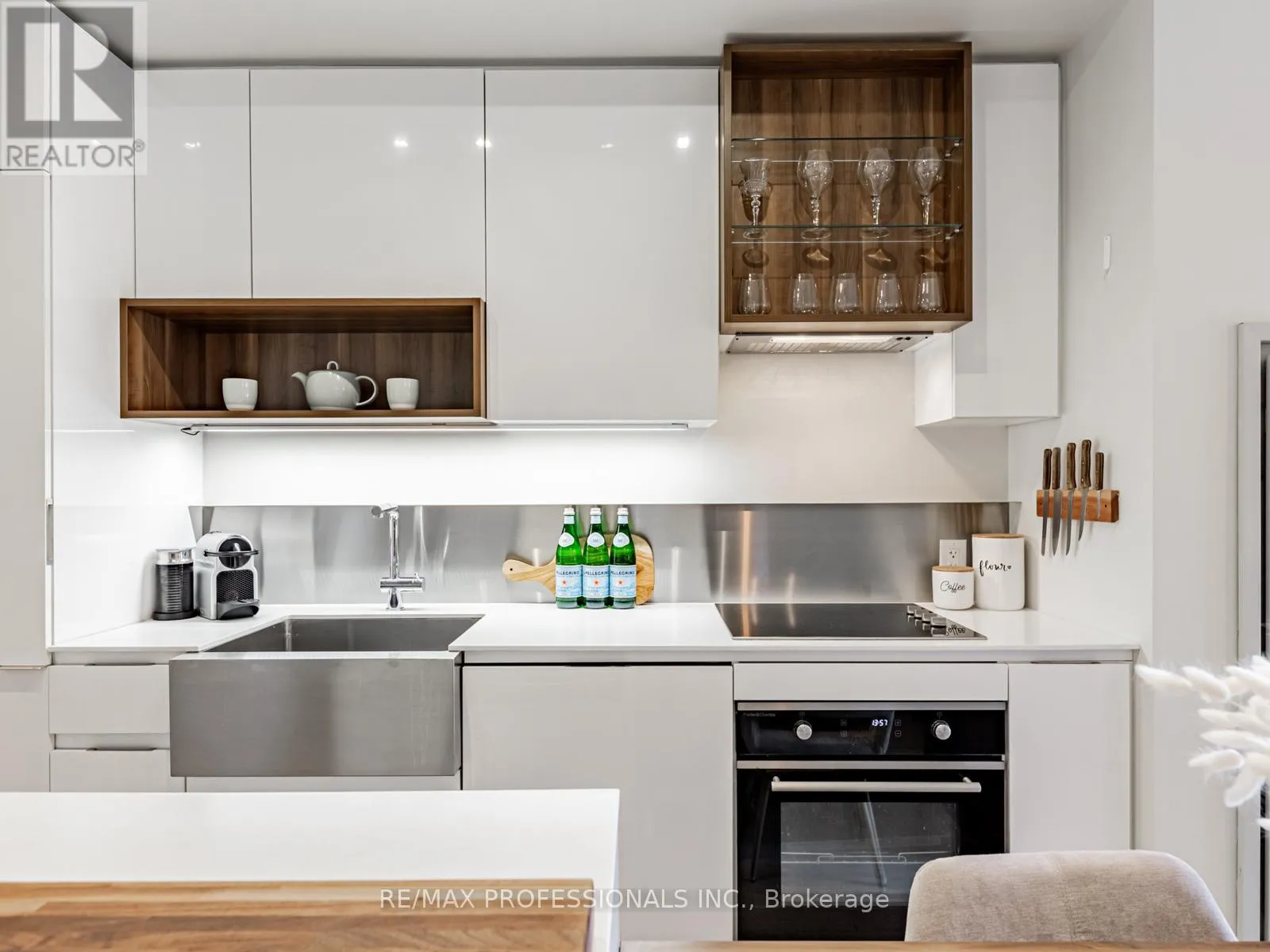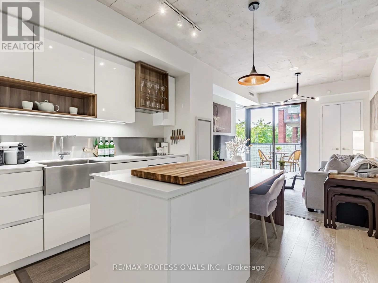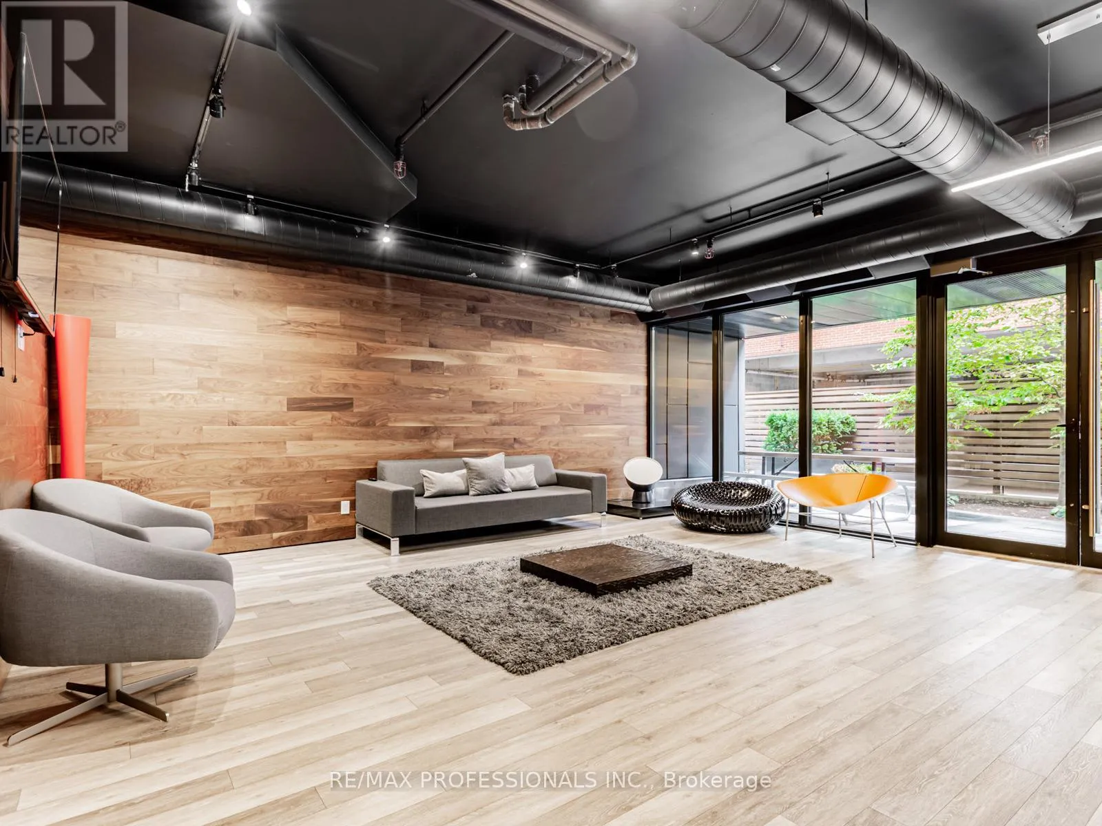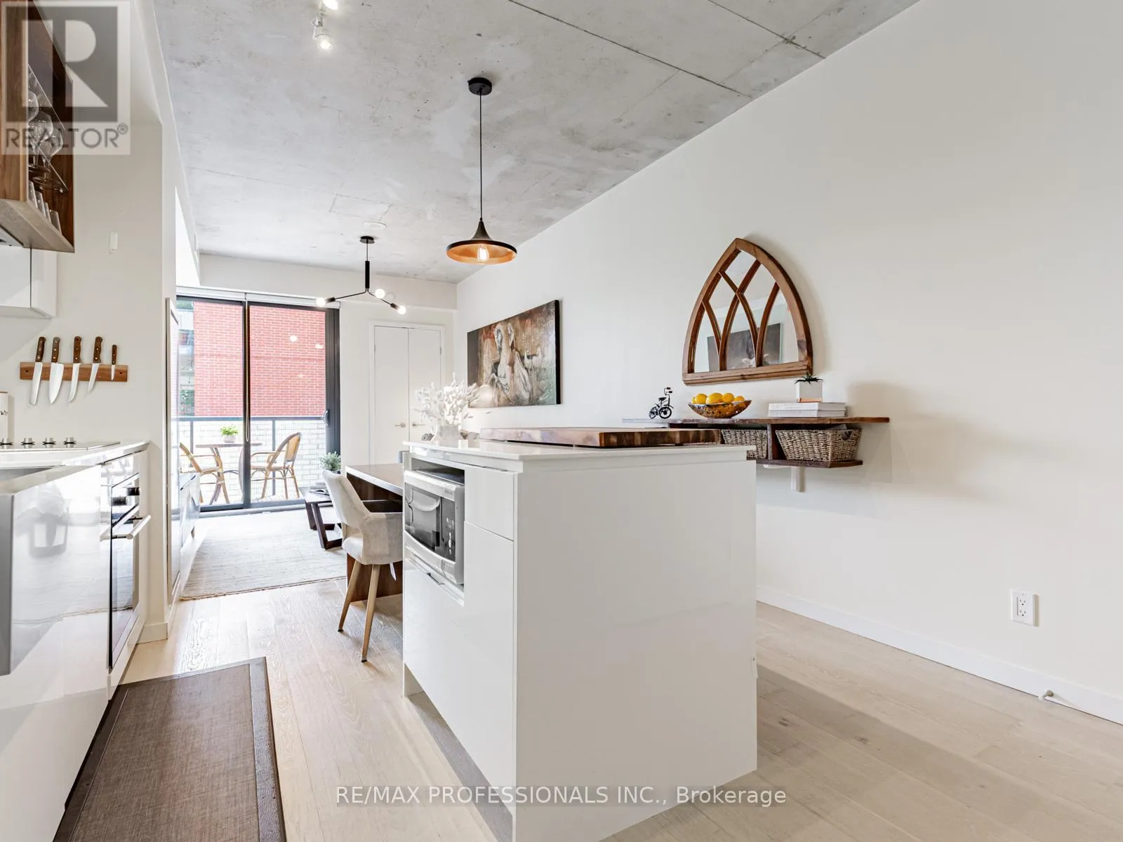 Dundas/Sorauren Live in one of Toronto's most sought-after neighbourhoods, in a boutique building designed by renowned neo-modern architect Peter Clewes. This intimate and stylish residence offers the perfect balance of design and function. This thoughtfully planned 1+den suite with two full baths features a versatile den that can easily serve as a second bedroom or home office. Soaring nine-foot exposed concrete ceilings, floor-to-ceiling black-framed windows that flood the unit in sunlight, and bleached oak floors fill the space with natural light and give it a modern edge. The sleek kitchen is equipped with built-in appliances, quartz counters, a stainless steel backsplash, oversized sink, and crisp white cabinetry. A custom island with quartz counters extends into a walnut dining table, creating a seamless space for both cooking and entertaining. The primary bedroom offers pot lighting, floor-to-ceiling windows, double closets, and a spa-like three-piece ensuite with a frameless glass walk-in shower. A private covered balcony, integrated front closet, ensuite storage, and in-suite laundry complete the home, along with one underground parking space. Residents enjoy exceptional building amenities including a gym, party room, concierge, BBQ area, bike storage, and visitor parking. Situated in the heart of Roncesvalles, one of Toronto's most vibrant communities, this home is surrounded by cafes, restaurants, markets, shops, and parks including an off-leash dog park! With quick TTC access by streetcar or subway, downtown is only minutes away. Stylish, functional, and ideally located, this condo offers the best of both home and neighbourhood. (id:27476)