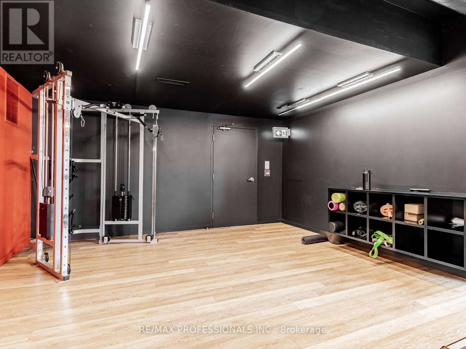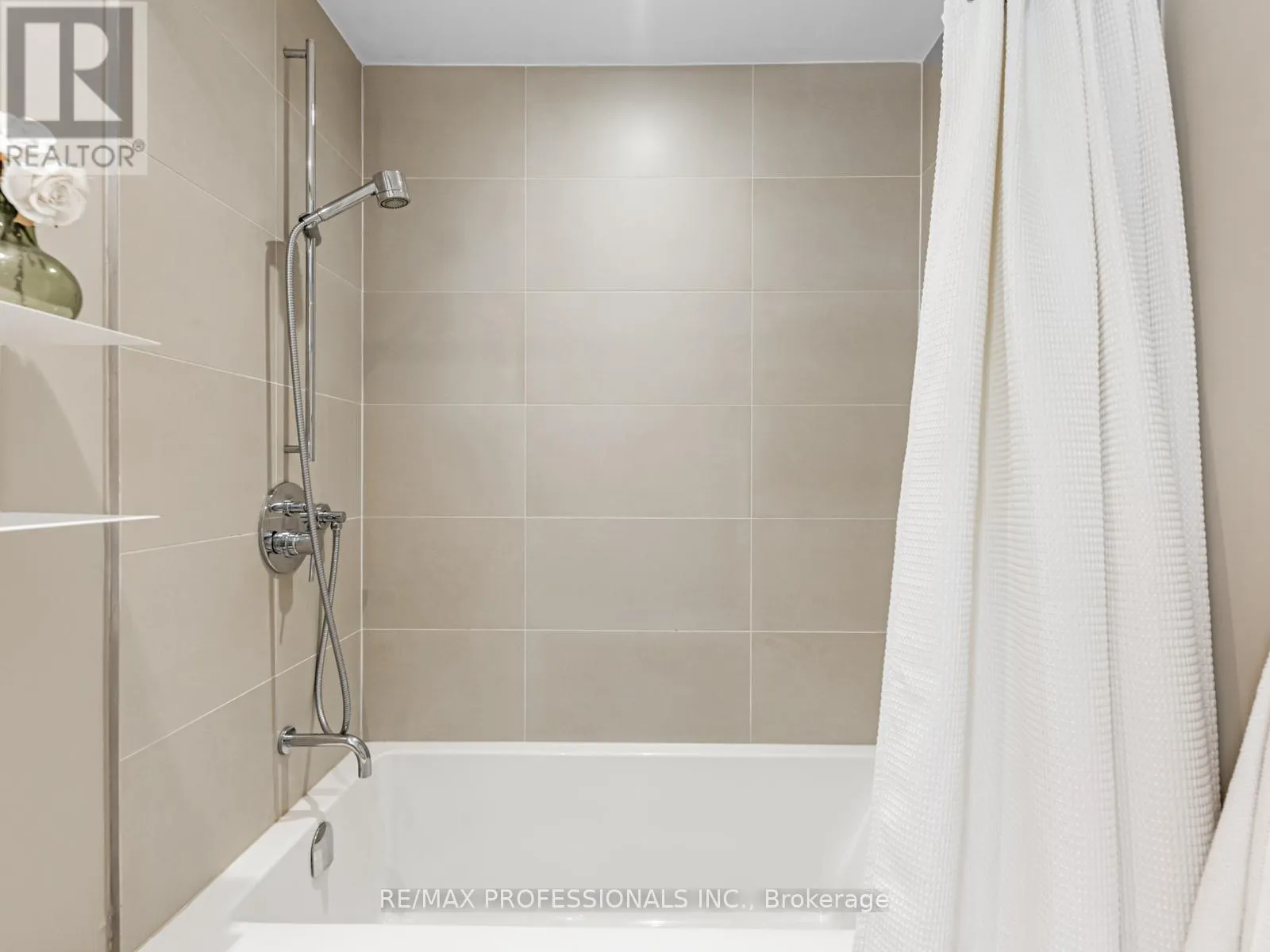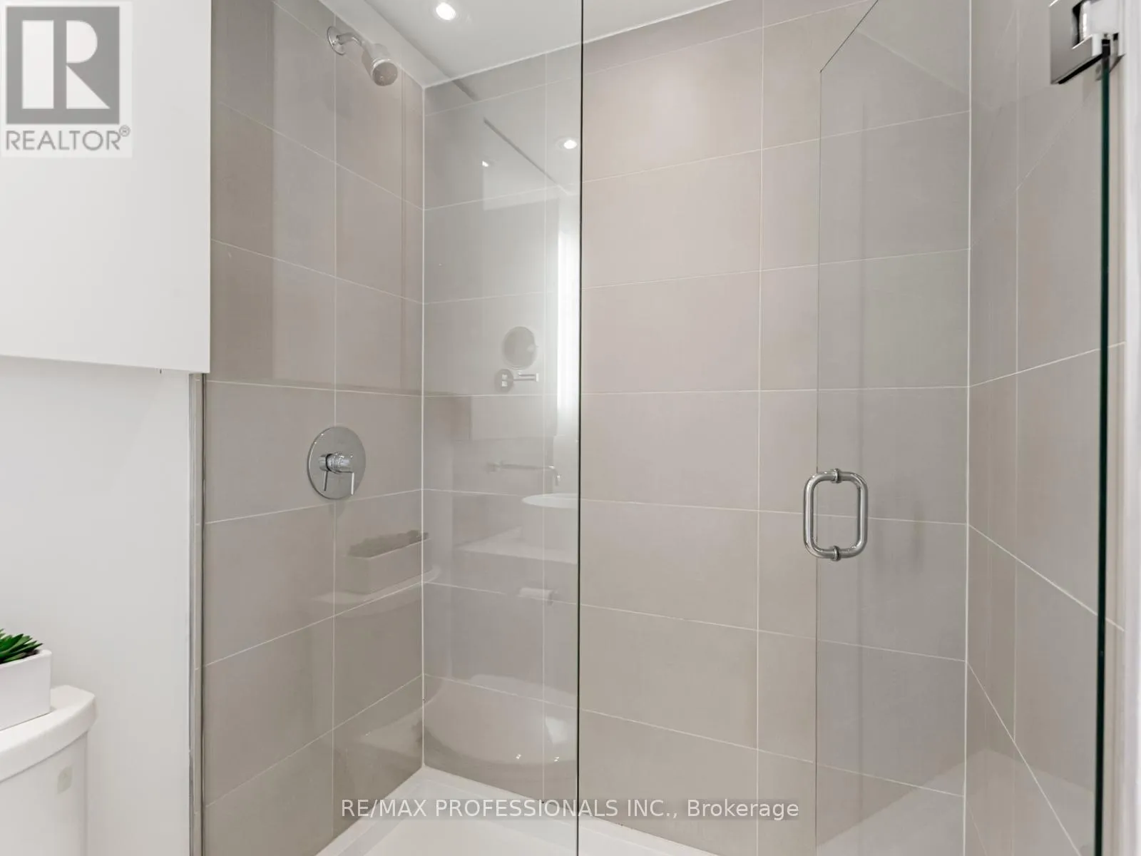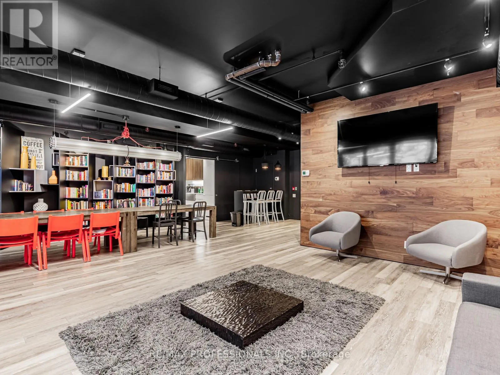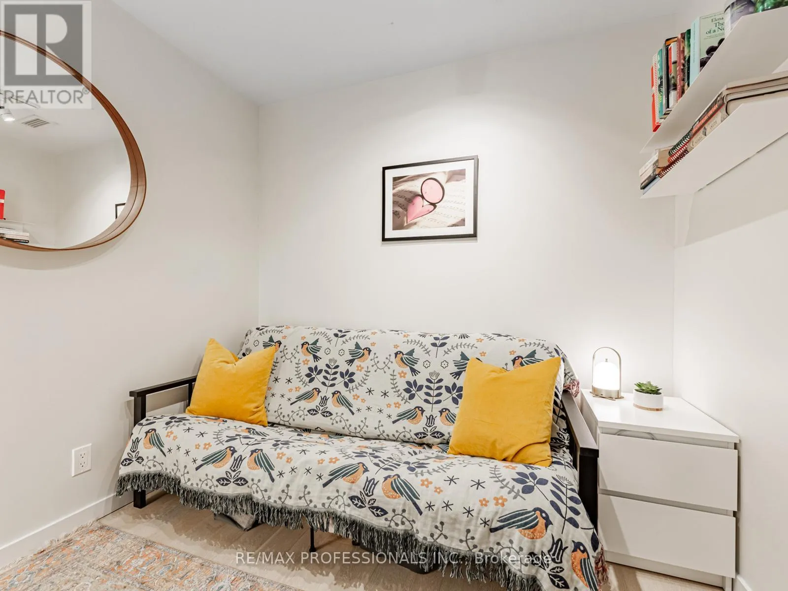 Dundas/Sorauren Live in one of Toronto's most sought-after neighbourhoods, in a boutique building designed by renowned neo-modern architect Peter Clewes. This intimate and stylish residence offers the perfect balance of design and function. This thoughtfully planned 1+den suite with two full baths features a versatile den that can easily serve as a second bedroom or home office. Soaring nine-foot exposed concrete ceilings, floor-to-ceiling black-framed windows that flood the unit in sunlight, and bleached oak floors fill the space with natural light and give it a modern edge. The sleek kitchen is equipped with built-in appliances, quartz counters, a stainless steel backsplash, oversized sink, and crisp white cabinetry. A custom island with quartz counters extends into a walnut dining table, creating a seamless space for both cooking and entertaining. The primary bedroom offers pot lighting, floor-to-ceiling windows, double closets, and a spa-like three-piece ensuite with a frameless glass walk-in shower. A private covered balcony, integrated front closet, ensuite storage, and in-suite laundry complete the home, along with one underground parking space. Residents enjoy exceptional building amenities including a gym, party room, concierge, BBQ area, bike storage, and visitor parking. Situated in the heart of Roncesvalles, one of Toronto's most vibrant communities, this home is surrounded by cafes, restaurants, markets, shops, and parks including an off-leash dog park! With quick TTC access by streetcar or subway, downtown is only minutes away. Stylish, functional, and ideally located, this condo offers the best of both home and neighbourhood. (id:27476)