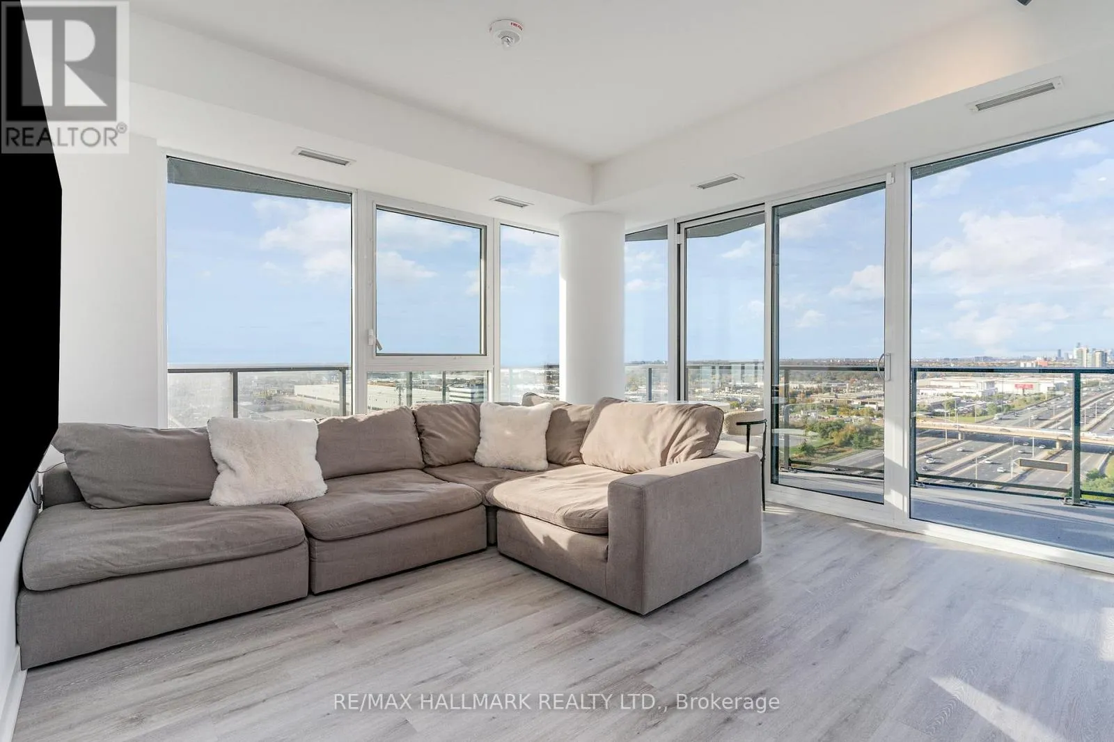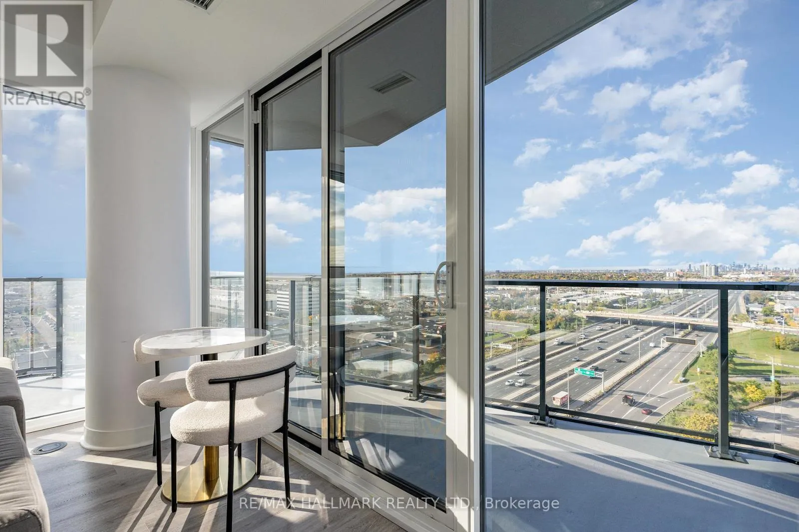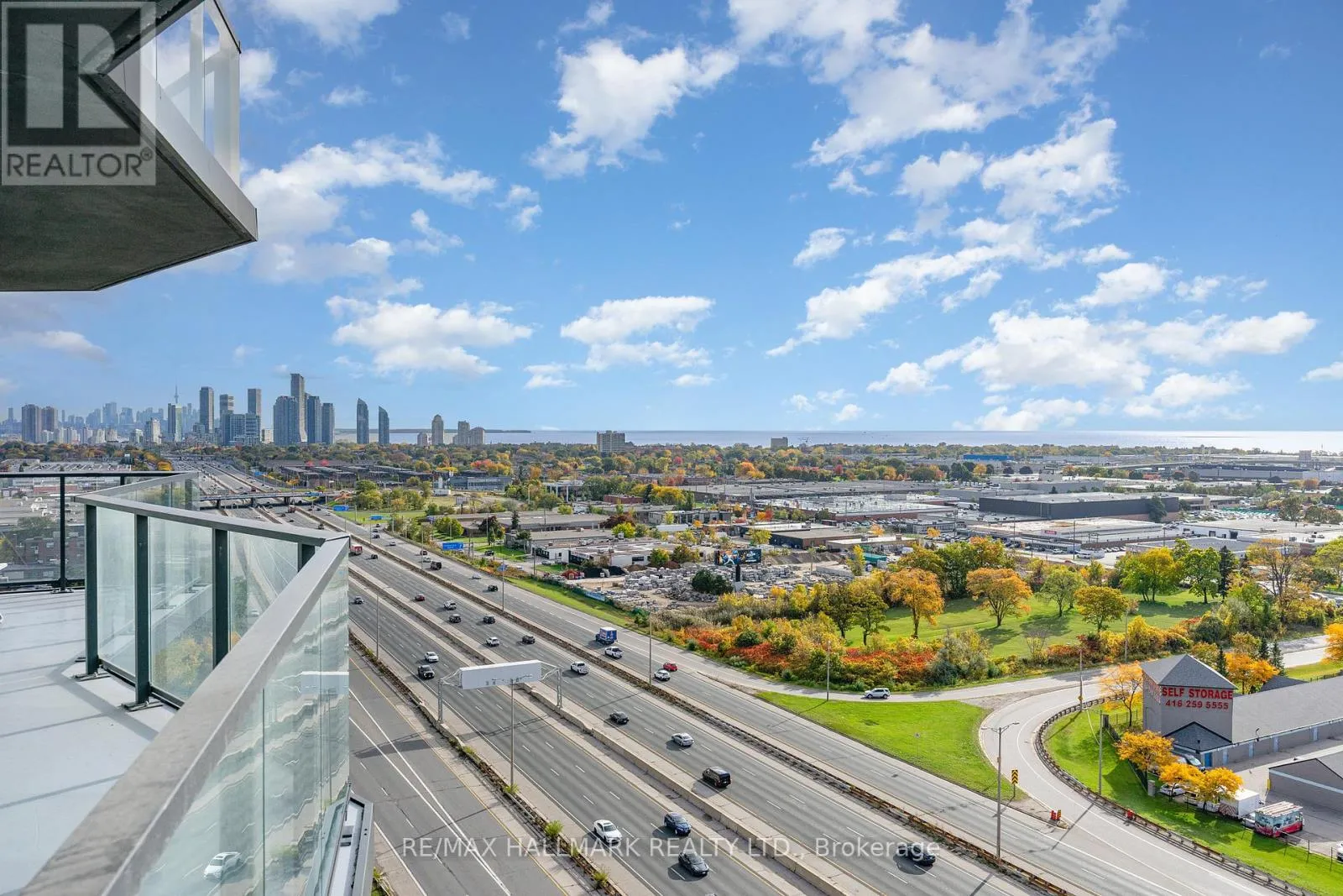 The Queensway/Zorra Experience refined luxury living at 36 Zorra Street, where contemporary design meets everyday comfort. This stunning corner suite showcases unobstructed lake and sunset views from every room, offering a sophisticated retreat in the heart of Etobicoke. Thoughtfully upgraded and meticulously maintained, this 2+1 bedroom, 2-bath residence includes a premium parking space and features over 800 sq ft of interior living space, complemented by a wrap-around 300 sq ft balcony-ideal for sunset cocktails or morning coffee above the city skyline.The intelligently designed open-concept layout maximizes functionality without compromising style. Floor-to-ceiling windows bathe every room in natural light, while smooth cabinetry, sleek black fixtures, and elegant finishes create a cohesive, modern aesthetic. Both bedrooms are generously sized, and the spacious den offers a versatile space-perfect for a home office, studio, or guest area. Every inch of this suite reflects thoughtful design and understated elegance.Residents enjoy access to over 9,500 sq ft of resort-style amenities, including a 7th-floor rooftop pool with cabanas, BBQ and fire pit areas, a state-of-the-art gym, yoga studio, sauna, kids' club, hobby room, arcade, and multiple entertainment lounges. Additional conveniences include 24-hour security, guest suites, and a private resident shuttle to Kipling subway station for seamless downtown access.Ideally located in The Queensway, one of Etobicoke's most dynamic neighbourhoods, you'll love the walkability to restaurants, cafes, Sherway Gardens, and the ease of major highway access.A perfect blend of luxury, location, and lifestyle-this residence redefines elevated urban living at 36 Zorra. (id:27476)