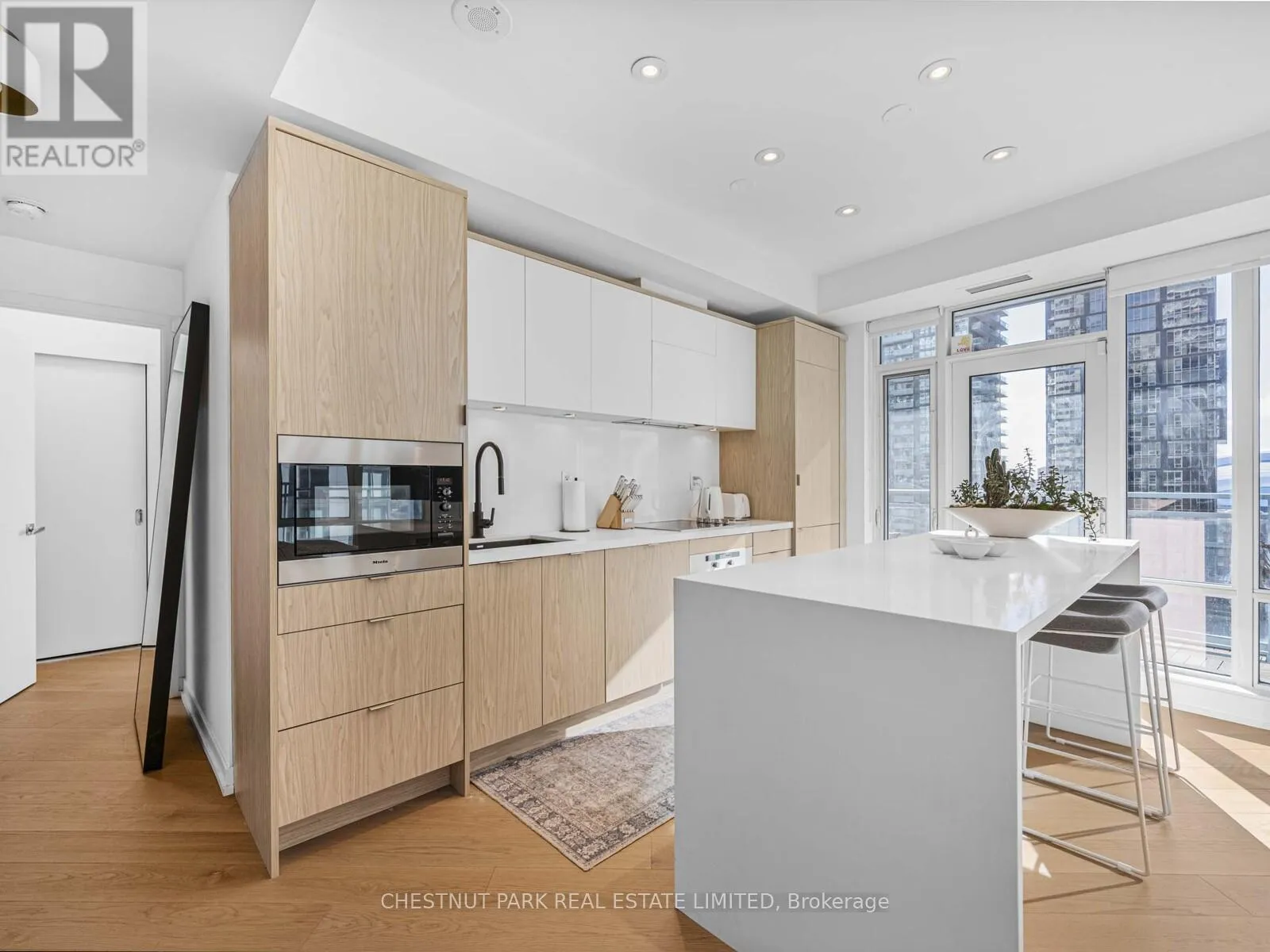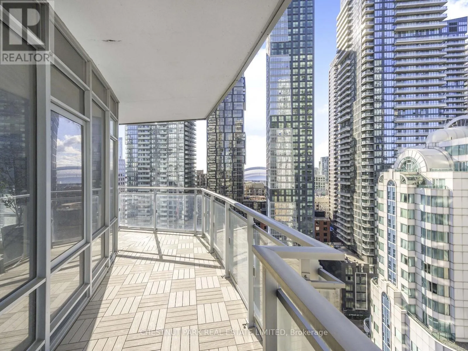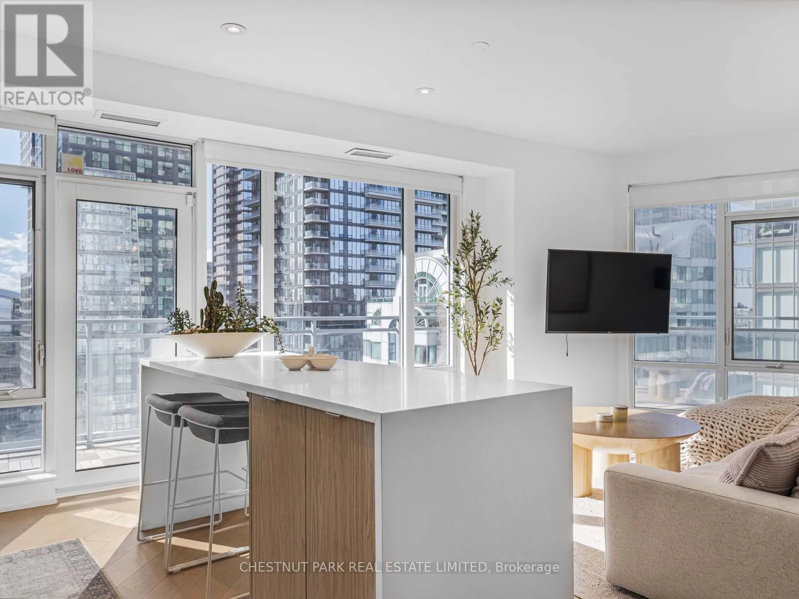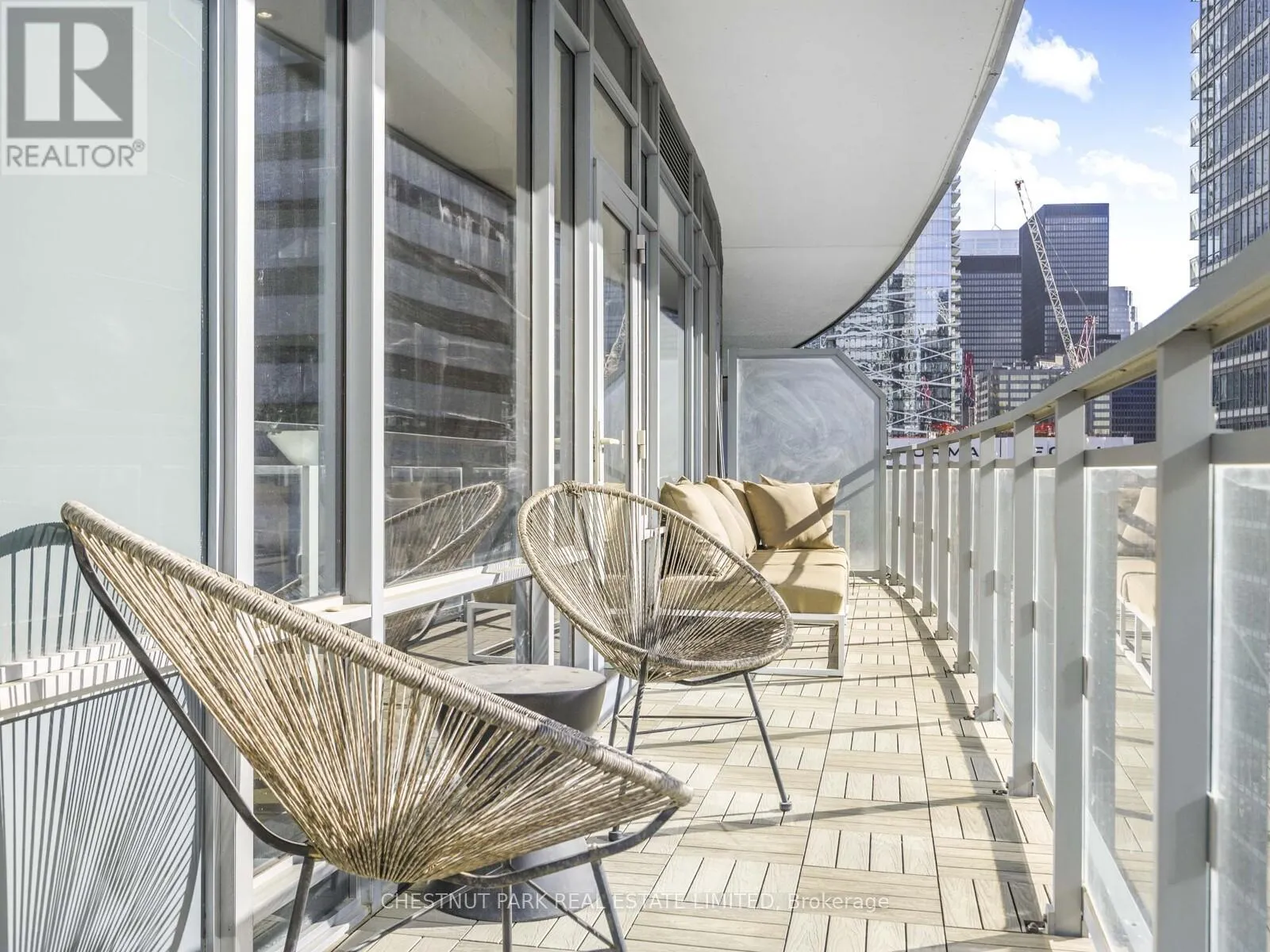 Cross Streets: Adelaide St / John St. ** Directions: North of King and South of Adelaide. Fully furnished and move-in ready. Large corner suite featuring a 2-bedroom, 2-bathroom layout with elegant white oak flooring and a sleek chefs kitchen with a custom island that make meals and entertaining both easy and and an elevated experience. Built-in closets in both bedrooms and in the hallway provide exceptional storage throughout the unit and offer that extra bit of space you didn't think you needed. The floor-to-ceiling southwest windows and 9' ceilings flood this corner unit with natural sunlight throughout the day and the sliding doors open to a wrap-around terrace that is finished with patio tiles and an unobstructed CN Tower view to the south and and the downtown skyline spanning to the west - it's simply gorgeous!The split-bedroom floor plan is ideal for working from home with a perfectly presented office. Located in the heart of the Entertainment District, steps to restaurants, theatres, grocers, cafés, and TTC. Quiet, modern, and truly turnkey. Parking available for rent separately. (id:27476)