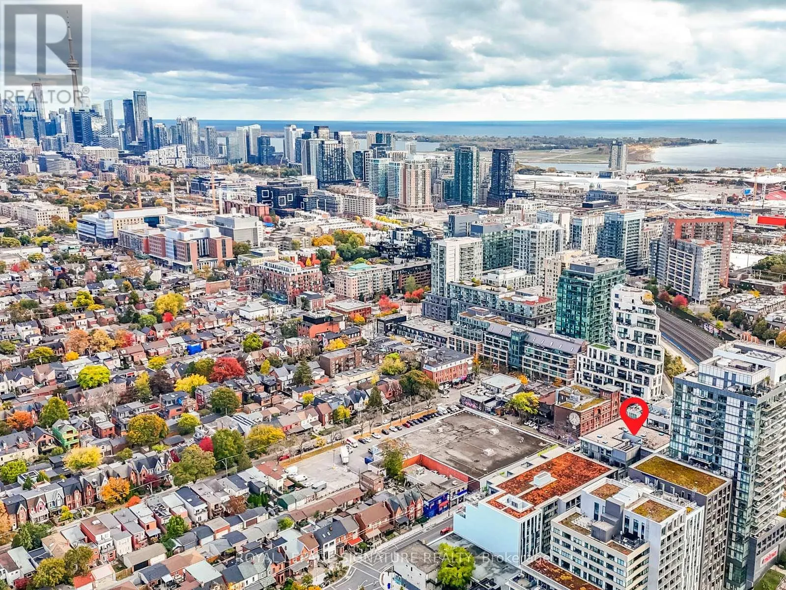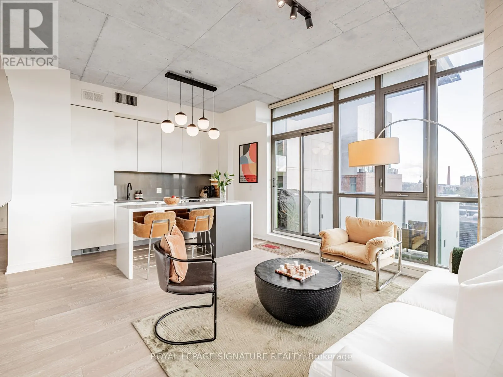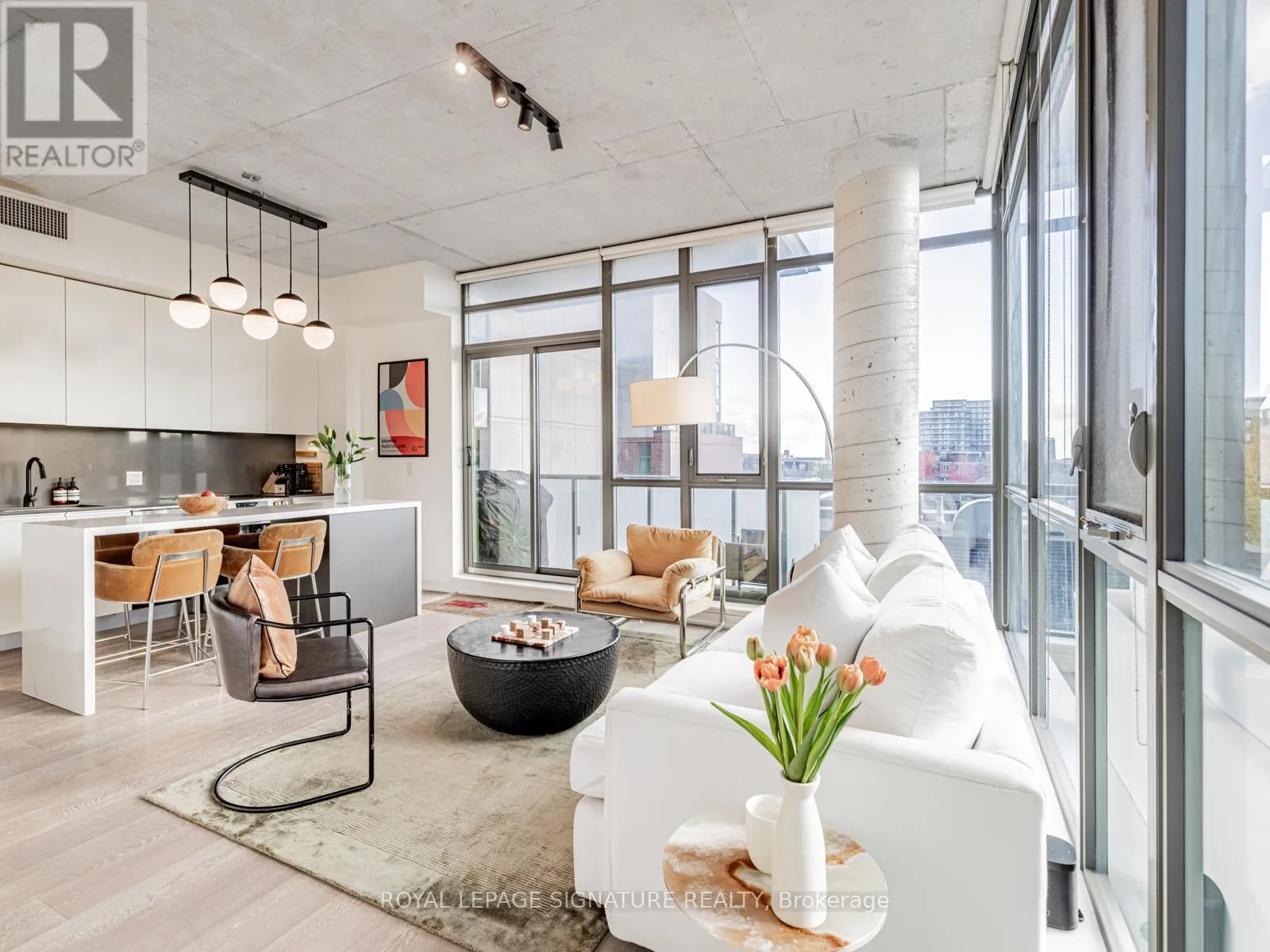 Cross Streets: Queen St West & Gladstone Ave. ** Directions: Across from the Gladstone Hotel. This bright, southwest-facing corner loft is a true gem in the heart of Queen West. Floor-to-ceiling windows fill the home with natural light and golden-hour warmth, framing sunset views over the tree-lined horizon and Liberty Village's heritage rooftops. The functional 850 sq. ft. layout leaves no wasted space, featuring a wide entry hallway with custom wainscoting, a split two-bedroom plan for privacy, and an open-concept kitchen, dining, and living area accented by concrete ceilings and hardwood floors throughout. Thoughtful upgrades - including quartz counters, designer lighting, new appliances, and fresh paint - add style and comfort. The second bedroom offers versatility as a home office, guest room, or kids' room, while ensuite laundry and a locker complete this thoughtfully designed suite with convenient additional storage. A gas line on the balcony makes summer entertaining effortless. Set within an intimate boutique building in one of Toronto's most dynamic neighbourhoods, you're steps from cafés, shops, and parks, and just minutes to the Ossington Strip, the waterfront, and the Gardiner Expressway. It's the perfect blend of charm and urban accessibility - peaceful, practical, and connected to everything the city has to offer, where style meets convenience. Make it yours (id:27476)