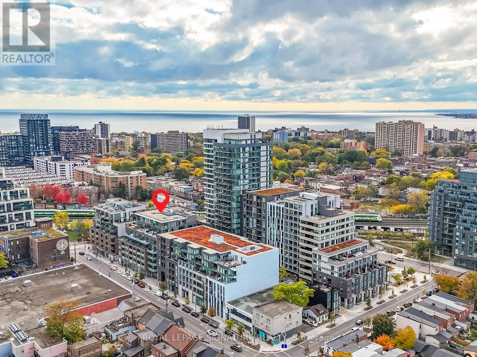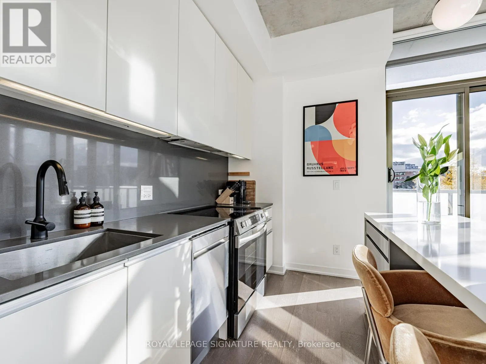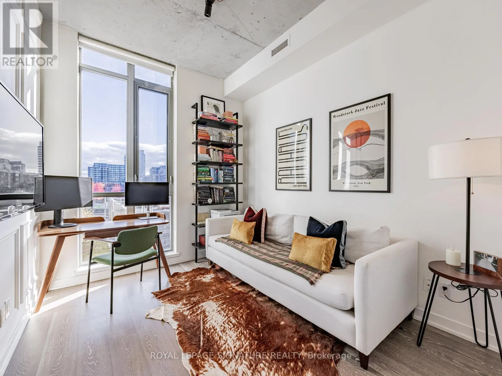 Cross Streets: Queen St West & Gladstone Ave. ** Directions: Across from the Gladstone Hotel. This bright, southwest-facing corner loft is a true gem in the heart of Queen West. Floor-to-ceiling windows fill the home with natural light and golden-hour warmth, framing sunset views over the tree-lined horizon and Liberty Village's heritage rooftops. The functional 850 sq. ft. layout leaves no wasted space, featuring a wide entry hallway with custom wainscoting, a split two-bedroom plan for privacy, and an open-concept kitchen, dining, and living area accented by concrete ceilings and hardwood floors throughout. Thoughtful upgrades - including quartz counters, designer lighting, new appliances, and fresh paint - add style and comfort. The second bedroom offers versatility as a home office, guest room, or kids' room, while ensuite laundry and a locker complete this thoughtfully designed suite with convenient additional storage. A gas line on the balcony makes summer entertaining effortless. Set within an intimate boutique building in one of Toronto's most dynamic neighbourhoods, you're steps from cafés, shops, and parks, and just minutes to the Ossington Strip, the waterfront, and the Gardiner Expressway. It's the perfect blend of charm and urban accessibility - peaceful, practical, and connected to everything the city has to offer, where style meets convenience. Make it yours (id:27476)