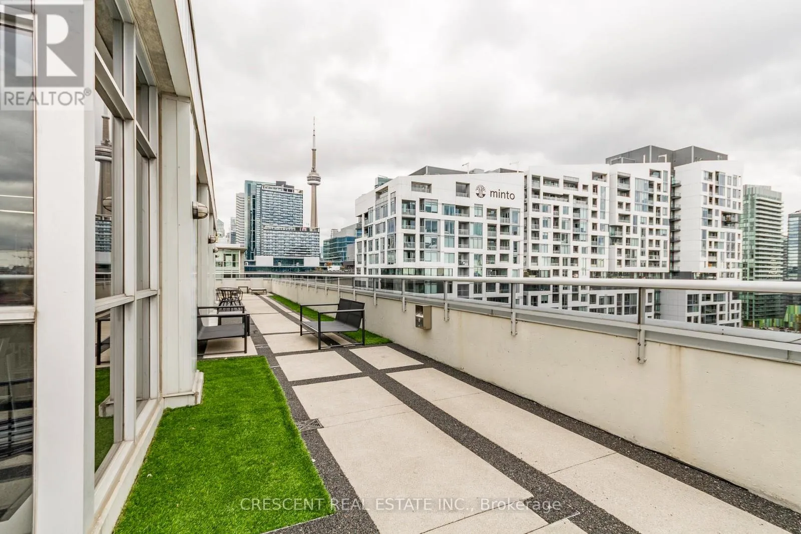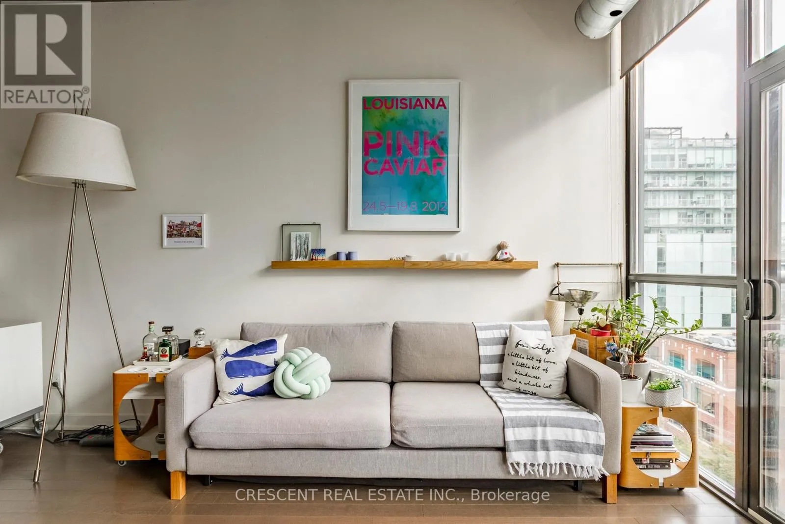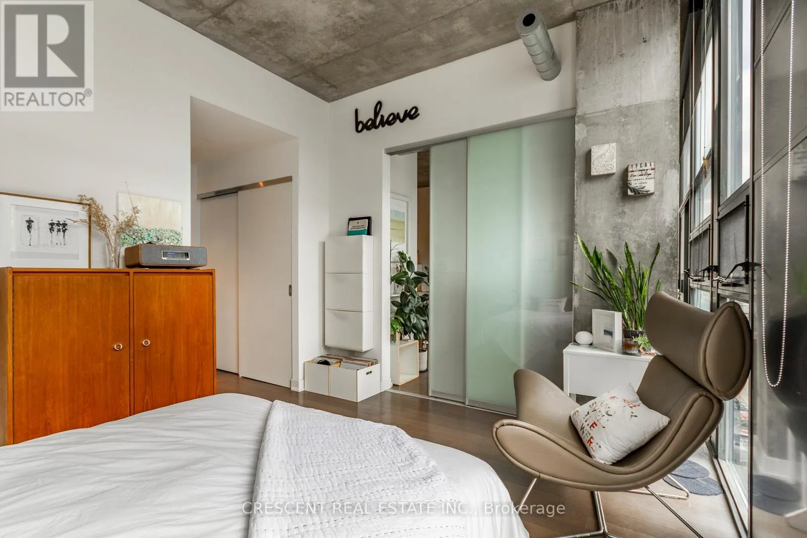 Cross Streets: Bathurst & Front. ** Directions: West of Bathurst off Wellington. * Sophisticated Furnished Loft in the Heart of King West * Experience urban living at its finest in this stunning loft located in an intimate boutique building in Toronto's most coveted King West neighbourhood. This generous 880 sq ft residence features soaring 10-foot ceilings and an intelligently designed layout that includes one spacious bedroom plus a large den - perfect for a home office, guest room, or creative space. The open-concept living, dining, and kitchen area creates an ideal entertaining space flooded with natural light, complemented by a charming Juliet balcony.The unit boasts a newly renovated bathroom and the convenience of in-suite laundry. This turnkey loft comes completely furnished with everything needed for comfortable living, allowing you to simply arrive and settle in. Located on the prime 8th floor with excellent views, you'll be steps away from King West's renowned restaurants, galleries, cafes, and nightlife, with easy access to transit and major highways. Available fully furnished for flexible short-term stays with a minimum lease of 6 months and longer. (id:27476)