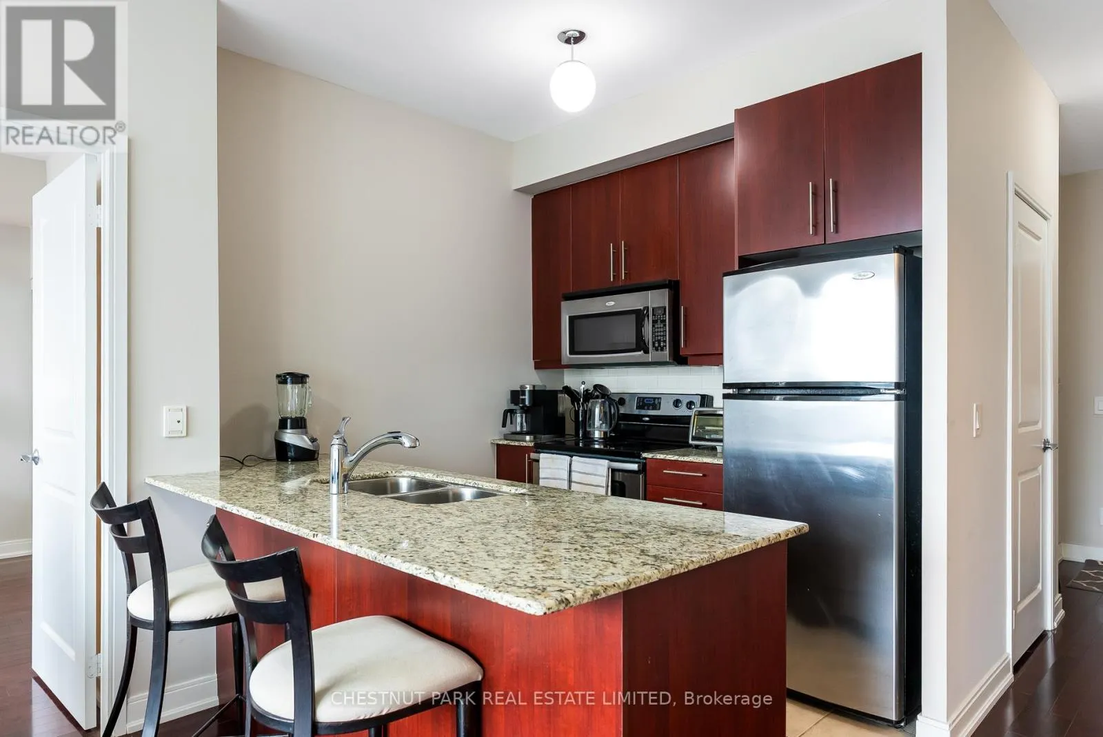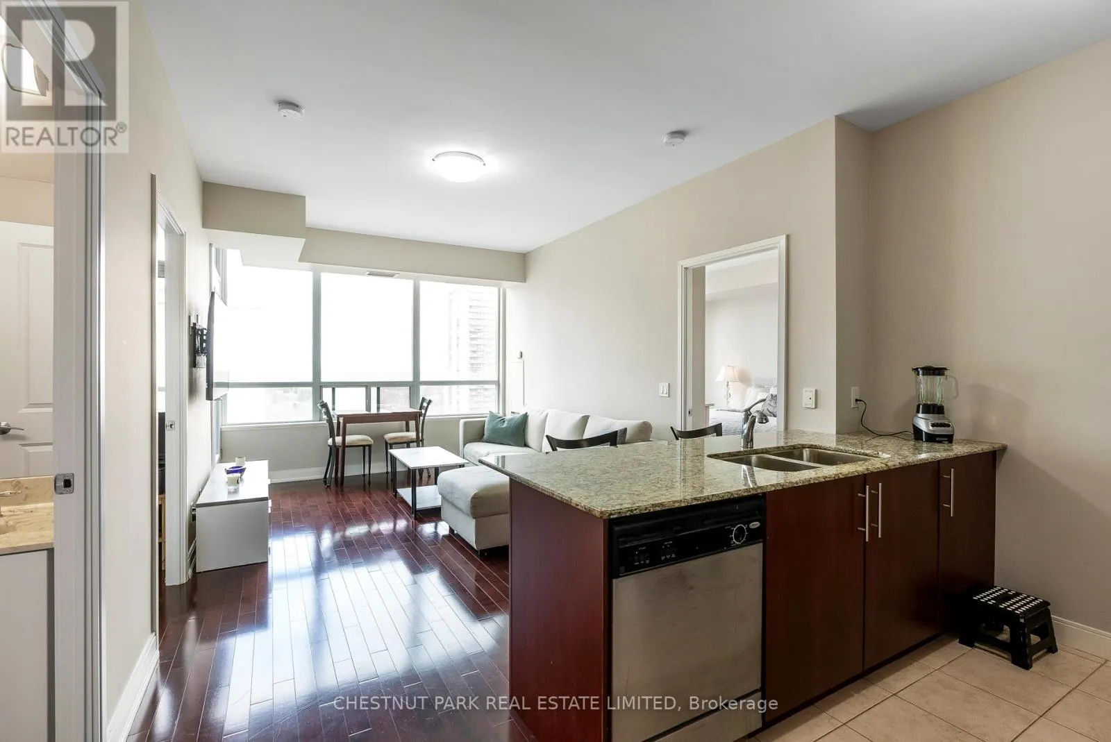 Yonge / Eglinton Welcome to this perfect two-bedroom, two-bathroom split-plan apartment at Yonge & Eglinton. Tucked away out of the hustle & bustle of the area but still close enough to walk to everything your heart desires. This apartment is efficient and has everything you need. As you enter the nine-foot ceilings, a large coat closet and spacious hallway to feature art greet you with a sightline through to the large North-facing window with unobstructed views. The kitchen features stainless steel appliances, granite countertops, tile floor and large island with plenty of counter space. The living room is open to the kitchen and separates the two bedrooms. The primary bedroom has a large ensuite and the bedroom itself is big enough for a king-sized bed allowing for space around the bed. The secondary bedroom is multi-functional and could be used as an office or guest bedroom. It has access to the balcony via sliding door. This bedroom is next to the second full bathroom for ease of use by guests. One owned parking included. (id:27476)
